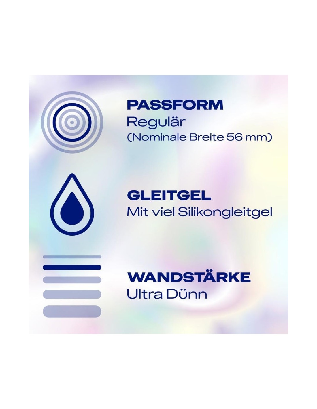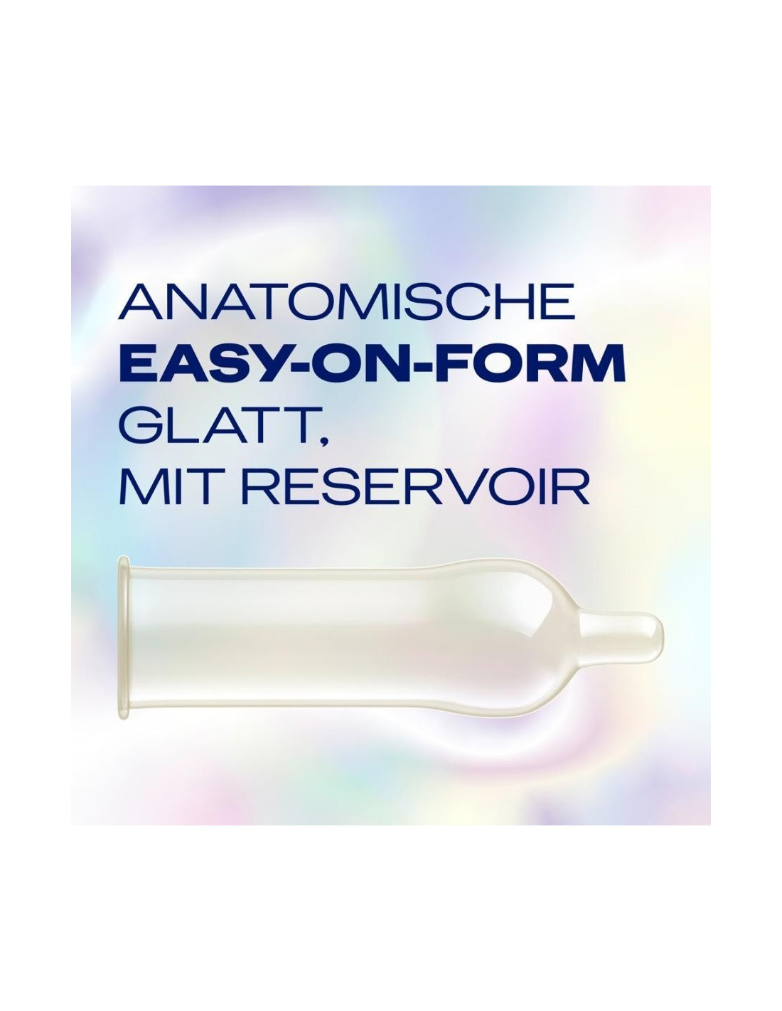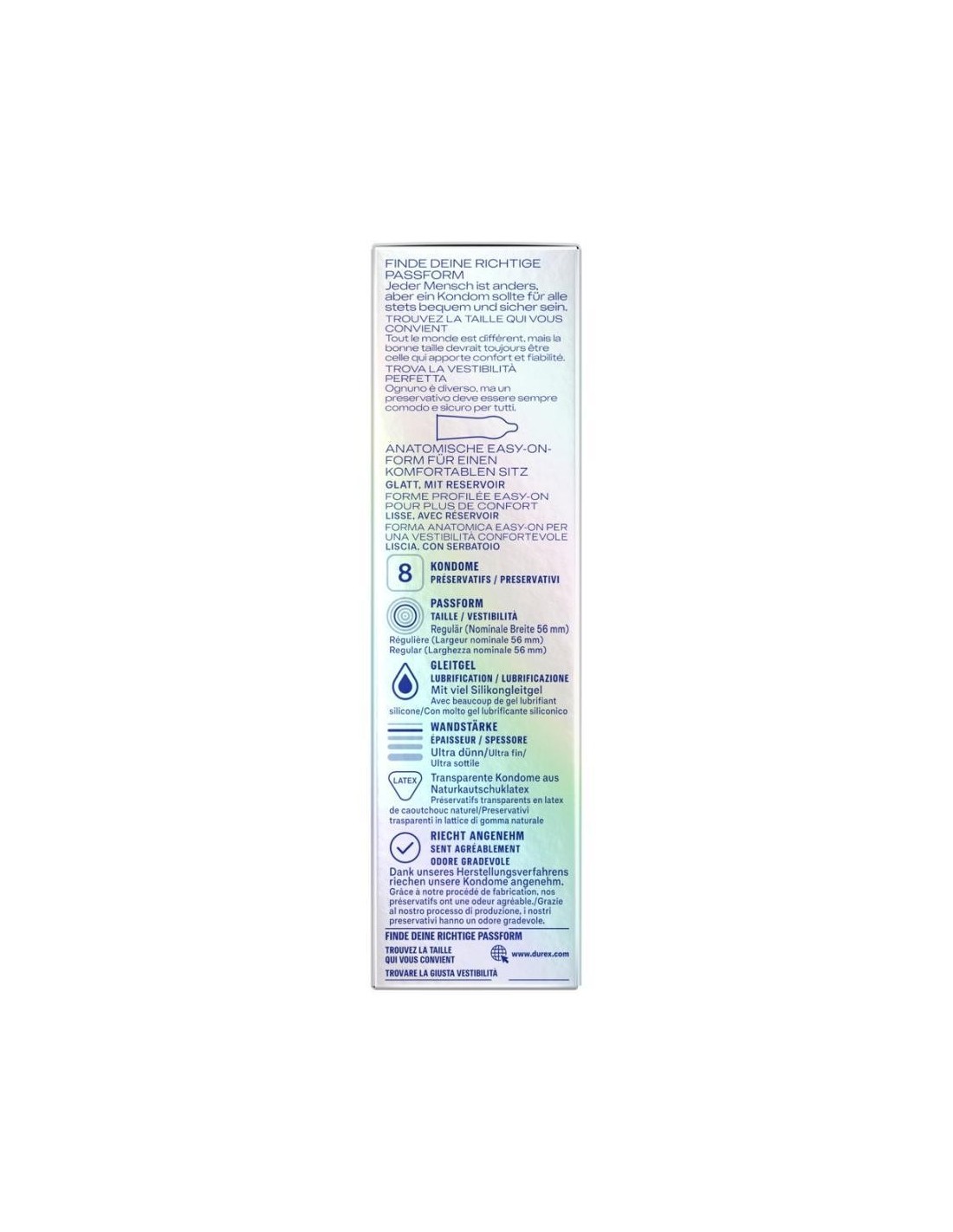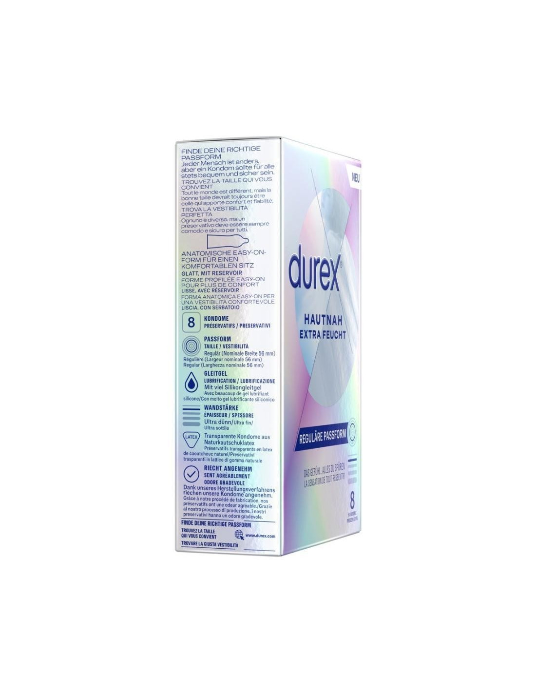 Preservativi trasparenti in lattice naturale Durex Hautnah Extra Moist con pareti ultrasottili e idratati con lubrificante extra al silicone per una sensazione di massima scorrevolezza. Rispetto ai profilattici cilindrici tradizionali, l'innovativa forma anatomica Easy-on dei profilattici Durex offre un po' più di spazio nei punti giusti, rendendoli più facili da indossare e sfilare e garantendo una vestibilità confortevole e sensazioni intense.
