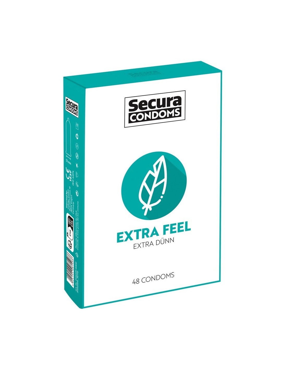 Preservativi trasparenti e setosi Extra Feel di Secura Condoms con pareti extra sottili per una sensazione naturale e pura. Con rivestimento idratante e serbatoio a base di silicone. Vegan-friendly. Inodore e insapore.