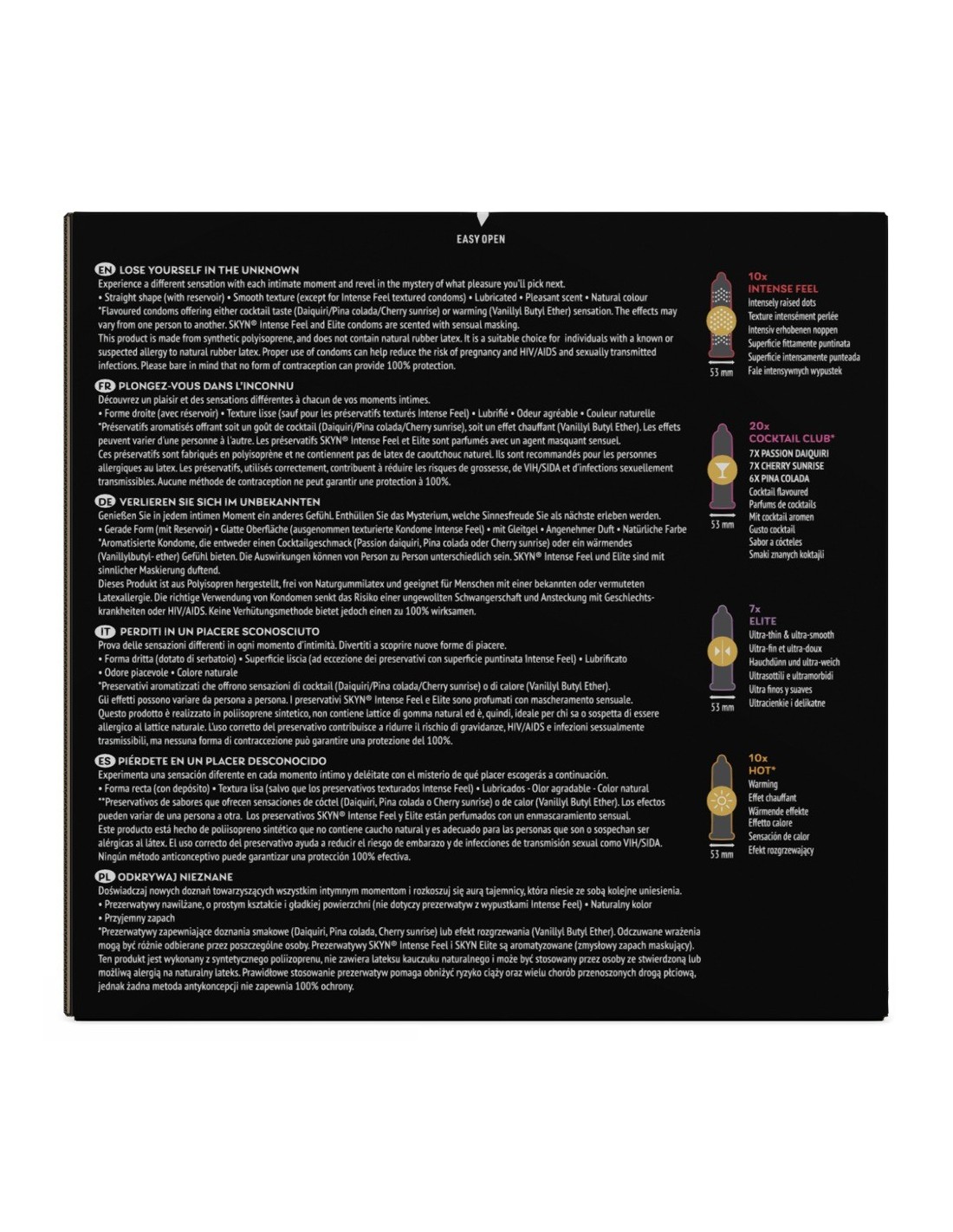 Miscela di preservativi Unknown Pleasures 42+5free di SKYN con un totale di 47 preservativi diversi: