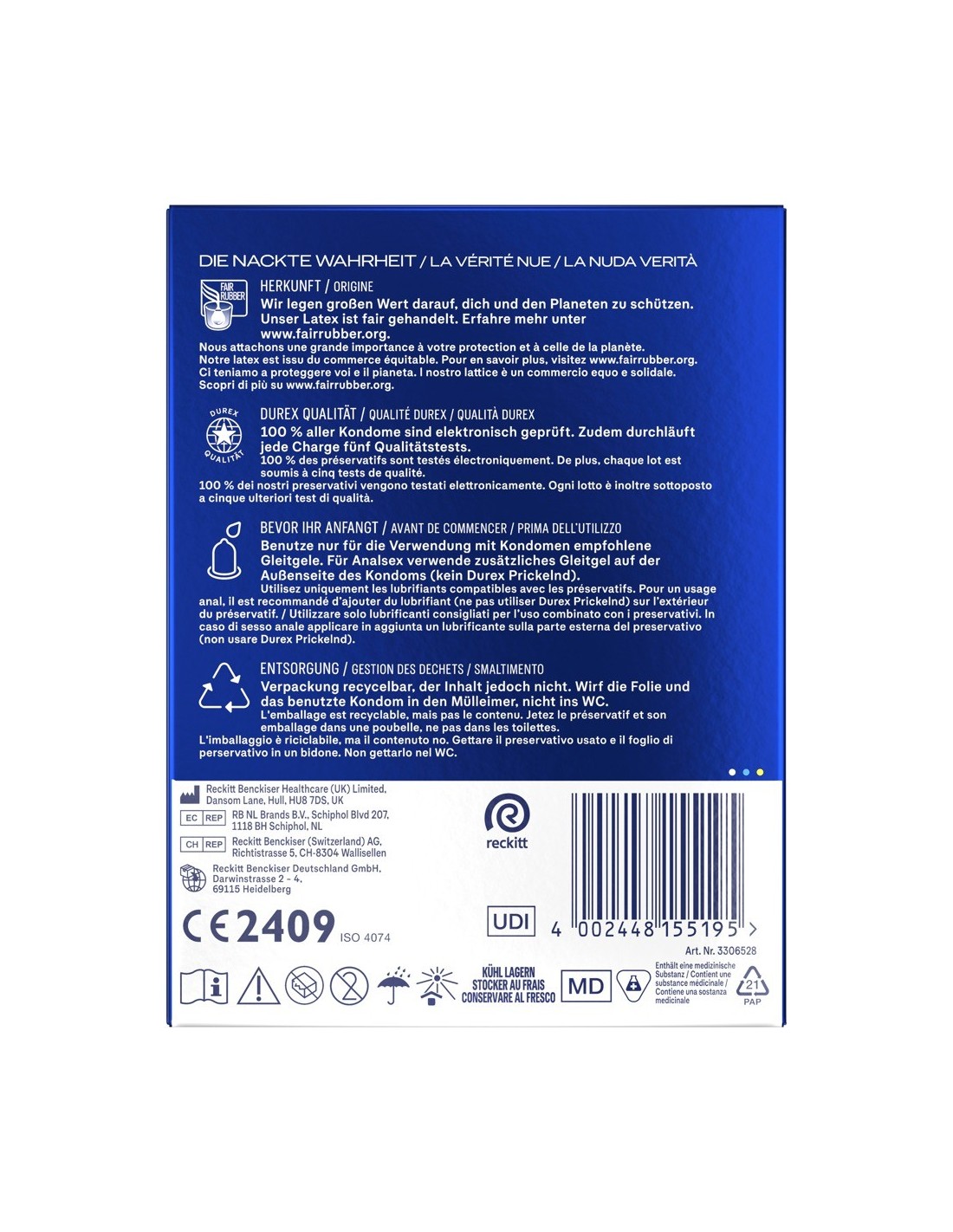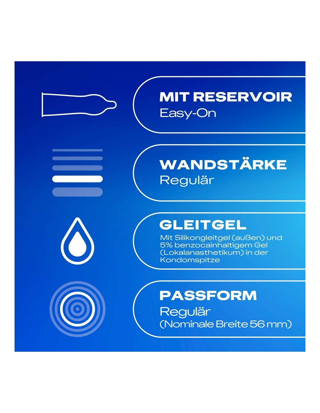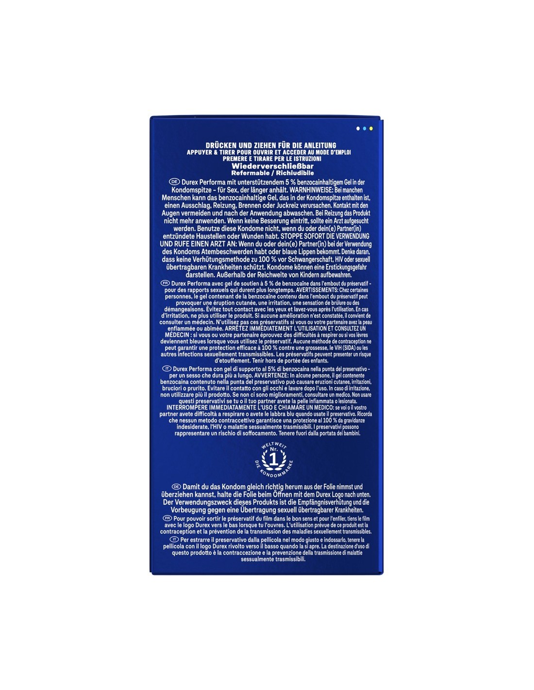 Preservativi trasparenti Performa di Durex con gel di benzocaina al 5% nella punta del preservativo, che può aiutare a ritardare il climax e a prolungare la fase di eccitazione. Idratati con lubrificante al silicone. Rispetto ai profilattici cilindrici tradizionali, l'innovativa forma anatomica Easy-on offre un po' più di spazio nei punti giusti, per un'applicazione e uno srotolamento più facili e una vestibilità confortevole.