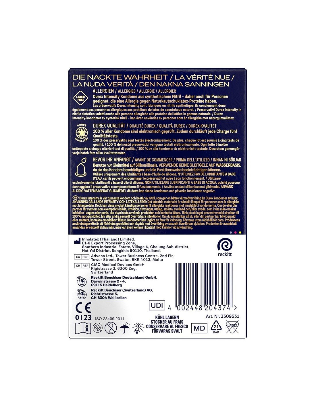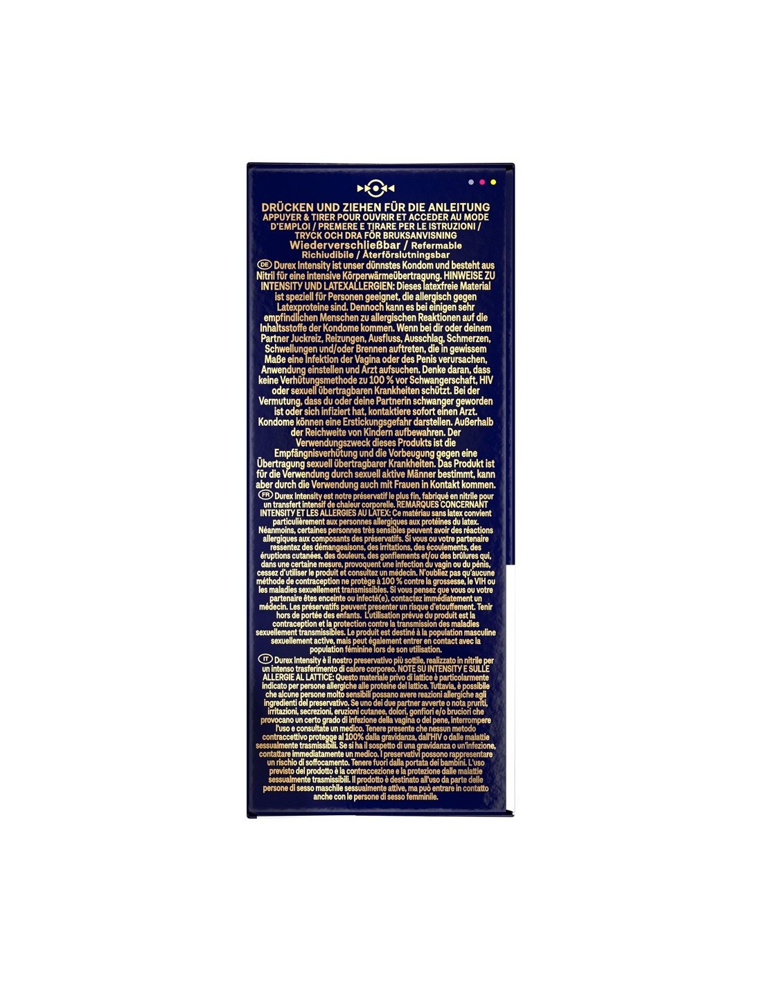 I preservativi Intensity di Durex, ultrasottili e privi di lattice, sono realizzati in nitrile per un'intensa trasmissione del calore corporeo e la sensazione di sentire solo il partner. Inumiditi con abbondante lubrificante al silicone. Trasparenti, di forma diritta, con serbatoio.
