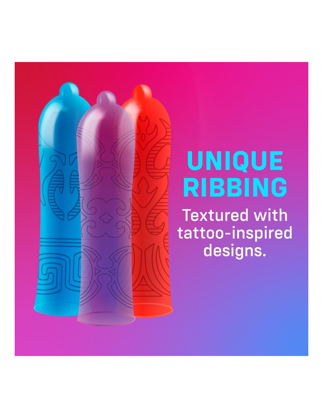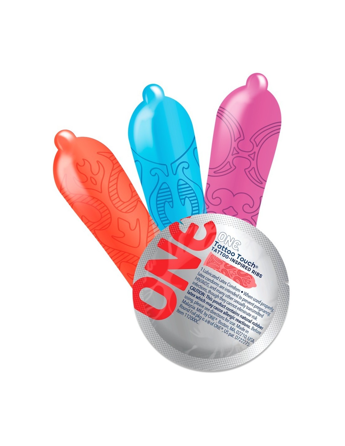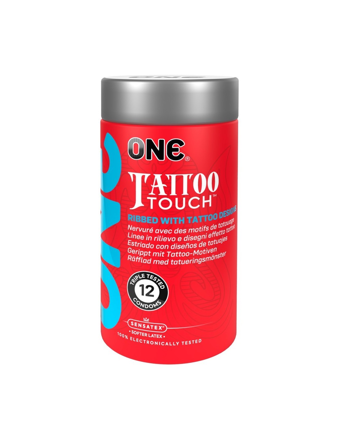 I preservativi colorati Tattoo Touch di ONE combinano una superficie strutturata con uno speciale disegno a tatuaggio. Le grandi strutture a coste non solo attirano l'attenzione, ma forniscono anche una stimolazione aggiuntiva. La forma sagomata con serbatoio assicura una vestibilità comoda e sicura - il morbidissimo lattice di gomma naturale Sensatex fornisce una sensazione di piacere naturale. Produzione vegana e senza OGM. Idratato con olio di silicone.