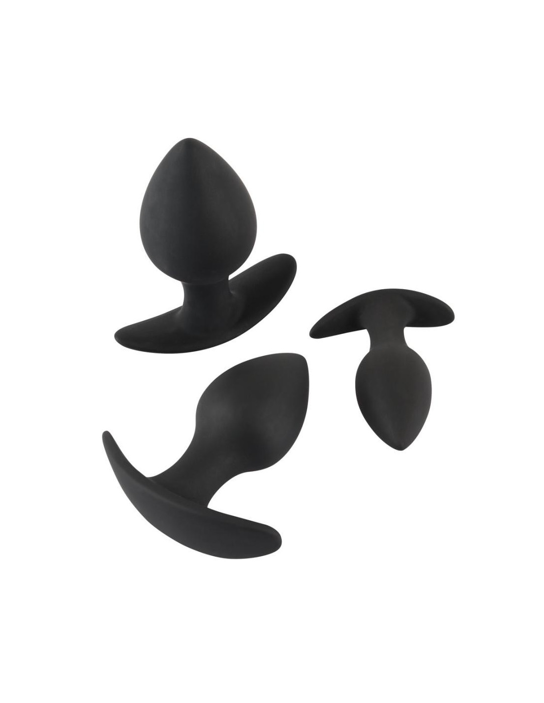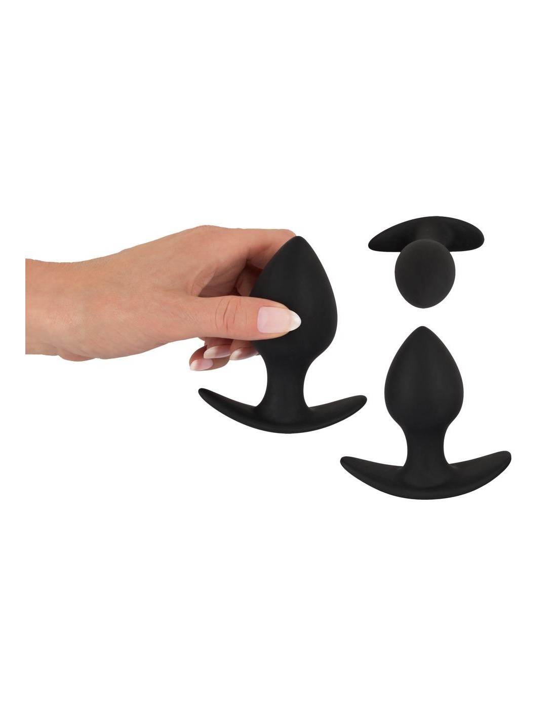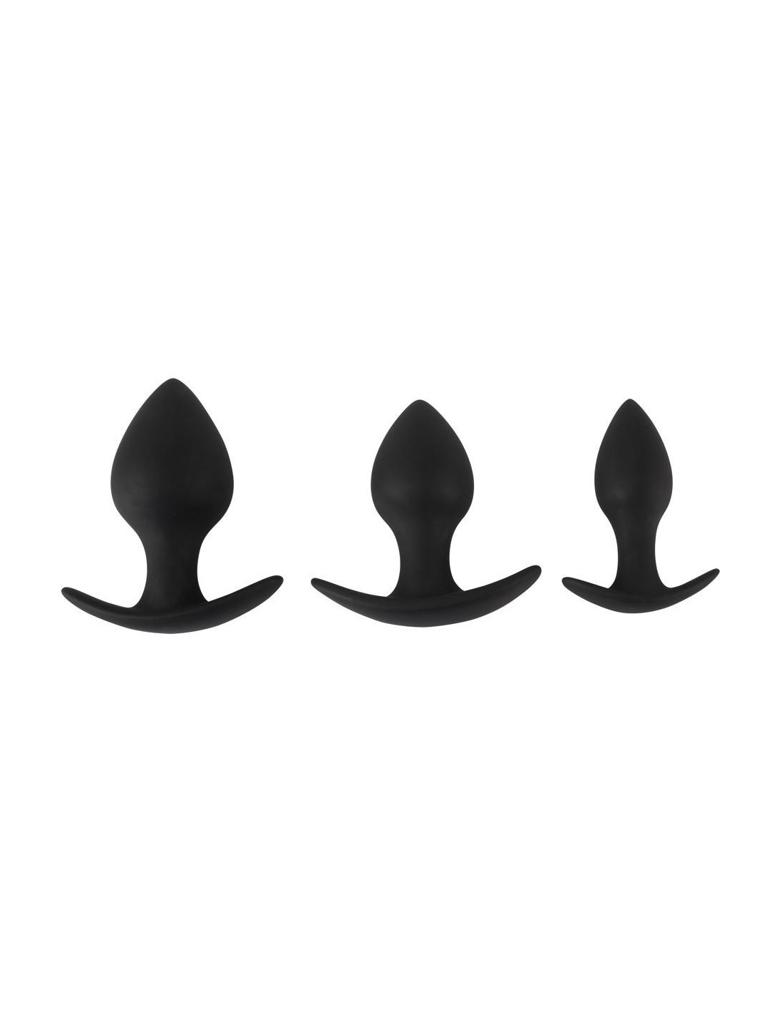Set di tappi anale in 3 pezzi con struttura piacevolmente morbida. Le diverse misure sono perfette per un allenamento anale graduale. Grazie alla loro forma conica, gli spinotti sono particolarmente facili da inserire e offrono una piacevole sensazione di pienezza. Con base extra larga per una presa sicura e una facile manipolazione.