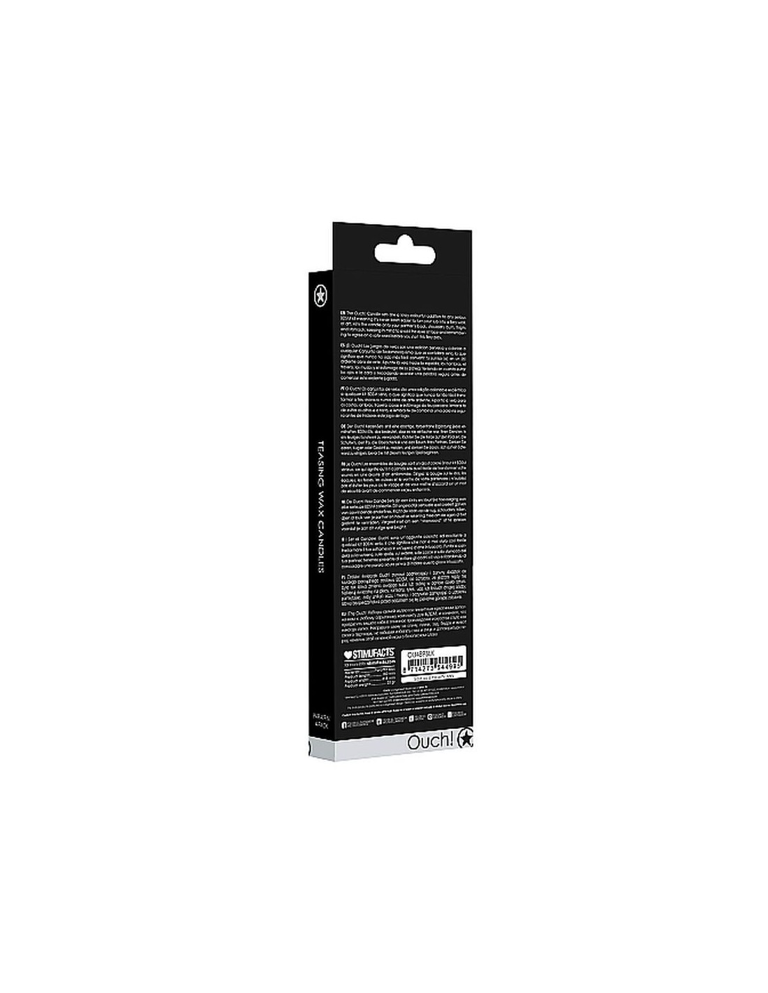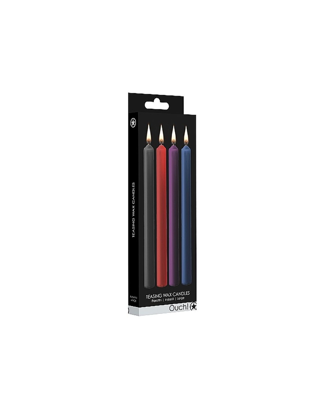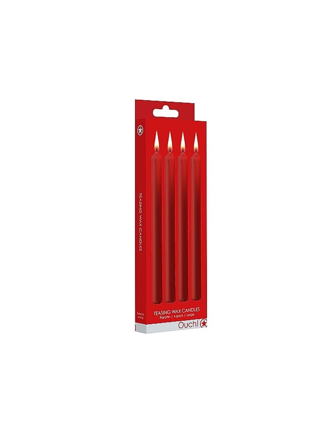 Teasing Wax Candles Large - Parafin - 4-pack - Red I Set di Candele Ouch! sono un'aggiunta colorata ed eccitante a qualsiasi kit BDSM serio, il che significa che non è mai stato così facile trasformare il tuo sottomesso in un'opera d'arte infuocata. Punta la candela sulla schiena, sulle spalle, sul sedere, sulle cosce e sullo stomaco del tuo partner; tenendo presente di evitare gli occhi o il viso e ricordando di concordare una parola sicura prima di iniziare questo gioco infuocato. Dimensioni imballaggio: 21 x 7 x 2 cm Peso imballaggio: 140 gram Misure Prodotto: 18 x 1,8 x 1,8 cm Peso Prodotto: 30 gram Specifiche; Il liquido contiene oli che possono danneggiare preservativi e giocattoli (lattice). Non lasciare mai una candela accesa incustodita! Spegni la candela prima di far gocciolare l'olio dalla candela. In caso di irritazione, interrompere l'uso. Tenere fuori dalla portata di bambini e animali domestici. Tempo di combustione: 4,5 ore per candela Materiale: Paraffin Wax