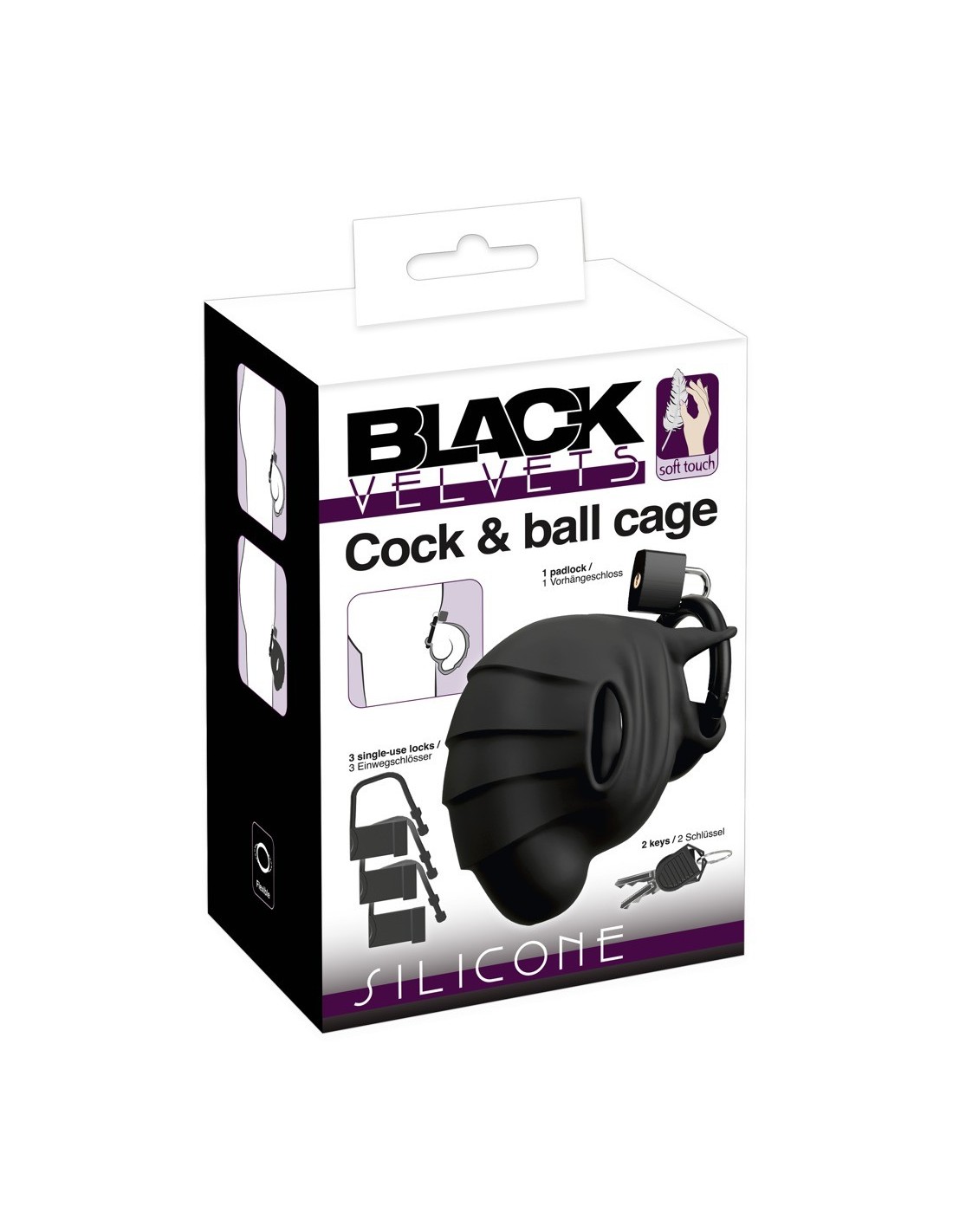 La gabbia di castità in silicone Cock & ball cage di Black Velvets racchiude il pene e i testicoli in modo eccitante. Perfettamente adattata all'anatomia maschile, la gabbia flessibile è facile da indossare e da togliere. Il silicone morbido e vellutato si adatta perfettamente e comodamente. Un anello rigido tiene la gabbia in silicone leggero saldamente in posizione. La minzione è possibile attraverso un'apertura inferiore. La gabbia per pene/testicoli può essere chiusa a chiave: sono inclusi 1 lucchetto con chiavi e 3 lucchetti monouso.