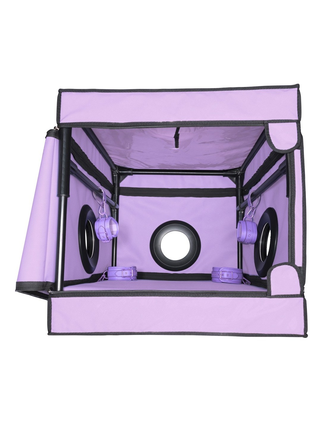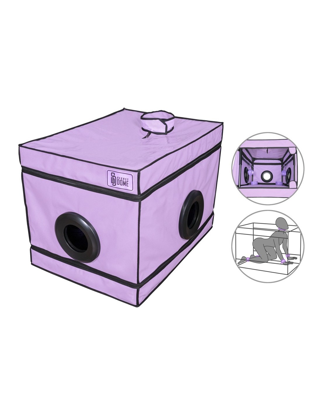 Cabina BDSM chiusa La Niche di Secret Dome per giochi glory hole, giochi dark, giochi di ruolo accattivanti e altre fantasie. La robusta cabina è veloce da montare e pronta per l'uso grazie al suo sistema tubolare a innesto e al robusto telone. Con 3 grandi aperture laterali. L'apertura per la testa è dotata di una cerniera e di un ampio collare regolabile. Comodo accesso tramite porta con cerniera. Una luce a LED e un morbido tappetino garantiscono un maggiore comfort. Le manette e le cavigliere in dotazione (1 paio ciascuna) possono essere posizionate all'interno a seconda delle esigenze. Le morbide manette imbottite possono essere indossate e regolate rapidamente grazie alle fibbie.