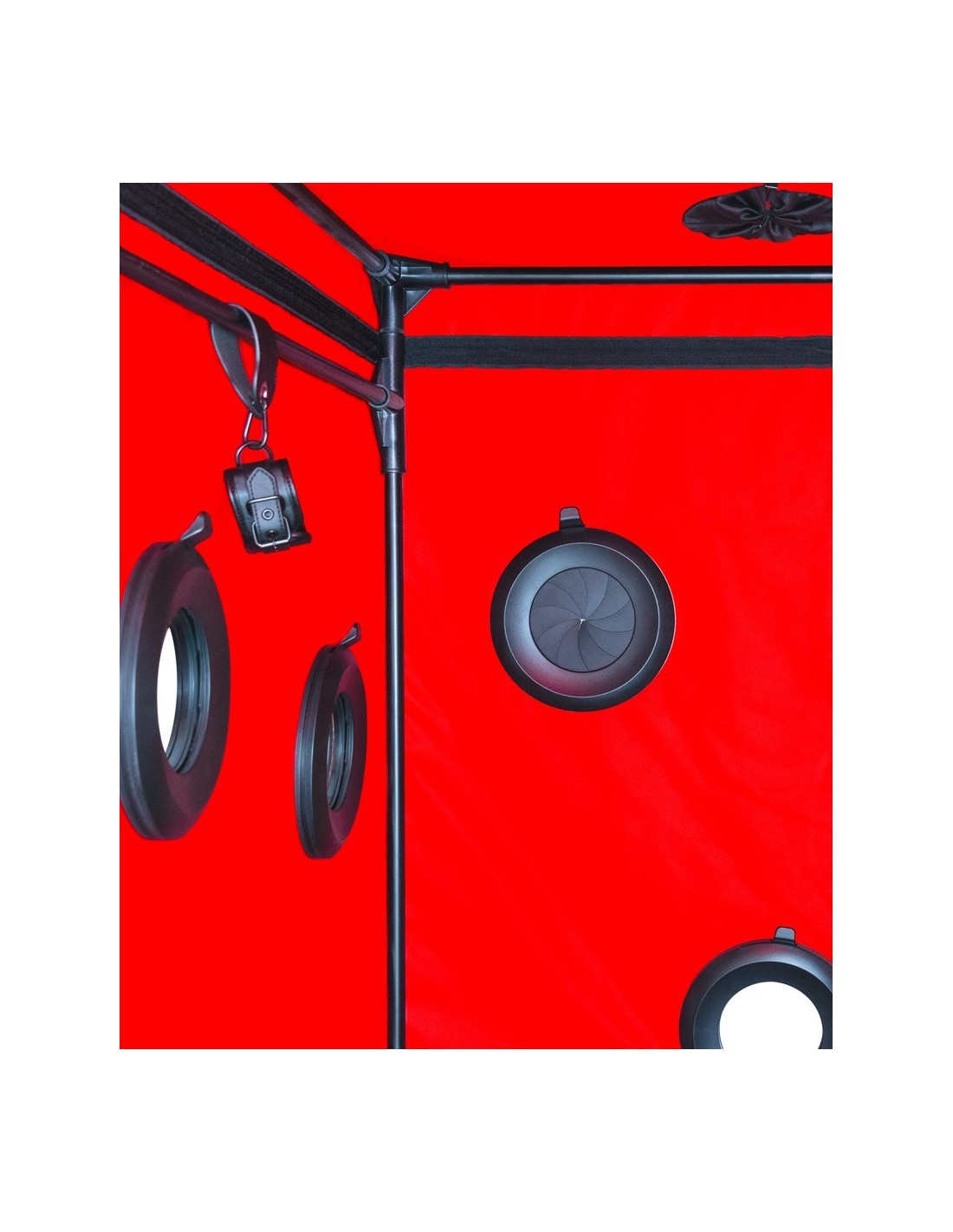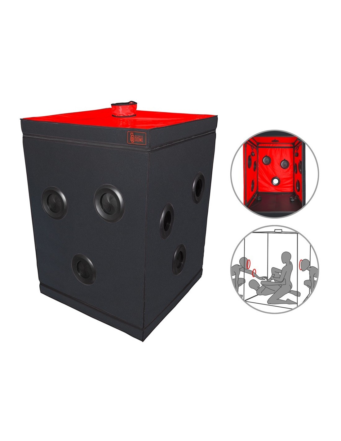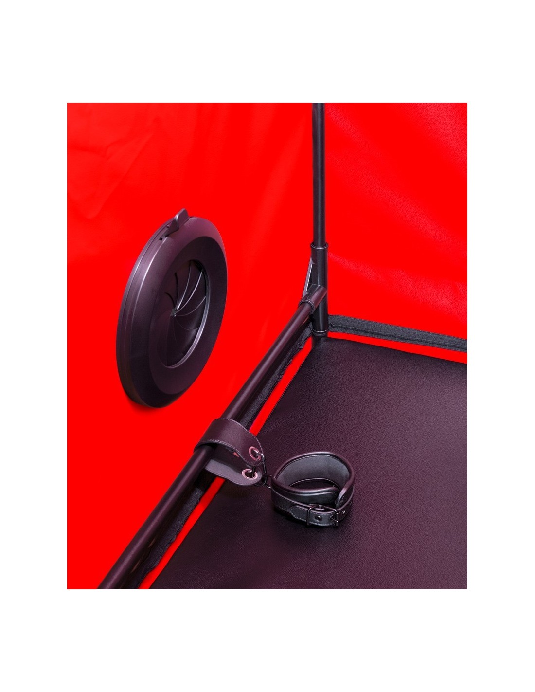 Cabina BDSM chiusa Scandale di Secret Dome per giochi glory hole, giochi dark, giochi di ruolo accattivanti e altre fantasie. La robusta cabina, con il suo sistema di innesto tubolare e il robusto telone opaco, è rapida da montare e pronta all'uso. L'apertura per la testa è dotata di una cerniera e di un ampio collare regolabile. Un totale di 9 grandi aperture (3 per lato) possono essere chiuse completamente con pannelli. Comodo accesso laterale con porta a zip. 2 ventilatori e l'illuminazione a LED assicurano una ventilazione e una luce ottimali nella cabina, altrimenti completamente buia. Tappetino morbido per un maggiore comfort. Le manette e le cavigliere in dotazione (1 paio ciascuna) possono essere posizionate all'interno a piacere. Le morbide manette imbottite possono essere indossate e regolate rapidamente grazie alle fibbie.