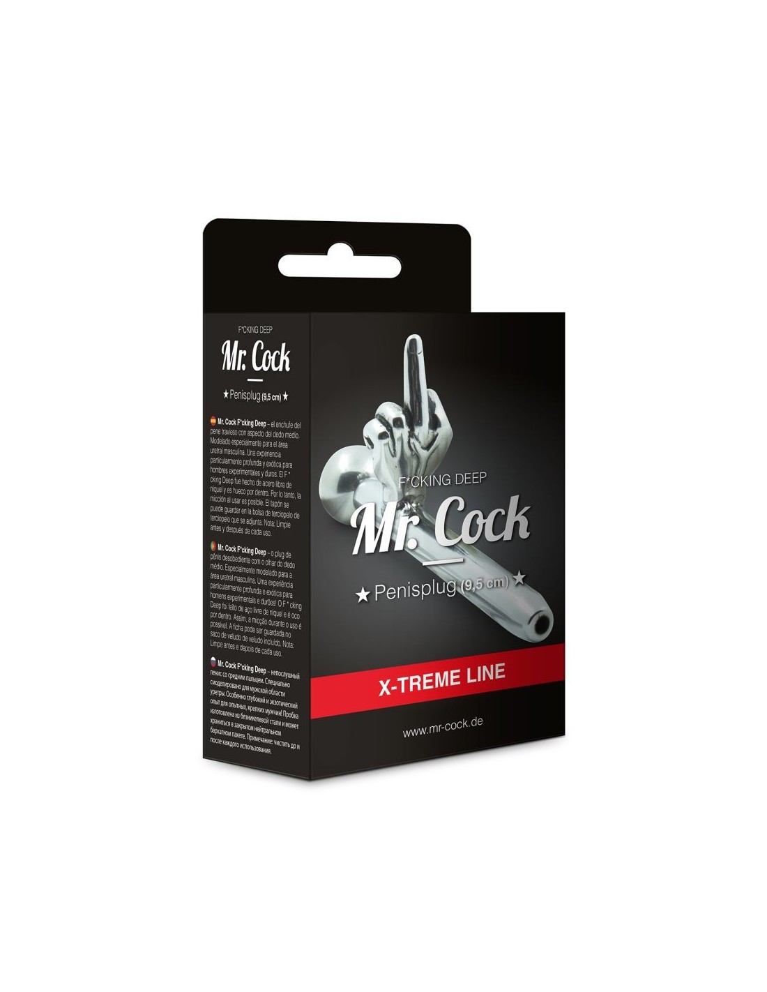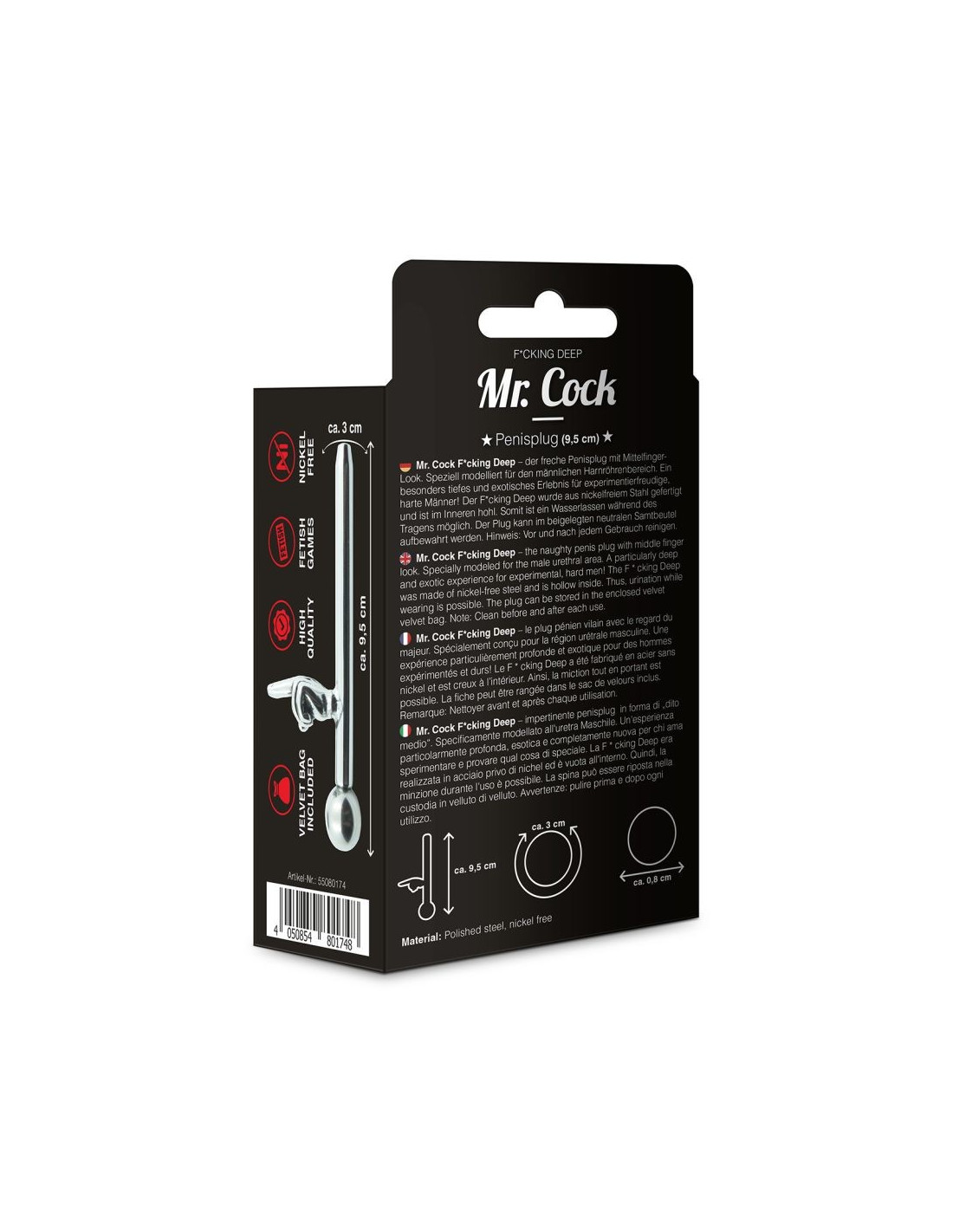 Mr. Cock F*cking Deep - Il plug per il pene con il look del dito medio. Modellato appositamente per l'area uretrale maschile. Un'esperienza particolarmente profonda ed esotica per uomini che vogliono provare un'esperienza diversa! F*cking Deep è stato realizzato in acciaio privo di nichel ed è cavo all'interno. Pertanto, la minzione durante l'uso è possibile. La spina può essere riposta nella custodia in velluto inclusa. Nota: pulire prima e dopo ogni utilizzo. Lunghezza: circa 9,5 cm Diametro: circa 0,8 cm Materiale: acciaio lucido, senza nichel