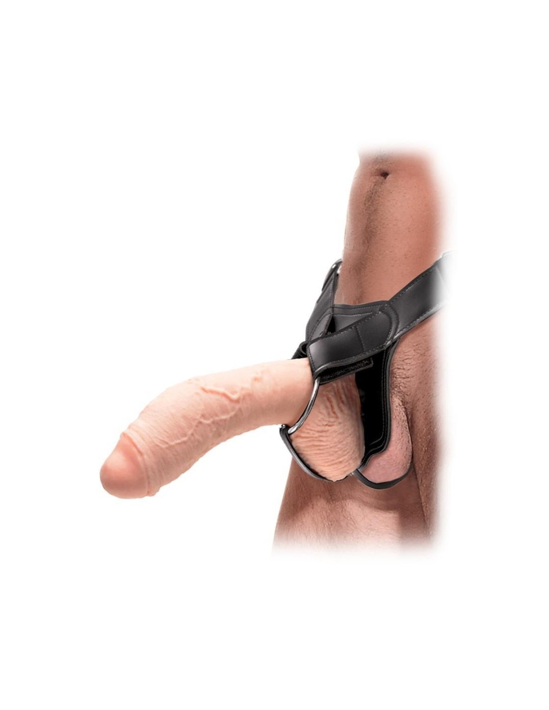 Dildo naturale cavo con testicoli sporgenti e cinturino elastico. Indossato sul pene per più lunghezza e circonferenza o per l'ancoraggio del sesso bollente. Cinturino regolabile.