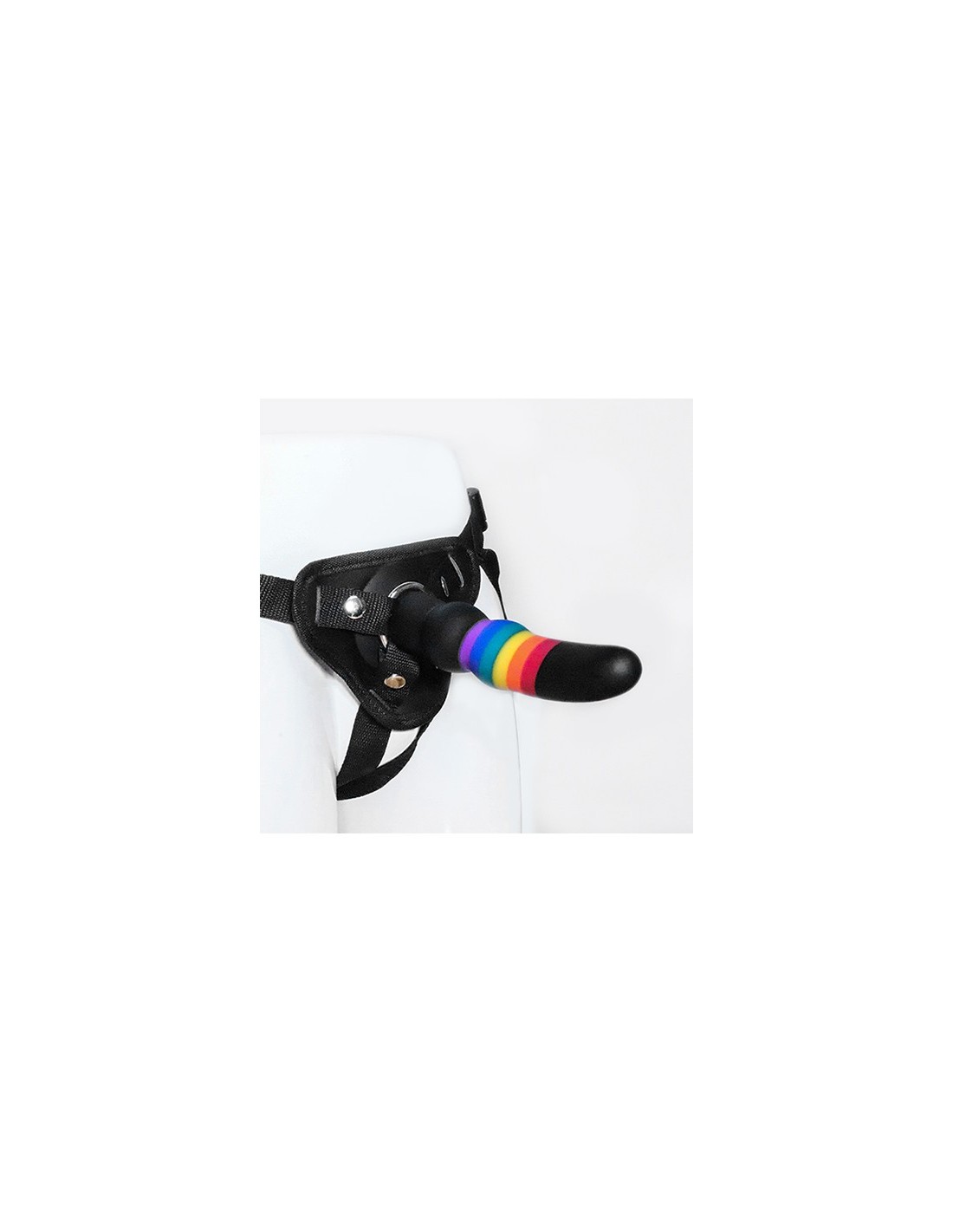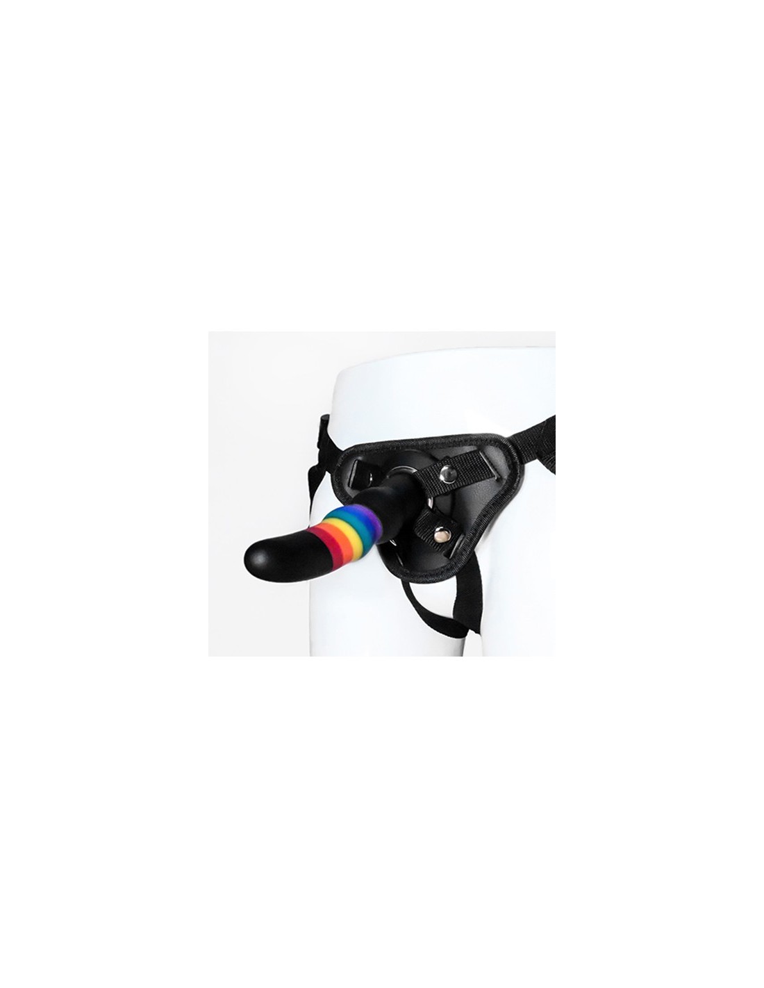 This Essentials Dildo is made of silicone, which is soft to the touch and phthalate free, with bright Pride rainbow colours combined with black. The wide base is perfect to keep the dildo firmly in place in the included strap-on harness. It can be easily attached to the harness with the snap buttons and the metal ring. The harness can be adjusted to fit the body size. ,