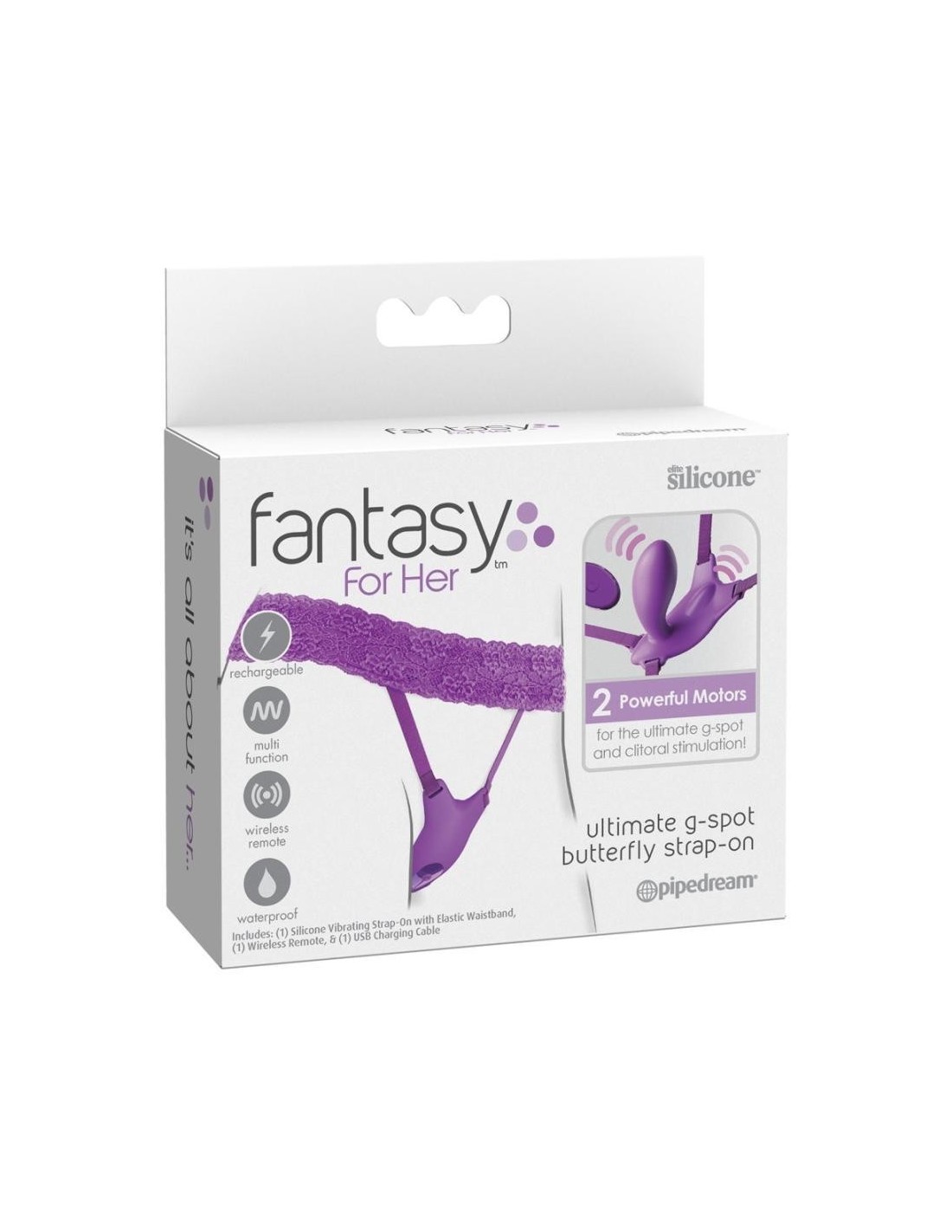 Indossa lo strap-on Ultimate G-Spot Butterfly a doppio motore di Fantasy For Her per essere coccolata intimamente da potenti vibrazioni. Completamente discreto, nessuno si accorge del piccolo segreto del piacere! Il vibratore in silicone, leggero e dalla forma anatomica perfetta, è saldamente integrato nel perizoma elasticizzato e stimola contemporaneamente la zona G vaginale, il clitoride e le labbra della vulva.