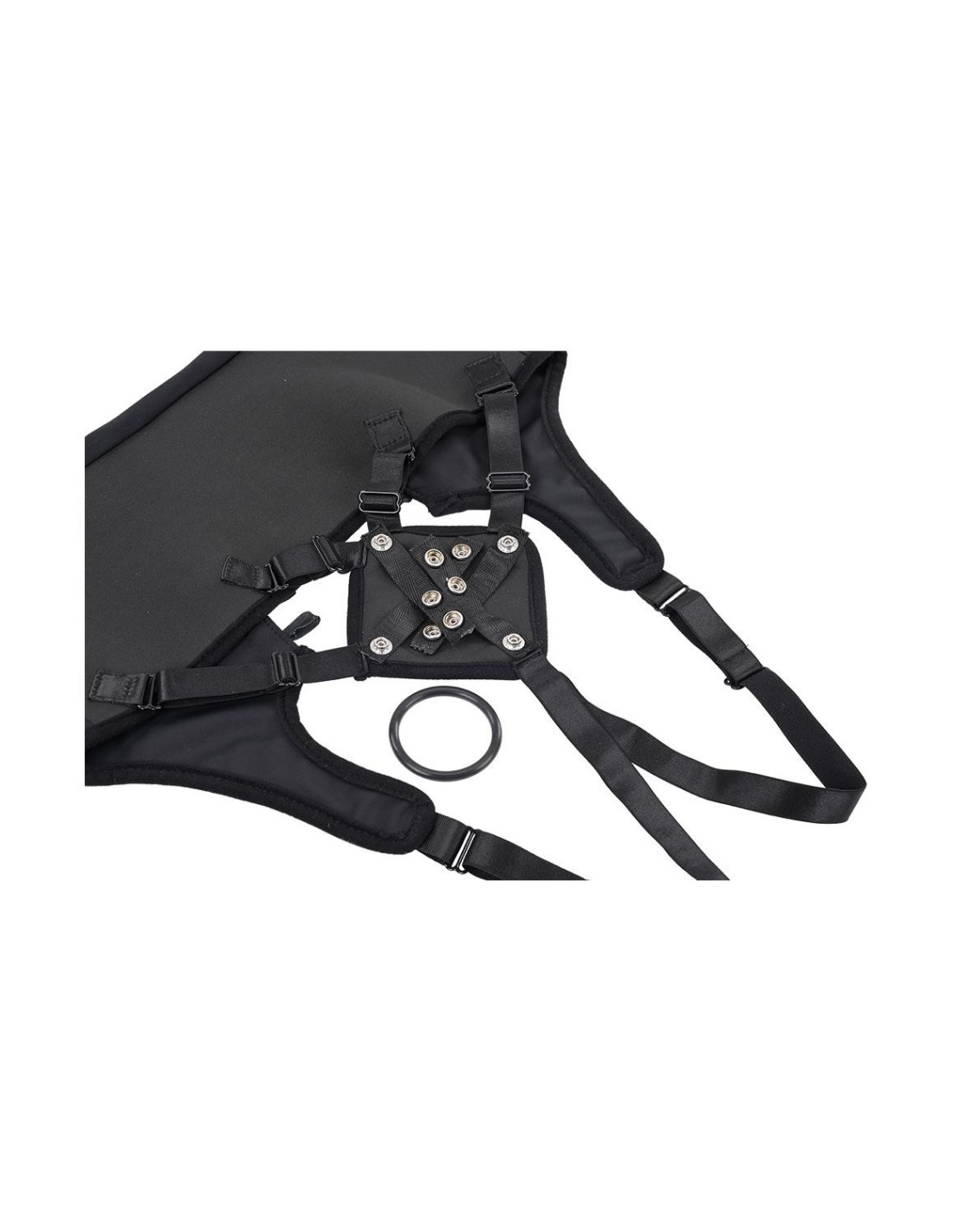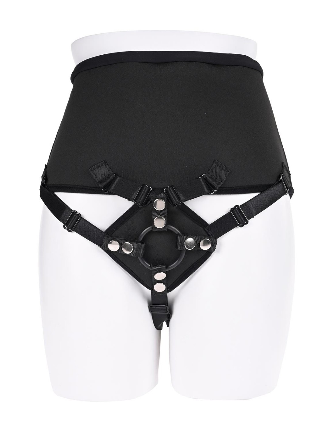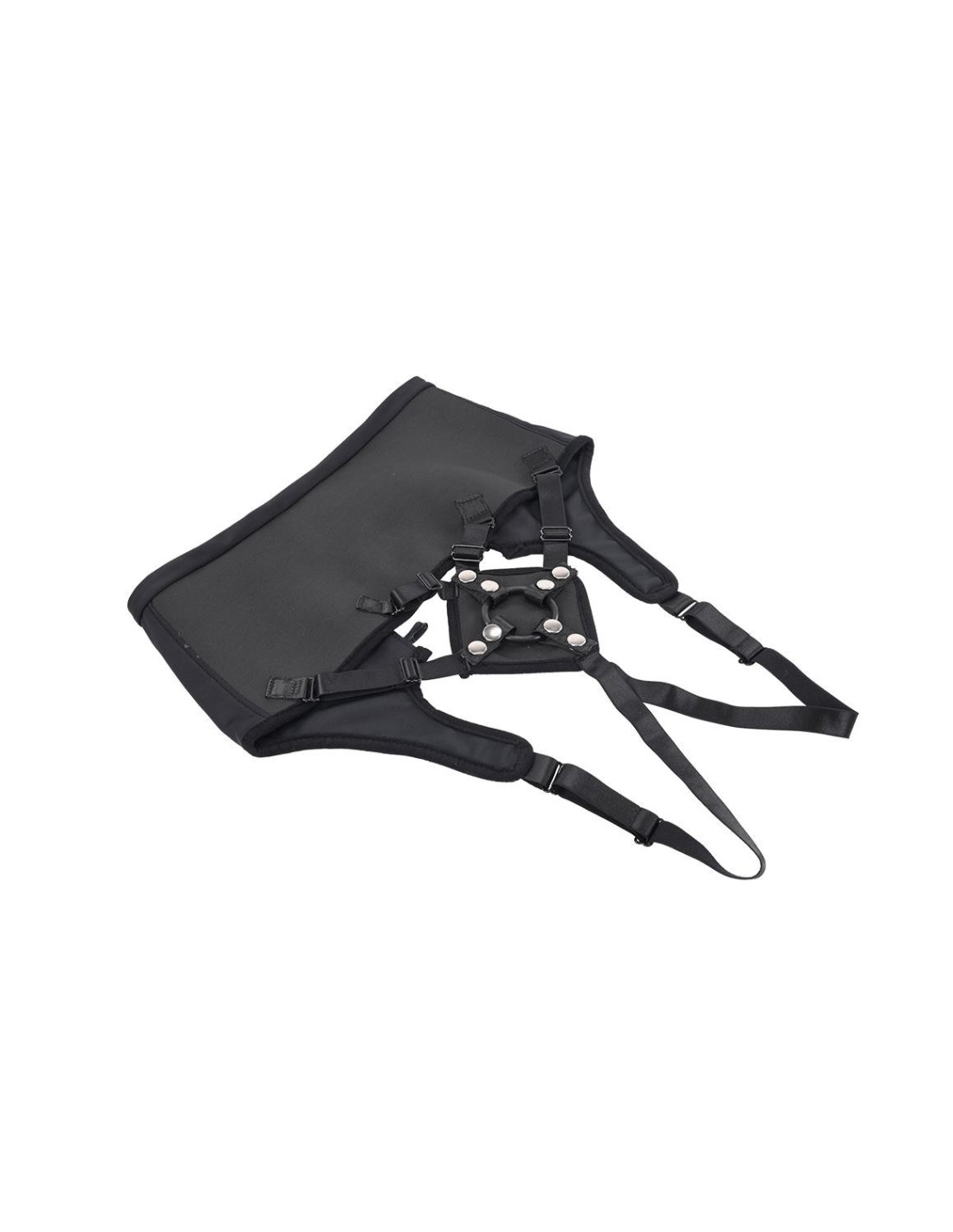 - Six adjustable elastic bands connect front padding for precise dildo placement
