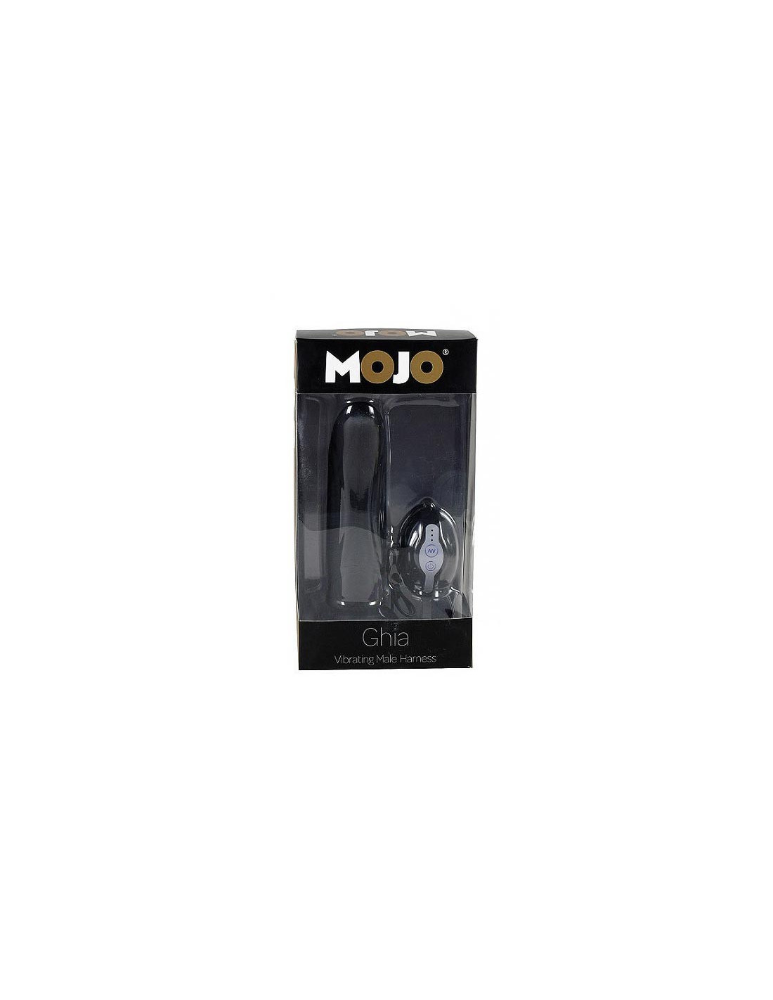 Mojo Ghia Vibrating Male Silicone Harness black. Color: black Length: ca. 16,5 cm Diameter: ca. 5,2 cm Fully waterproof Made of Silicone and ABS Plastic 7 powerful functions Give your partner extra girth and power 2x AAA batteries not incl.