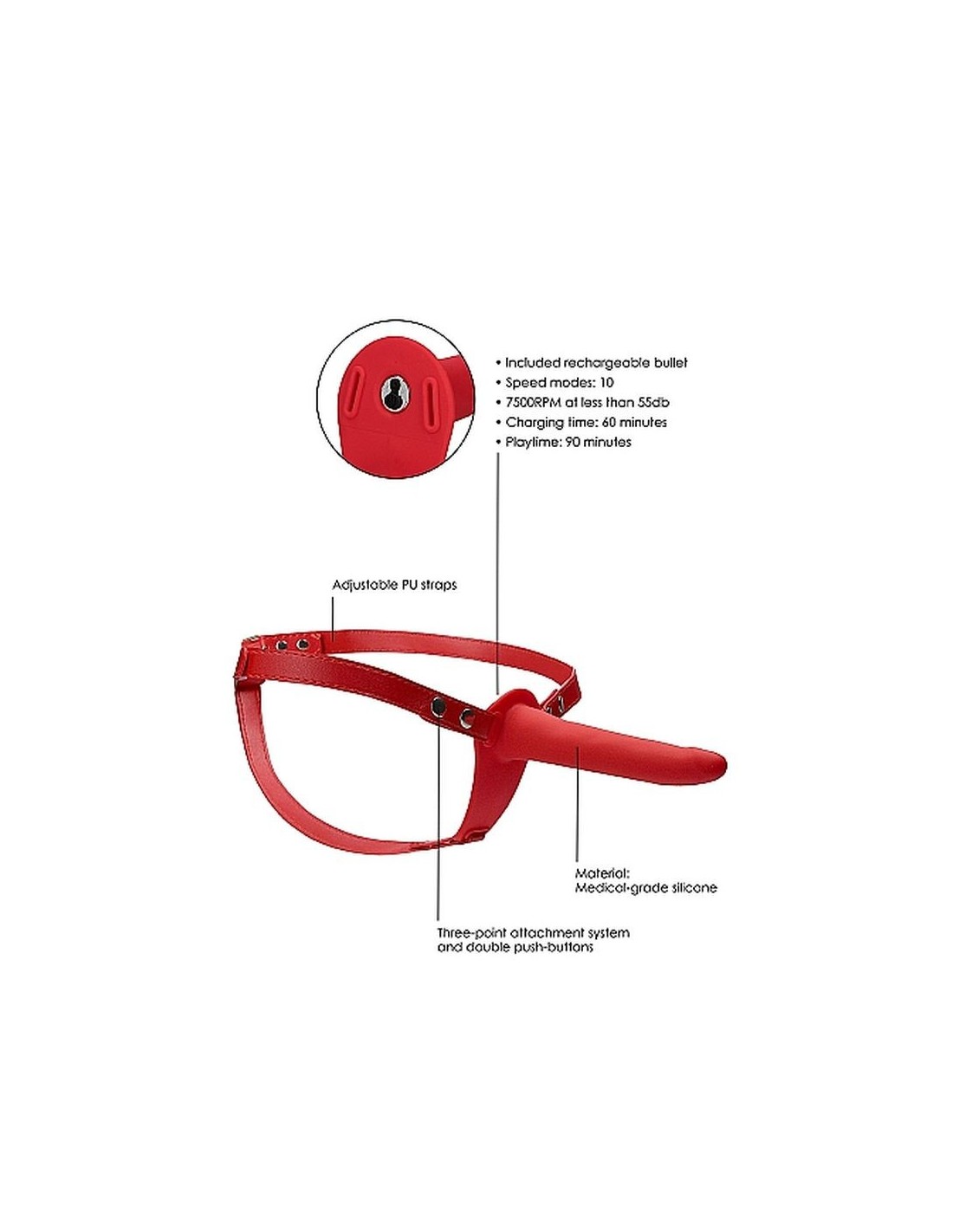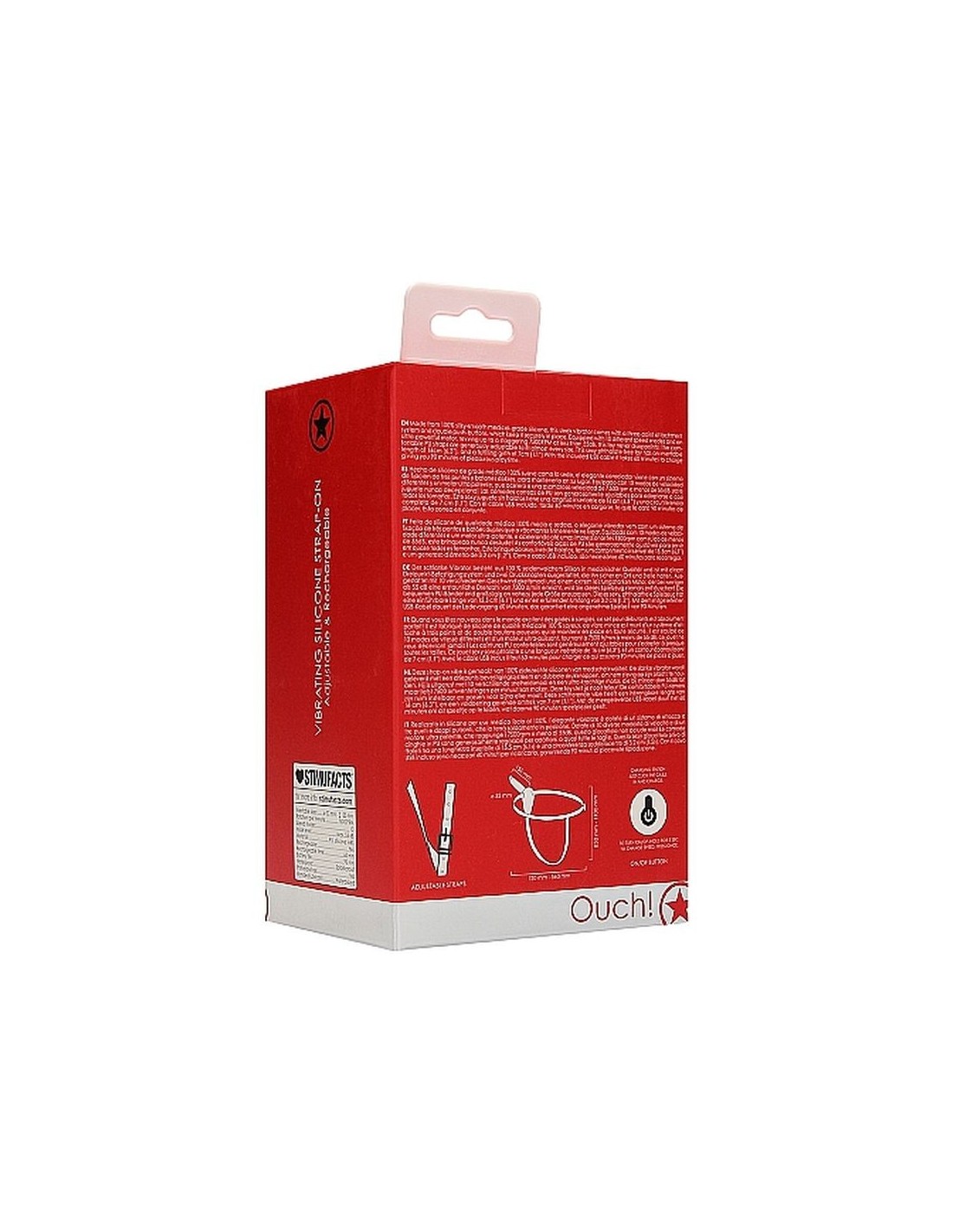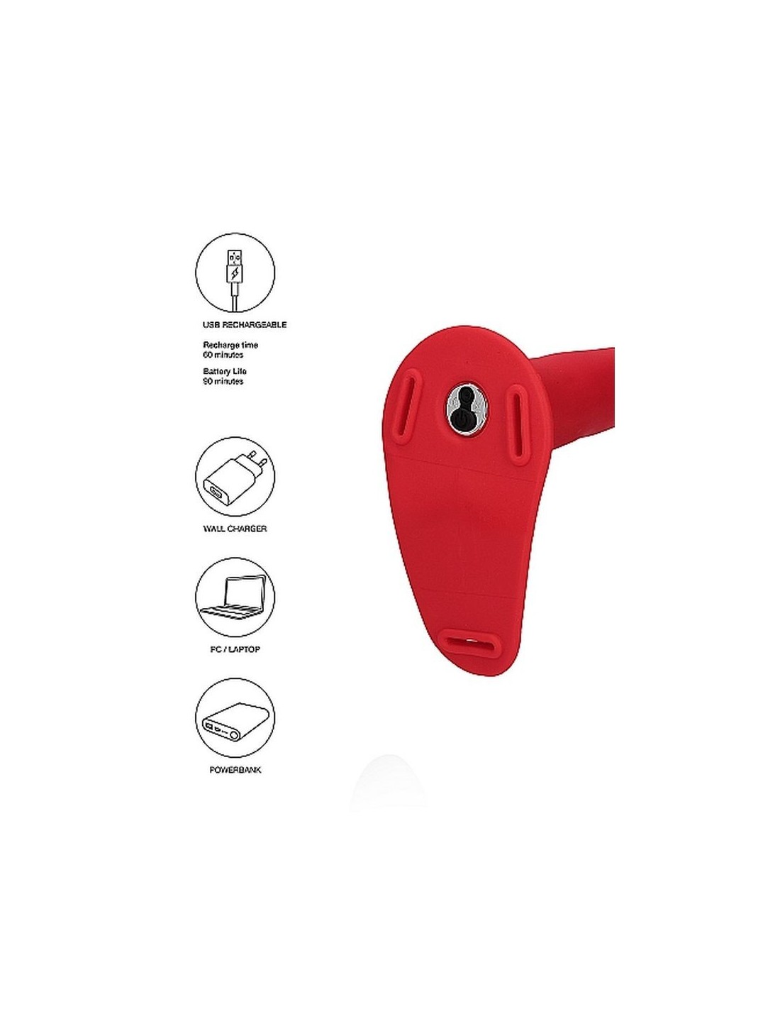 Vibrating Silicone Strap-On - Adjustable - Red Realizzato in silicone premium liscio al 100%, l’elegante vibratore è dotato di un sistema di attacco a tre punti e doppi pulsanti, che lo terrà saldamente in posizione. Dotato di 10 diverse modalità di velocità e di un motore ultra potente, che raggiunge i 7500rpm a meno di 55dB, questo giocattolo non delude mai! Le comode cinghie in PU sono generosamente regolabili per adattarsi a quasi tutte le taglie. Questo sexy giocattolo privo di ftalati ha una lunghezza inseribile di 15,5 cm (6.1») e una circonferenza soddisfacente di 3,2 cm (1.2»). Con il cavo USB incluso sono necessari 60 minuti per ricaricarlo, garantendo 90 minuti di piacevole riproduzione. Dimensioni confezione 16 x 10 x 8 cm Peso confezione da 250 grammi Peso Prodotto 204,00 grammi Diametro Prodotto 3,2 cm Lunghezza Inseribile 15,5 cm Quantità Motori 1 Rotazioni 7500 RPM Modalità Velocità 10 Multi-velocità Sì Livello Rumore 55 dB Ricaricabile Sì Tempo di Ricarica 60 min Durata Batteria Ricaricata 90 min Anti-schizzo Sì Privo di Ftalati Sì Specifiche: La lunghezza delle cinghie può essere regolata tra 12 cm - 46 cm e 83 cm - 110 cm Materiale PU, Silicone, ABS