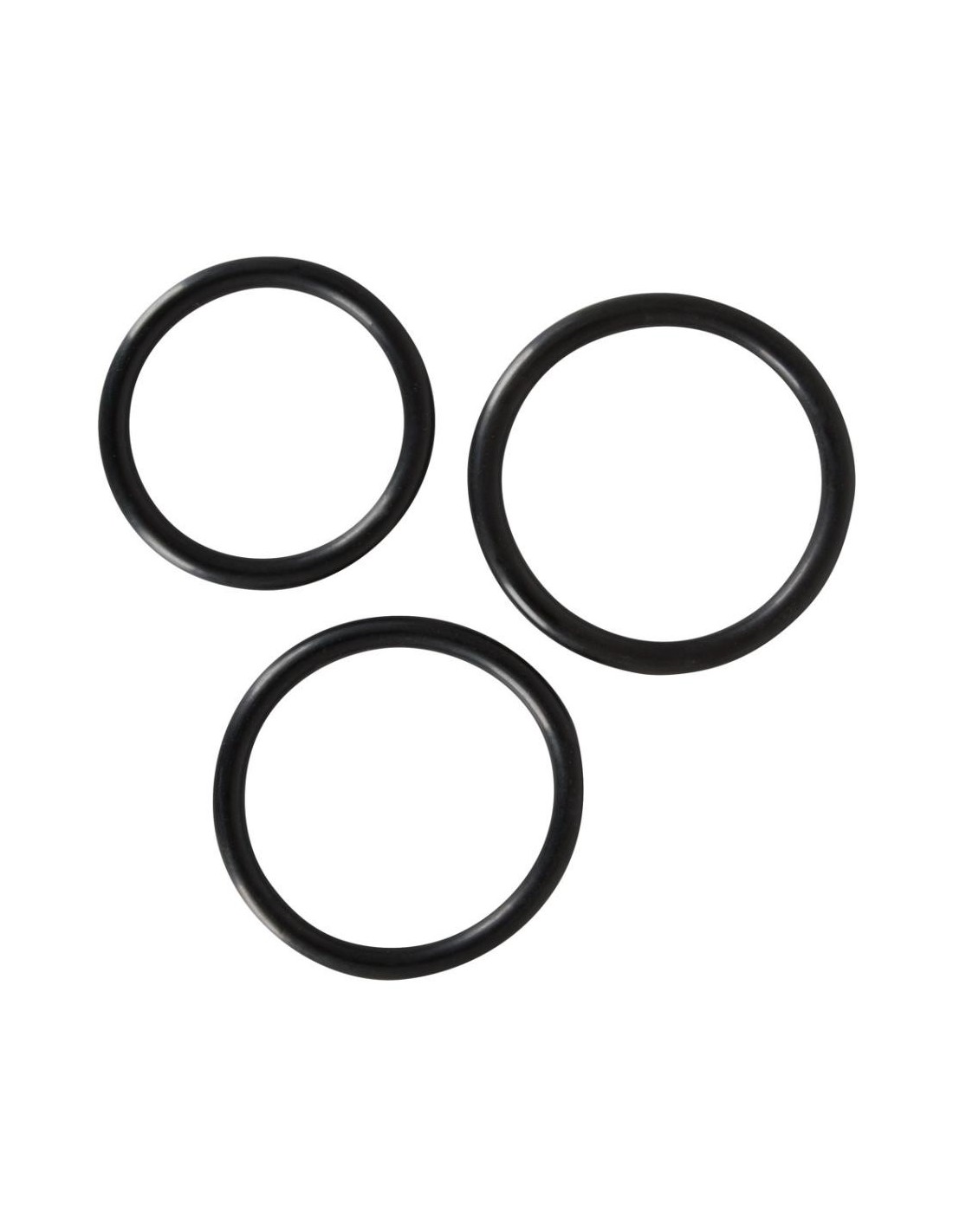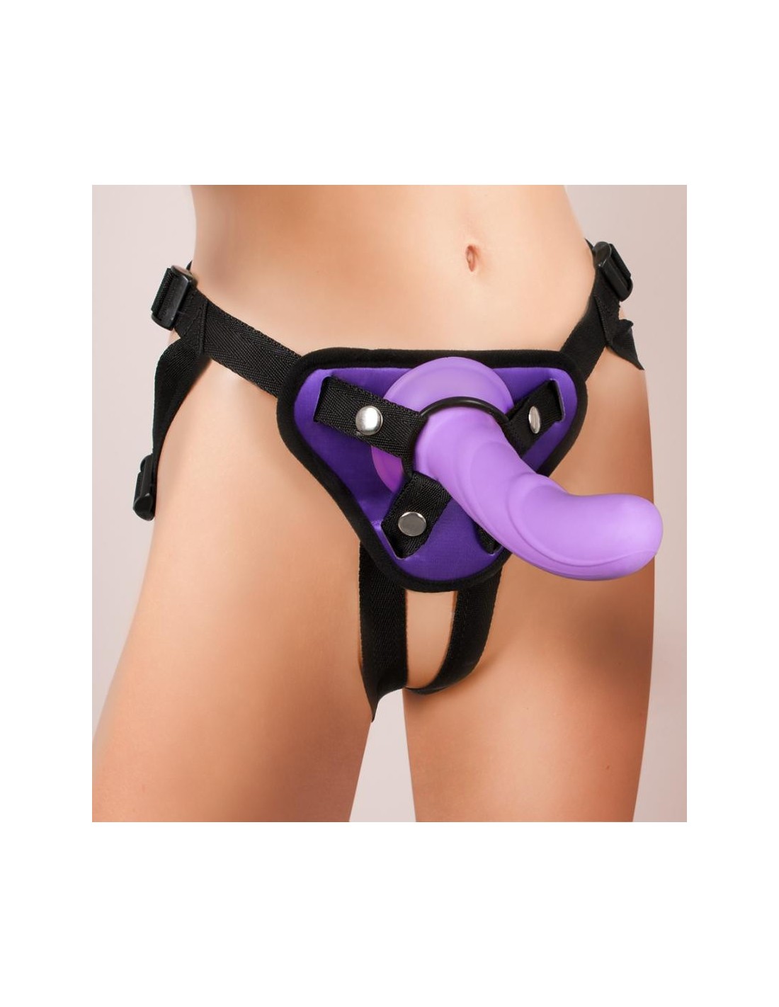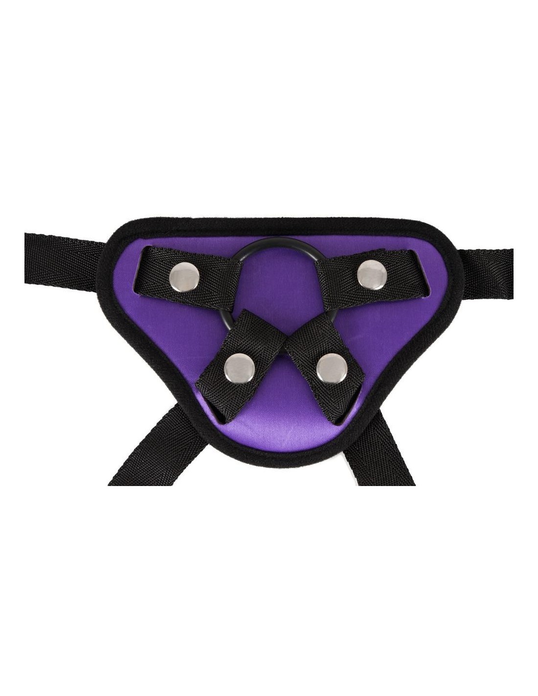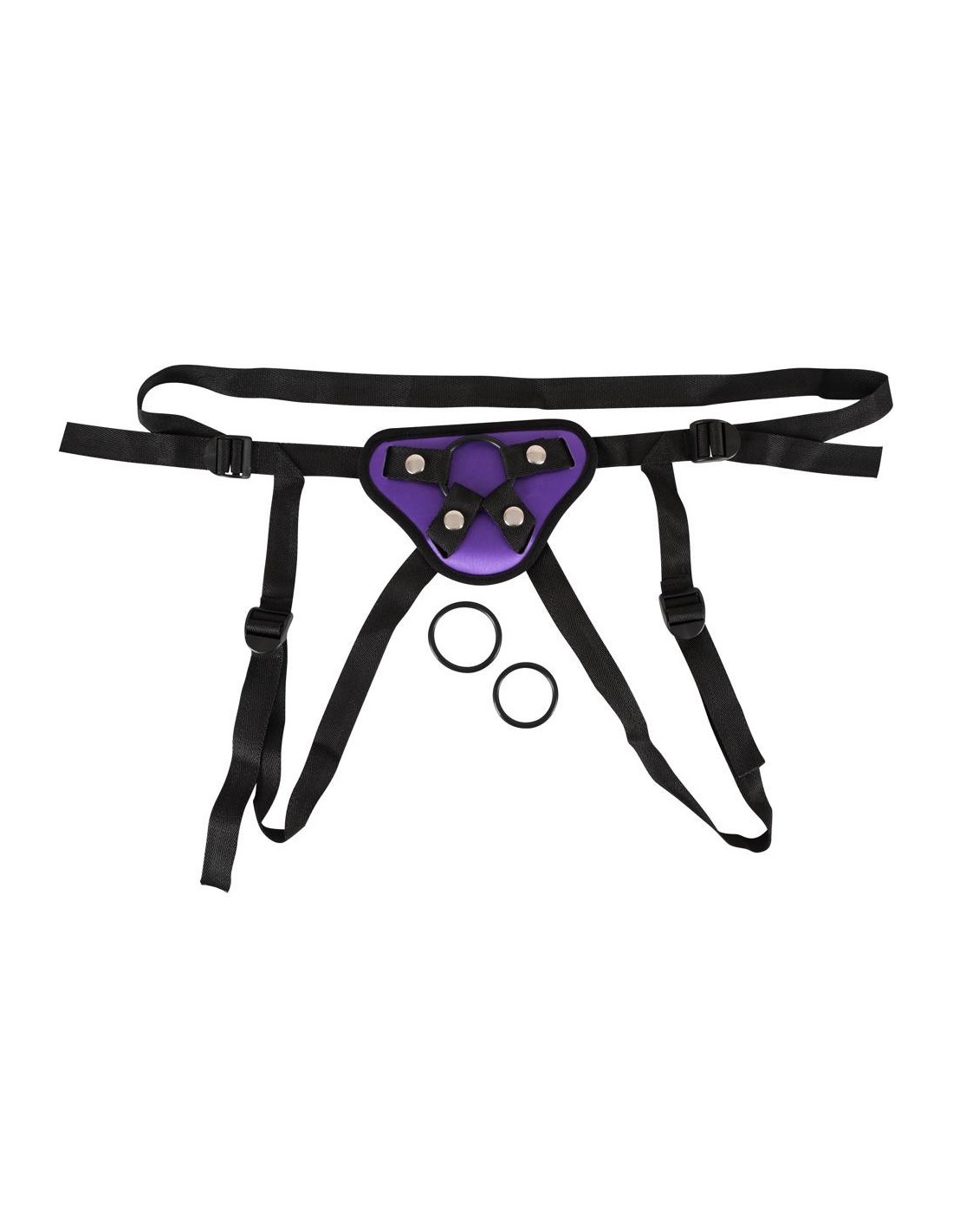 Imbracatura strap-on in ecopelle con tre anelli di diametro diverso di 4 cm, 4,5 cm e 5 cm. Viola/nero. Circonferenza massima: fianchi 134 cm, gambe 82 cm.