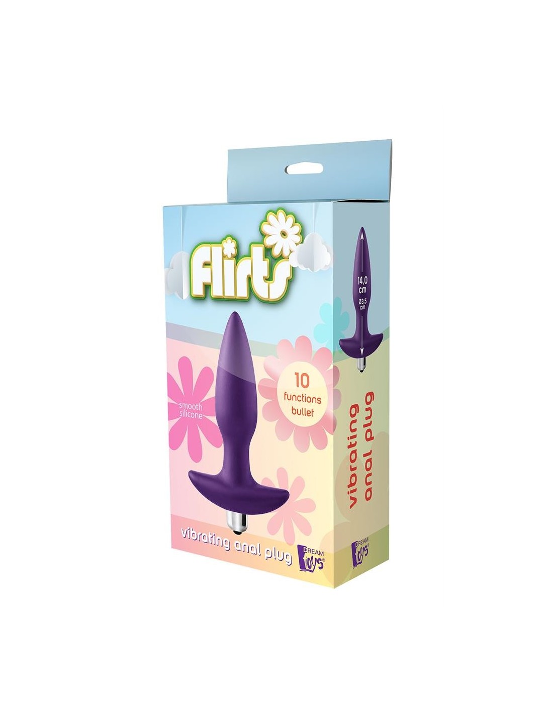Flirts is the Dream Toys collection that has bright colours and packaging that reminds of spring, blue skies, sunny days and flowers. ,This Flirts vibrating plug is made of smooth purple silicone that is soft to the touch. The tapered shape enables easy insertion. The plug has an anchor shaped base to make sure the plug remains in place and to enhance the sense of security. The vibrating bullet is removable and offers 10 vibration rhythms that can be operated with a single button.