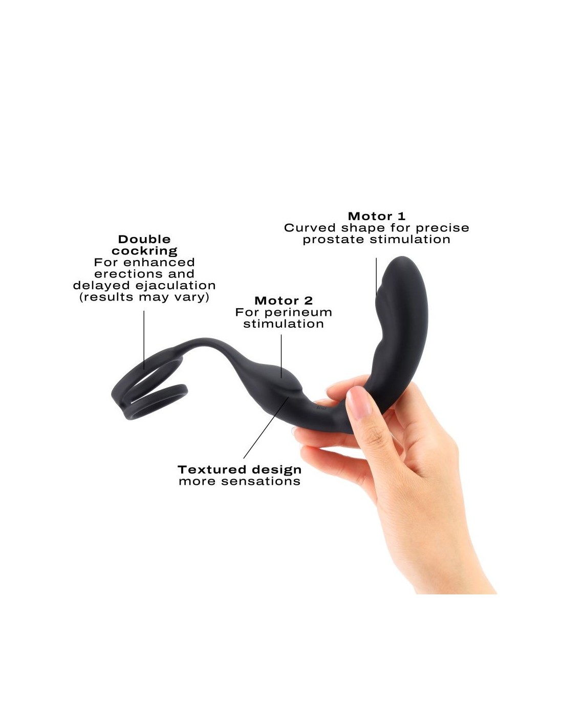 P-RING trasforma il tuo tempo di gioco in un vortice di intenso desiderio. Raddoppiando come massaggiatore prostatico e doppio anello fallico, questo morbido giocattolo in silicone ha qualche asso nella manica. Ti porta un piacere multiplo con una stimolazione completa: anale, prostata, perineo, pene e testicoli. Il doppio anello garantisce un'erezione intensificata e un'eiaculazione ritardata, il che significa che entrambi i partner possono godere di orgasmi intensi. La forma curva del giocattolo e la testa sottile consentono un utilizzo estremamente confortevole, mentre il suo design testurizzato stimola le zone più erogene del tuo corpo e varia la sensazione. Con il suo telecomando, le tue sensazioni aumenteranno a un livello completamente nuovo da solo o con il tuo partner. Allora, sei pronto per un viaggio tra le stelle? BENEFICI: Stimolazione multipla: prostata, pene, perineo e testicoli Forma curva per una precisa stimolazione della prostata Telecomando per un piacere vario, da soli o in coppia Due motori per una stimolazione potente e simultanea Doppio cockring ultra flessibile per una migliore erezione del pene e un'eiaculazione ritardata 9 modalità di vibrazione INFORMAZIONI TECNICHE: Dimensione : 18,2 x O̸3,7 x O̸3,2 cm / 7,17 x 1,46 x 1,26 pollici Lunghezza inseribile: 9 cm / 3,54 pollici Batteria agli ioni di litio Tempo di ricarica: 30 minuti Durata: 30 – 65 minuti Portata remota: 5 m Livello di rumore: 45 db USB ricaricabile (cavo incluso) A prova di spruzzi