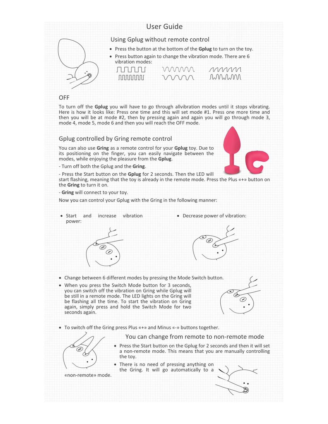 Gplug è il più piccolo plug anale ricaricabile sul mercato! Ha un diametro di 3,9 cm (1,54 in) Questa è la dimensione più venduta dei giocattoli anali. Guida utente Utilizzando Gplug senza telecomando Premere il pulsante in basso del Gplug per accendere il giocattolo. Premere nuovamente il tasto per cambiare la modalità di vibrazione. Ci sono 6 modi di vibrazione: OFF Per spegnere il Gplug si dovrà passare attraverso modalità allvibration fino all'arresto della vibrazione. Ecco come fare: Premere una volta e questo imposterà la modalità # 1. Premendo ancora una volta si passerà in modalità # 2, poi premendo ancora e ancora si passerà attraverso la modalità 3, la modalità 4, modalità 5, modalità 6 e poi si raggiungerà la modalità OFF. Gplug controllato dal telecomando Gring È inoltre possibile utilizzare gring come telecomando per il vostro giocattolo Gplug. Grazie alla sua posizione è possibile navigare facilmente tra le modalità, mentre lo si sta utilizzando. - Spegnere il Gplug e Gring. - Premere il pulsante Start sulla Gplug per 2 secondi. Poi il LED inizierà a lampeggiare, il che significa che il giocattolo è già in modalità remota. Premere il tasto «+» pulsante Plus sul Gring per accenderlo. - Gring si collega al vostro giocattolo. Ora potete controllare il vostro Gplug con il Gring nel modo seguente: Avviare e aumentare il potere delle vibrazioni: Diminuire la potenza delle vibrazioni: Cambiare tra 6 diverse modalità premendo il pulsante Mode Switch. Quando si preme il pulsante Switch Mode per 3 secondi, è possibile disattivare la vibrazione Gring mentre Gplug sarà ancora in modalità a distanza. Le luci LED sul Gring lampeggiano per tutto il tempo. Per avviare di nuovo la vibrazione Gring, è sufficiente premere e tenere premuto di nuovo il Switch Mode per due secondi. Per spegnere Gring premi i pulsanti più «+» e meno «-» insieme. È possibile modificare da remoto alla modalità non remota Premere il pulsante Start sulla Gplug per 2 secondi e poi impostare una modalità non remota. Questo significa che si sta controllando manualmente il giocattolo. Non c'è bisogno di premere nulla sul Gring. Si passa automaticamente a una modalità di «non-a distanza». Carica - Posizionare i due punti del caricabatterie ai punti designati sul giocattolo. L'estremità USB del caricabatteria dovrebbe andare all'uscita USB del computer o presa adattatore. - Mentre si carica la Gplug la luce del LED sarà lampeggiante. La luce quando il giocattolo è completamente carico rimarrà costante. - Durante il processo di carica, i pulsanti non saranno attivi e il giocattolo non può essere utilizzato. Si prega di notare che il giocattolo si spegne automaticamente quando la batteria è scarica. Il tempo di ricarica è di circa un'ora e mezza e questo vi darà circa 40 minuti di utilizzo in modalità massima. Caratteristiche: - Design ergonomico, colori fantasia. - Motore potente ma silenzioso. - Sei modi di vibrazione con intensità variabile - da tremori leggeri a vibrazioni intense. - Comandi intuitivi. - Fatto in premium-class silicone ipoallergenico. Setoso e liscio. - Inodore. - 100% impermeabile. - Fino a 4 ore di funzionamento con una sola carica della batteria stessa. - Caricabatterie magnetico. Si prega di notare il tempo di carica iniziale è di 2 ore. - Taglia: Plug Piccolo 3,9 cm (1.54in) Dimensioni: 14,20 x 7,20 x 7,20 cm Peso: 149 grammi