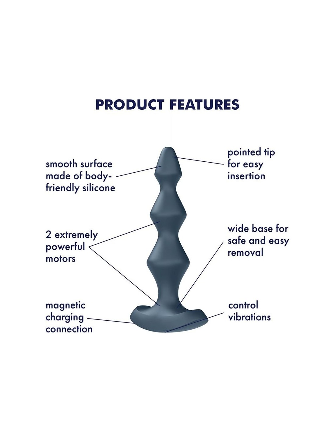 2 motori forniscono vibrazioni intense al vibratore anale Lolli-Plug 1. La struttura a forma di diamante del plug offre una stimolazione aggiuntiva. Una base ampia e il morbido silicone assicurano un gioco sicuro e piacevole. - 12 programmi di vibrazione svariati e potenti - 2 potenti motori trasmettono intensi ritmi di vibrazione in tutto il giocattolo - Adatto a tutti i generi Satisfyer Lolli-Plug 1: plug anale vibrante da uomo e donna Rendi felice il tuo lato B con il Satisfyer Lolli-Plug 1: questo vibratore anale stimola sensualmente con una struttura conica e 2 motori. Con la superficie liscia in silicone delicato sulla pelle, è particolarmente facile da inserire e grazie all'ampia base a forma di T, che funge anche da impugnatura, puoi utilizzarlo in sicurezza. Questo vibratore anale di Satisfyer è adatto per uomini e donne, e anche per il massaggio prostatico. Grazie alla lavorazione impermeabile (IPX7), il Lolli-Plug 1 può essere utilizzato anche sotto la doccia, nella vasca da bagno o in una piscina privata. Se il Lolli-Plug 1 si scarica dopo lunghe ore di gioco, le batterie integrate possono essere ricaricate con il cavetto di ricarica USB incluso. A cosa bisogna fare attenzione quando si utilizzando prodotti per il benessere sessuale anale? Quando si utilizzano vibratori anali, consigliamo sempre di applicare un lubrificante a base d'acqua. I lubrificanti Satisfyer sono disponibili in diverse versioni e sono il complemento ideale al divertimento anale. Vibrazioni profonde e superpotenti Silicone dermocompatibile Impermeabile (IPX7) Facile da pulire Modalità sussurro Batteria agli ioni di litio Cavo di ricarica magnetico USB incluso Adatto per: Donne, Uomini Peso: 66.5 g Lunghezza: 139,3 mm Larghezza: 71,1 mm Altezza: 32,4 mm Con vibrazione: Sì Stimolazione: Anale A tenuta d’acqua: Sì Materiale: Resina ABS , Silicone