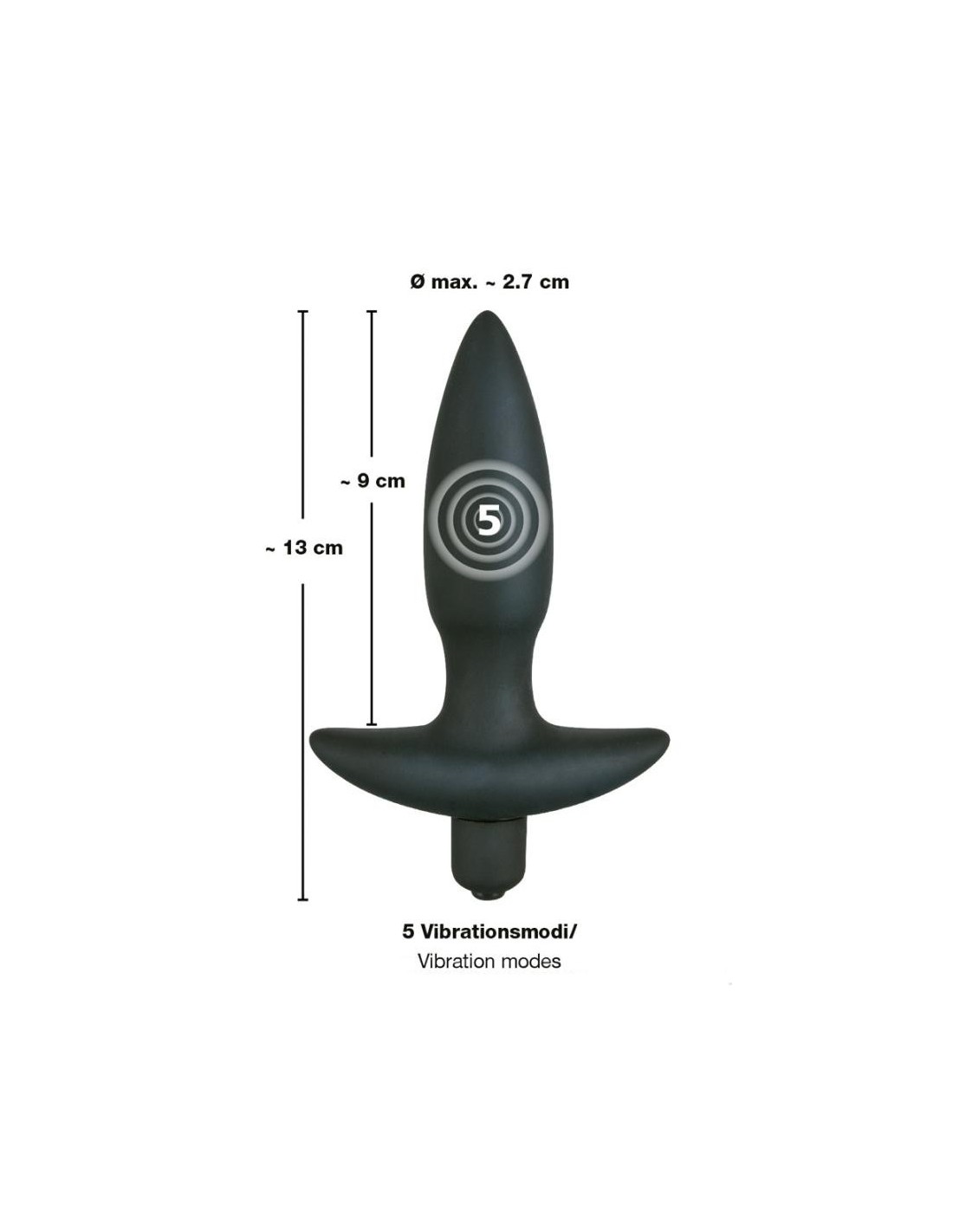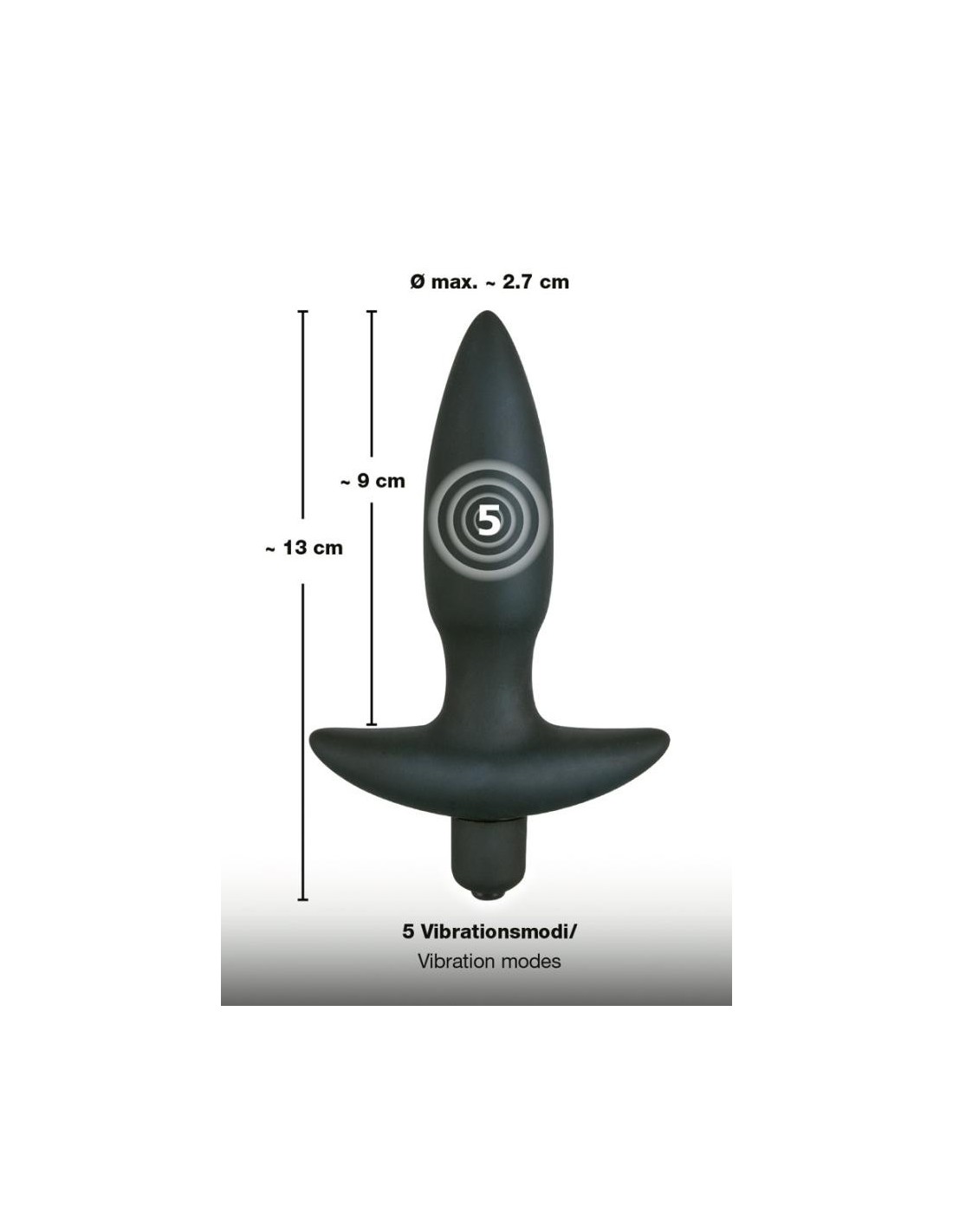 Spina anale nera con vibrazione a 5 fasi con la semplice pressione di un pulsante. Con maniglia di ritorno. Lunghezza totale 13 cm, profondità di inserimento 9 cm. O̸ da 1,9 cm a 2,7 cm. Materiale: silicone. (Si prega di ordinare la batteria separatamente: 1 x Micro/AAAA).