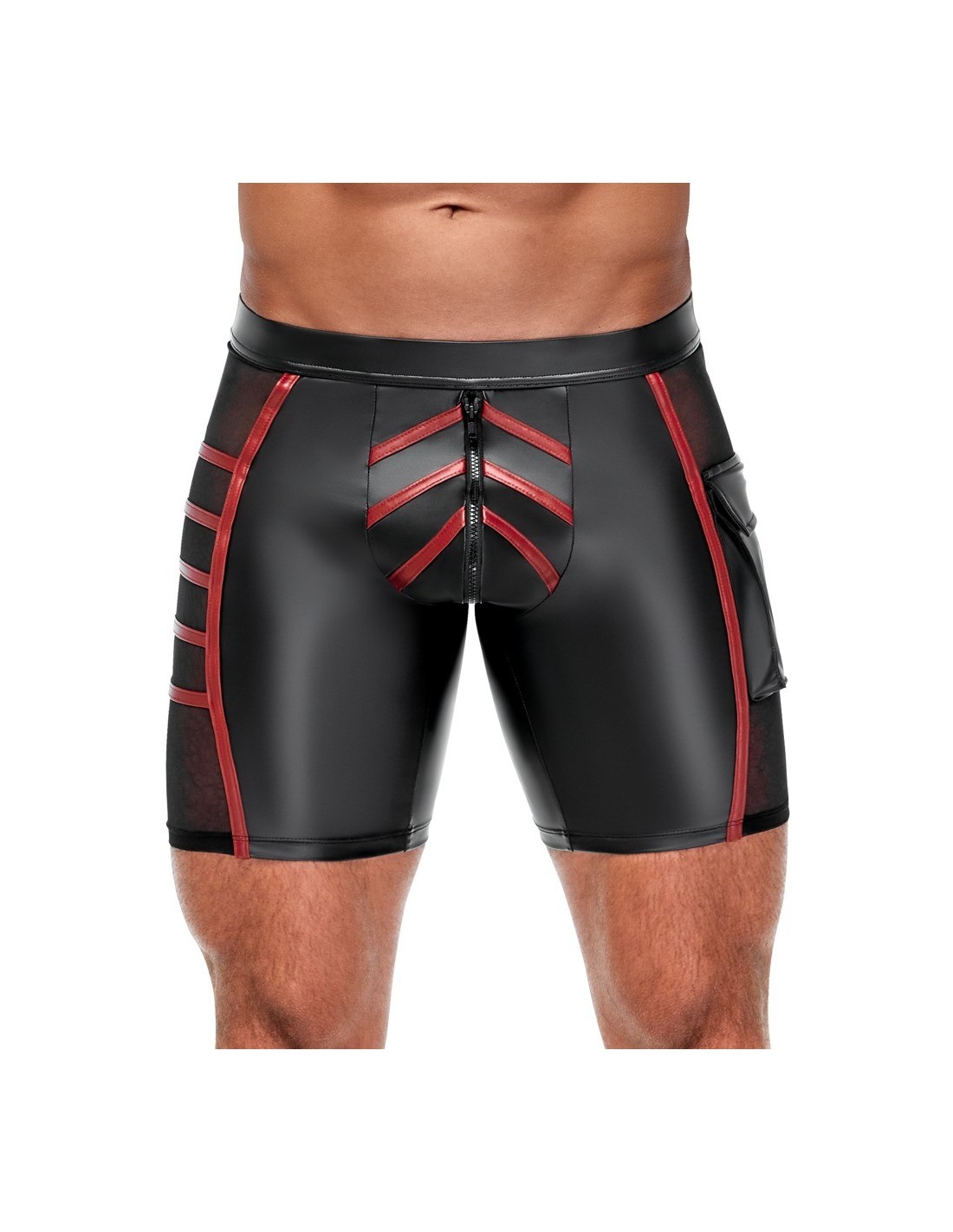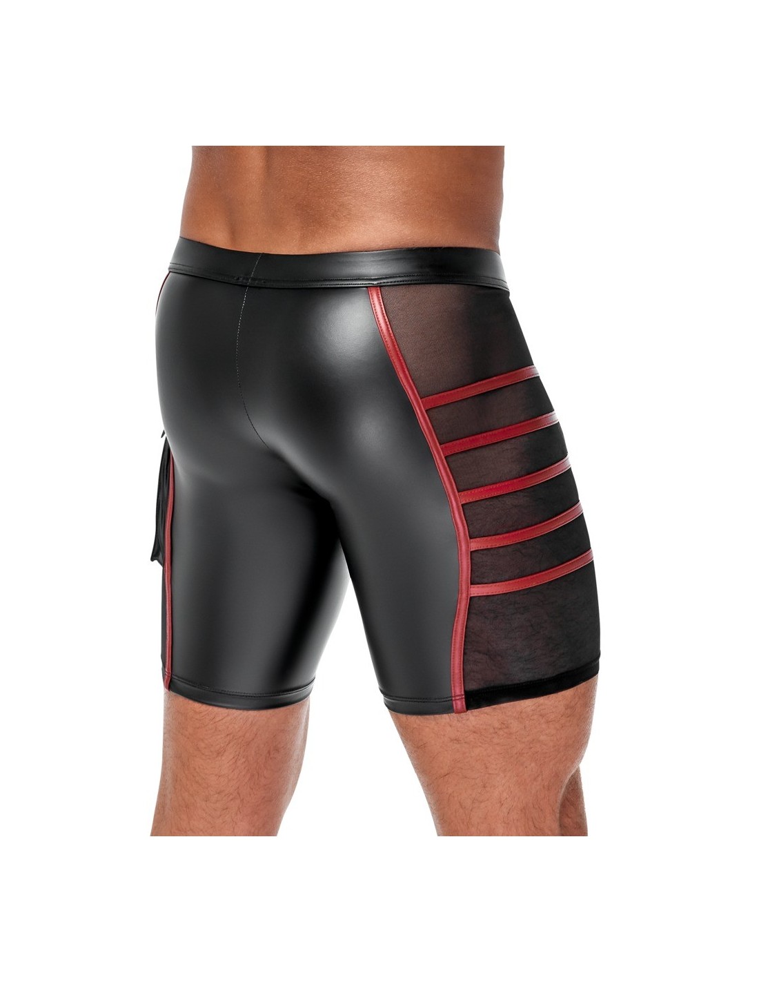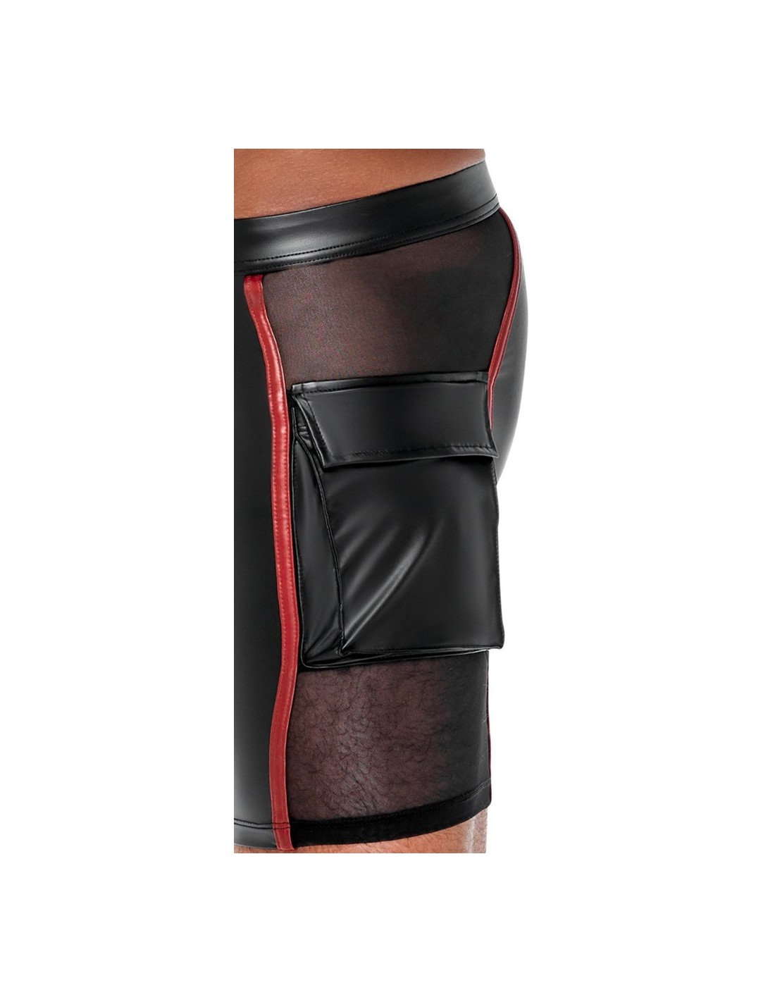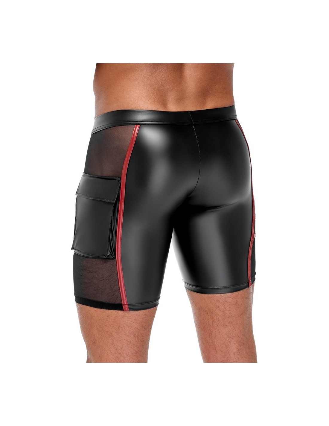 Close-fitting shorts from NEK in a black matte look with contrasting red stripes. Each side with a transparent fine mesh insert, flap pocket on the left leg. Pouch with underlaid zip. Soft, stretchy and with an elastic covered waistband for maximum comfort.