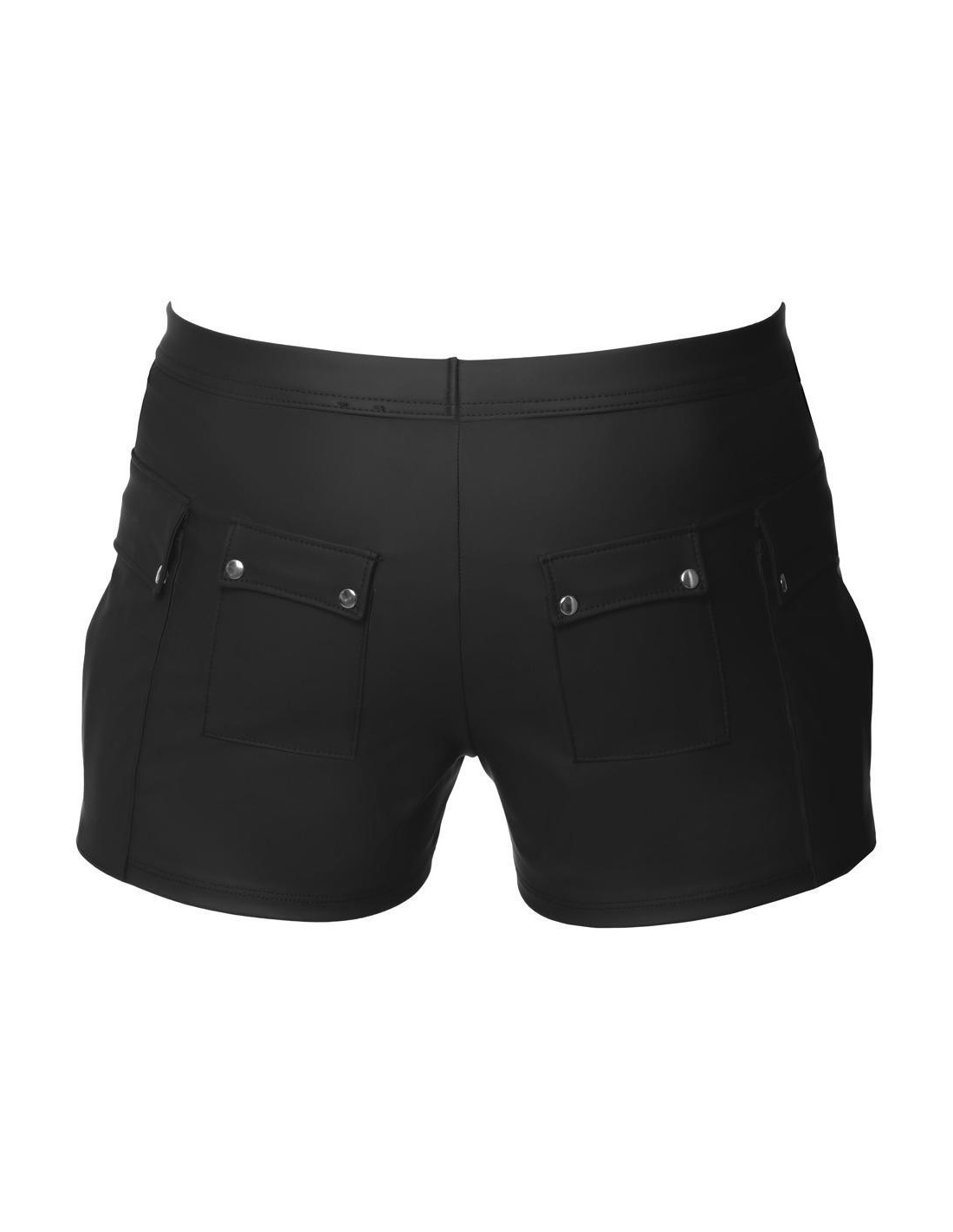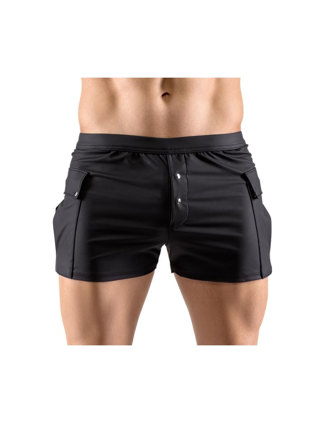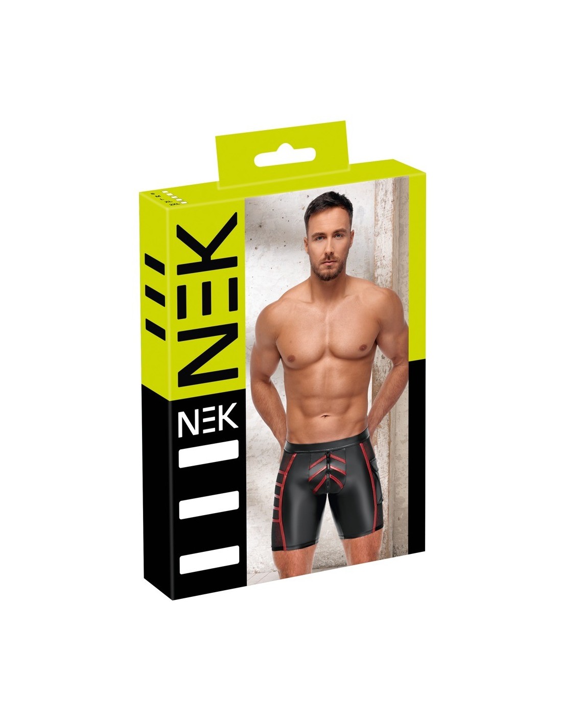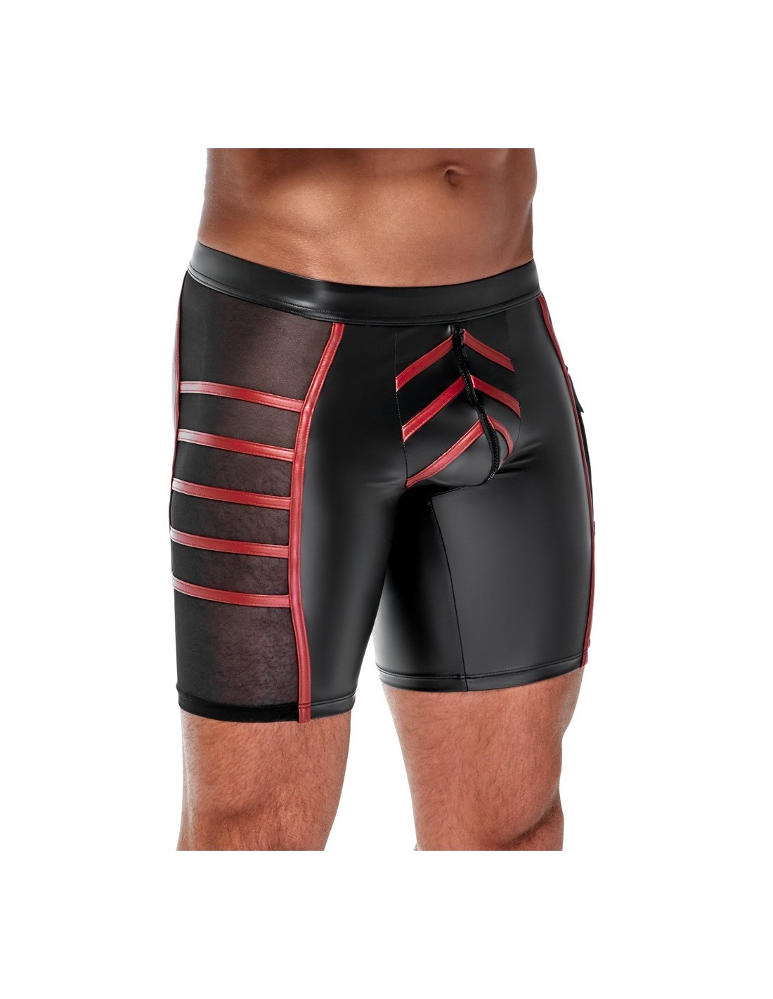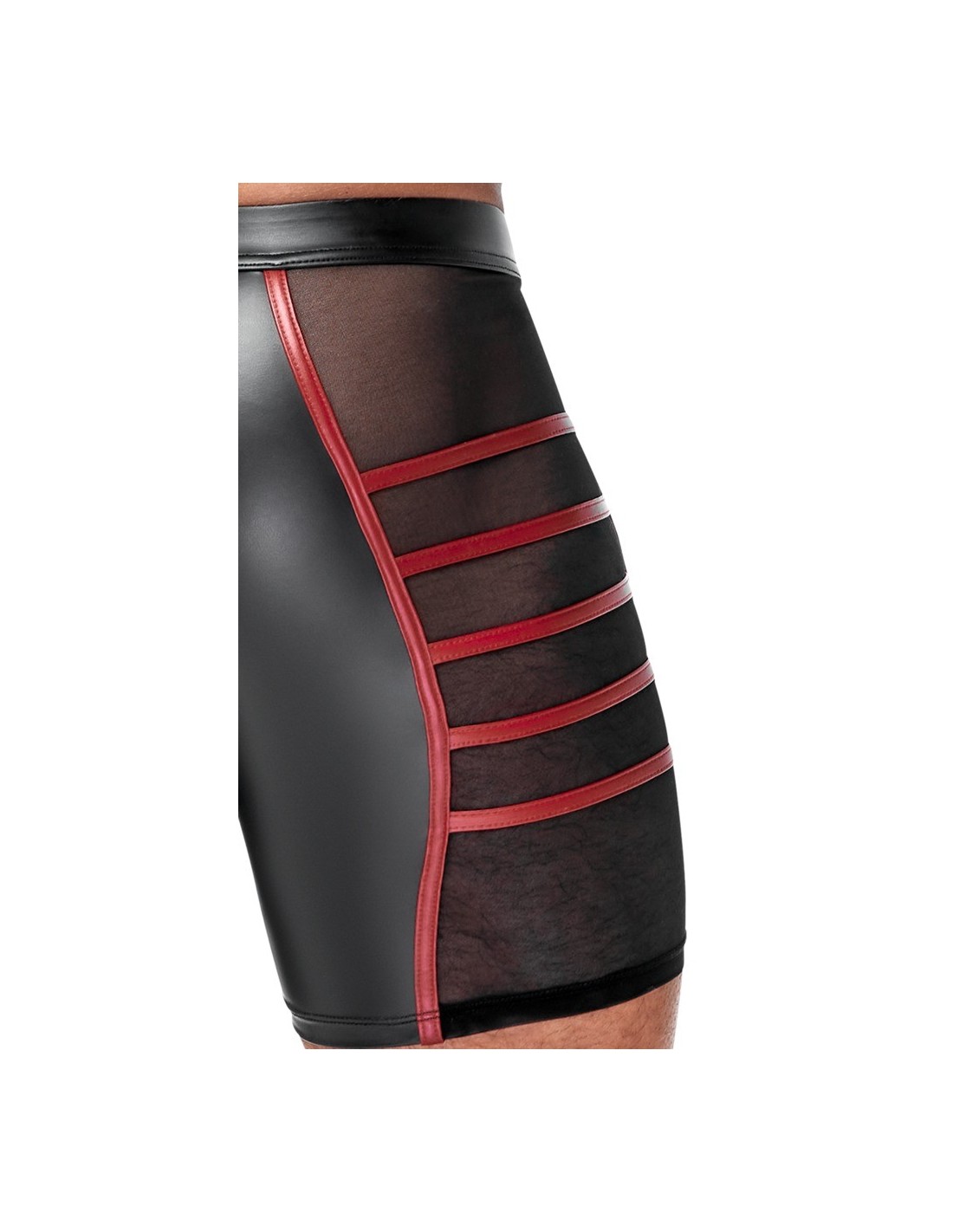 Close-fitting shorts from NEK in a black matte look with contrasting red stripes. Each side with a transparent fine mesh insert, flap pocket on the left leg. Pouch with underlaid zip. Soft, stretchy and with an elastic covered waistband for maximum comfort.