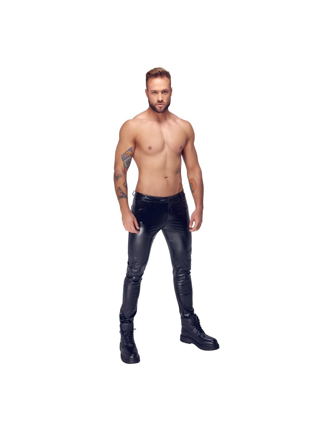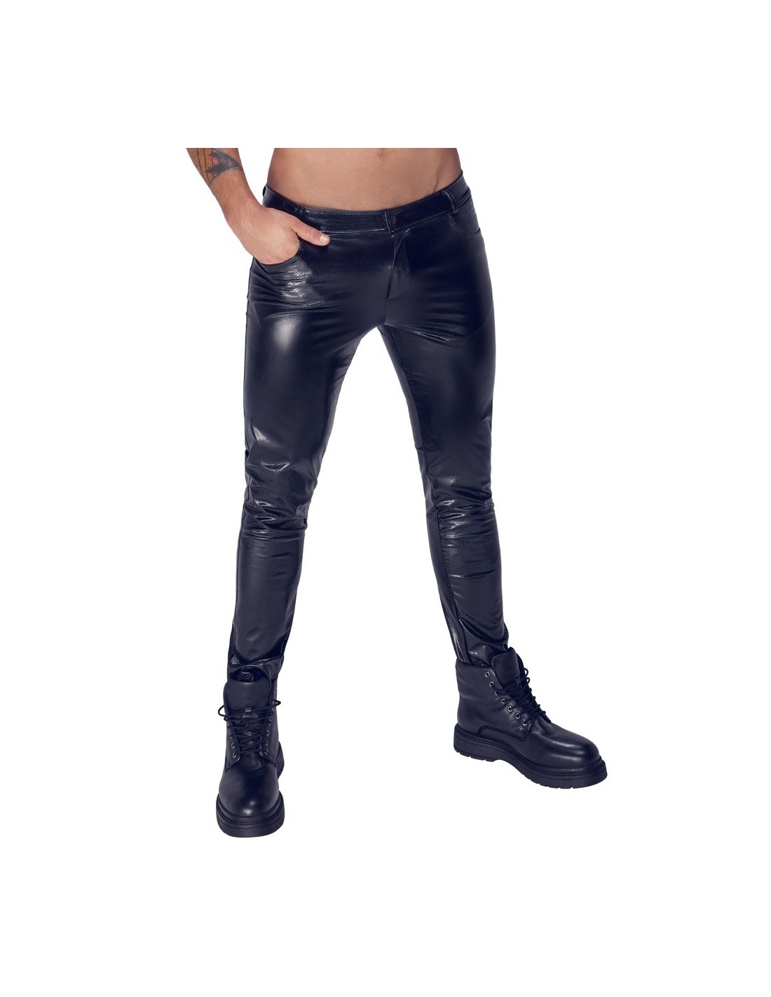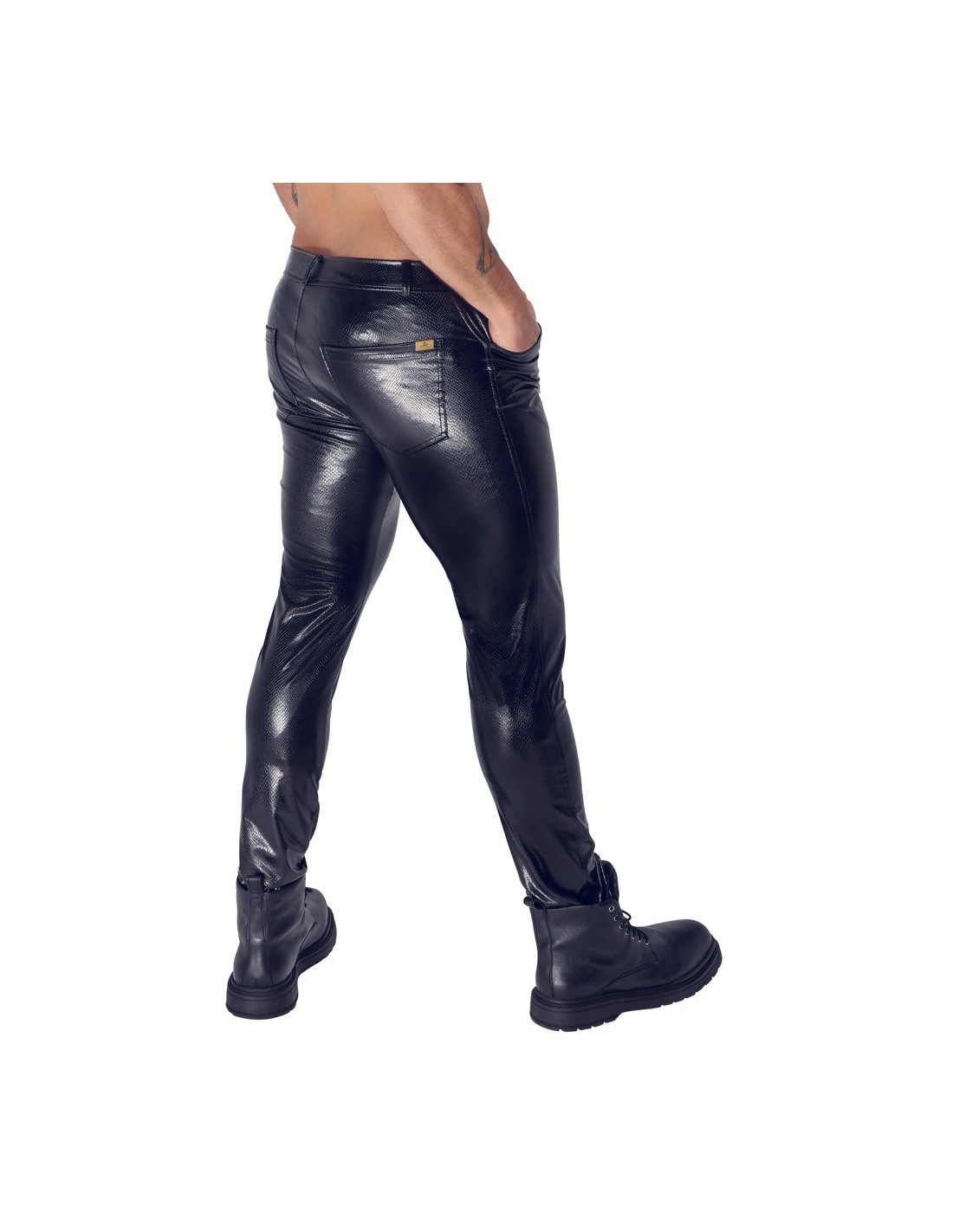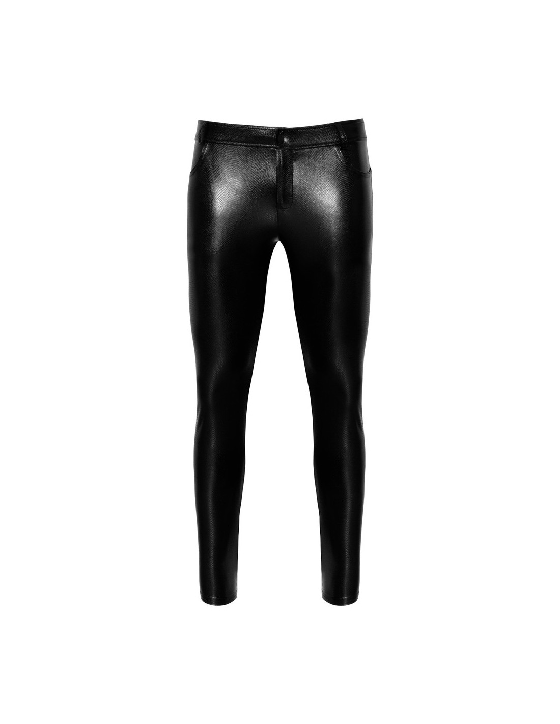 Pantaloni Alpha di Noir dal taglio dritto e dal look trendy in pelle di serpente opaca e lucida. Fantasticamente elasticizzati per una vestibilità aderente e un elevato comfort. Con bottone a pressione e zip nascosta sul davanti, vita con passanti per cintura. Tasche a fessura sul davanti e due tasche posteriori applicate sul retro.