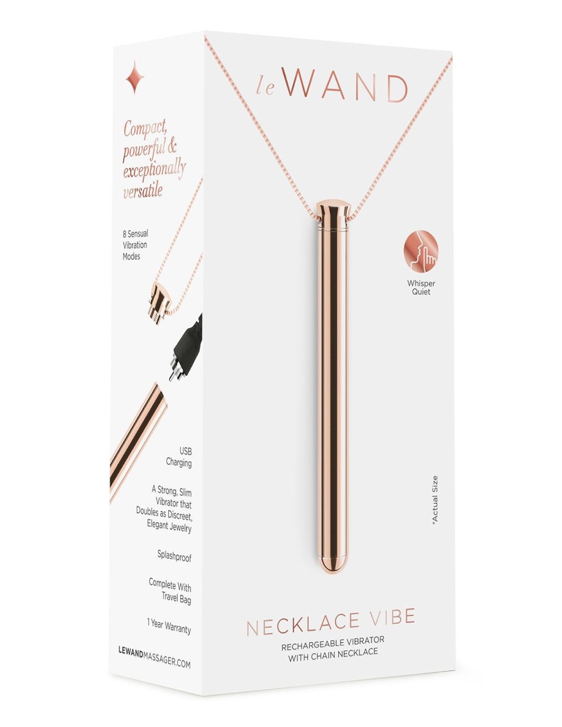 Le Wand Necklace Vibe is a strong, slim vibrator that doubles as discreet, elegant jewelry. This powerful vibe delivers on performance and aesthetic featuring 8 sensual vibration modes that are whisper quiet. Le Wand Necklace Vibe comes complete with USB Charger, and micro-suede travel pouch for discreet storage.