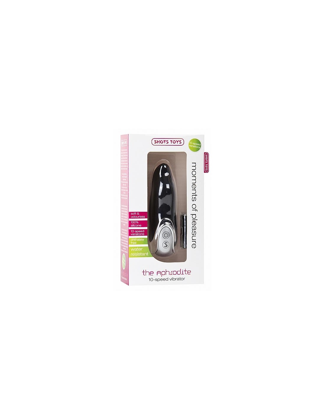 Irresistibile, irrefrenabile ed appassionato, affascinerá ed adorerá solo te; Aphrodite vi avvolgerá in un'eccitazione speciale, vi sommergerá con sensazioni , assicurandovi non soltando di venire, ma di arrivare con stile! Dieci diverse modalitá con funzione extra orgasmica. Ergonomicamente disegnato per inserimenti senza sforzi. La struttura in silicone mantiene la temperatura corporea a lungo. Facile da maneggiare utilizzando una sola mano. Alimentato con 2 batterie AAA. Dimensioni: 9,80 x 19,20 x 5 cm Peso: 131 gram
