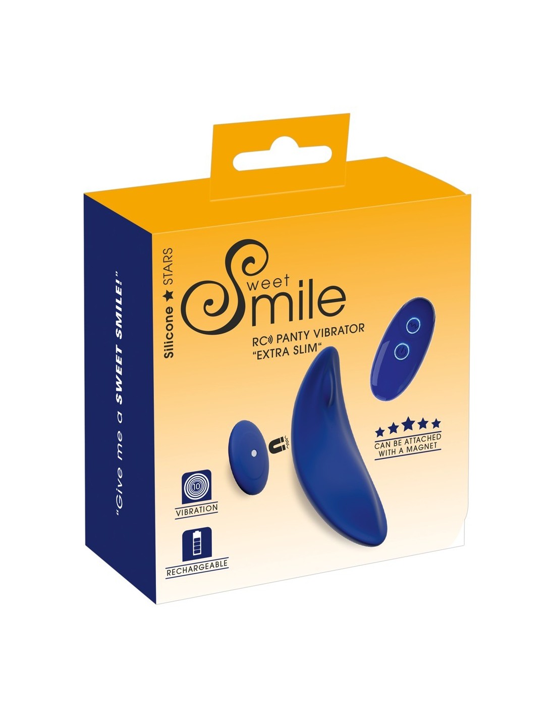 Vibratore per mutandine RC Extra Slim di Sweet Smile con un piccolo e forte magnete per una tenuta sicura in qualsiasi mutandina. Il vibratore in silicone, morbido e confortevole, coccola il clitoride e la vulva con intense vibrazioni. Discreto e molto silenzioso, senza che nessuno se ne accorga!
