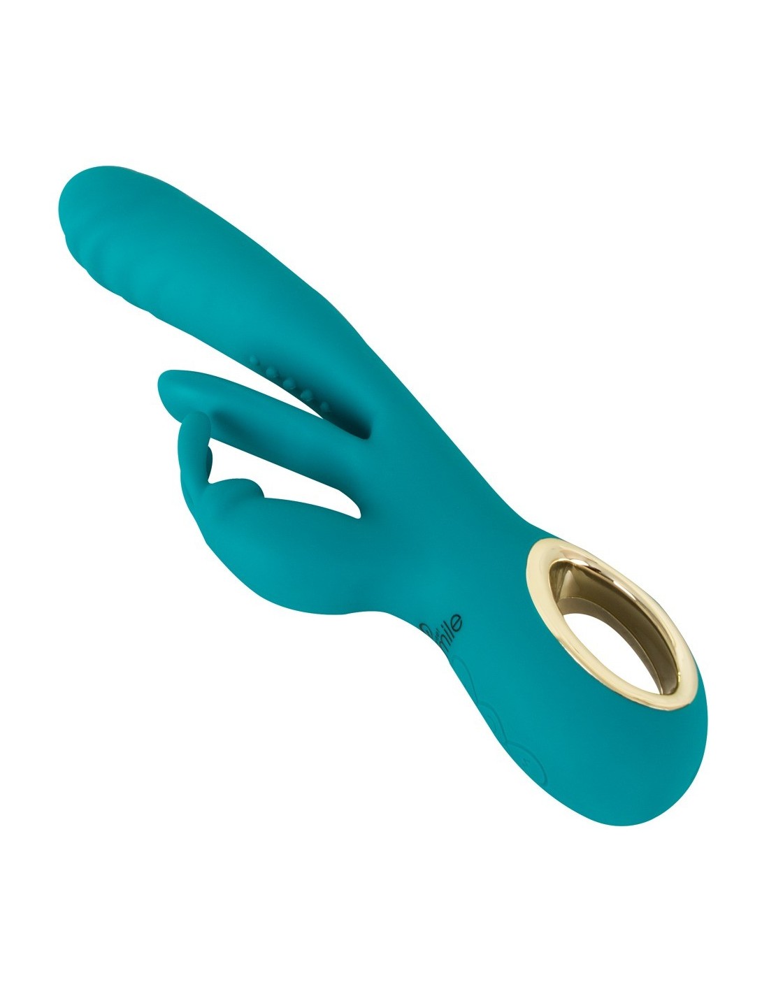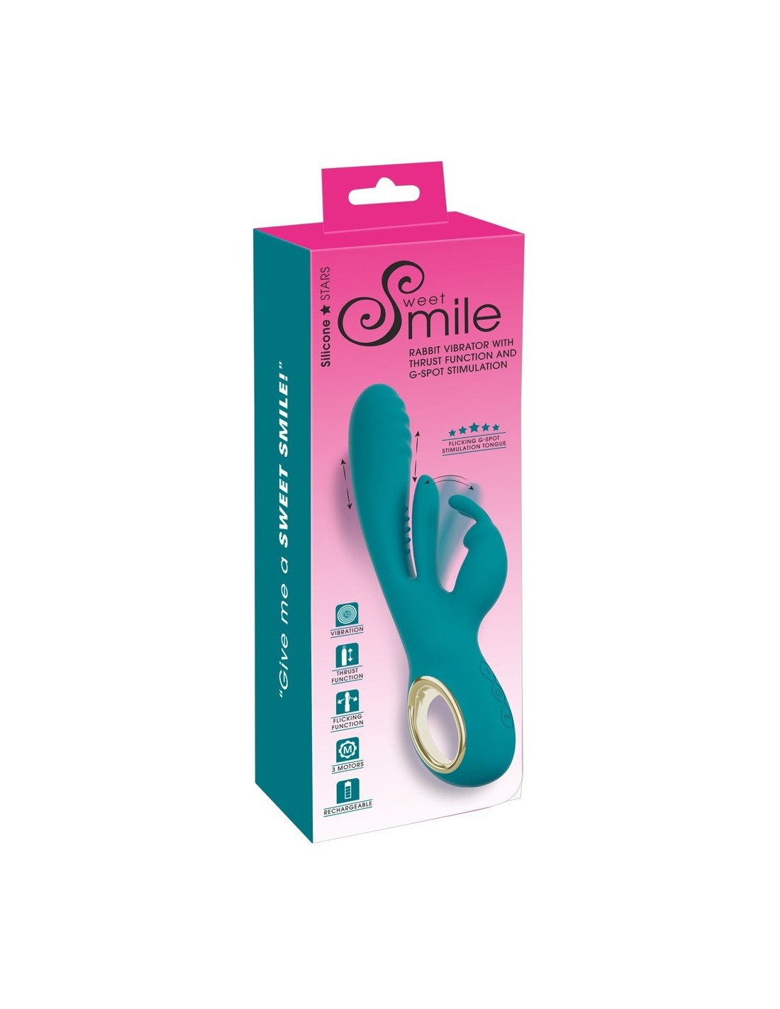 Potente vibratore rabbit con funzione di spinta e stimolazione del punto G di Sweet Smile per una doppia e tripla azione: vagina, zona G e clitoride sono coccolati allo stesso tempo! Per un intenso massaggio della vagina, il vibratore rabbit con la sua testa vibrante a coste spinge con forza ancora e ancora. La fulminea lingua vibrante (flicking tongue) stimola in particolare la zona G con impulsi di battito. Il coniglietto flessibile fa vibrare anche la parte esterna del clitoride. Tre motori silenziosi ma potenti garantiscono una potenza affidabile. Piacere senza limiti per un climax a tutti i livelli!