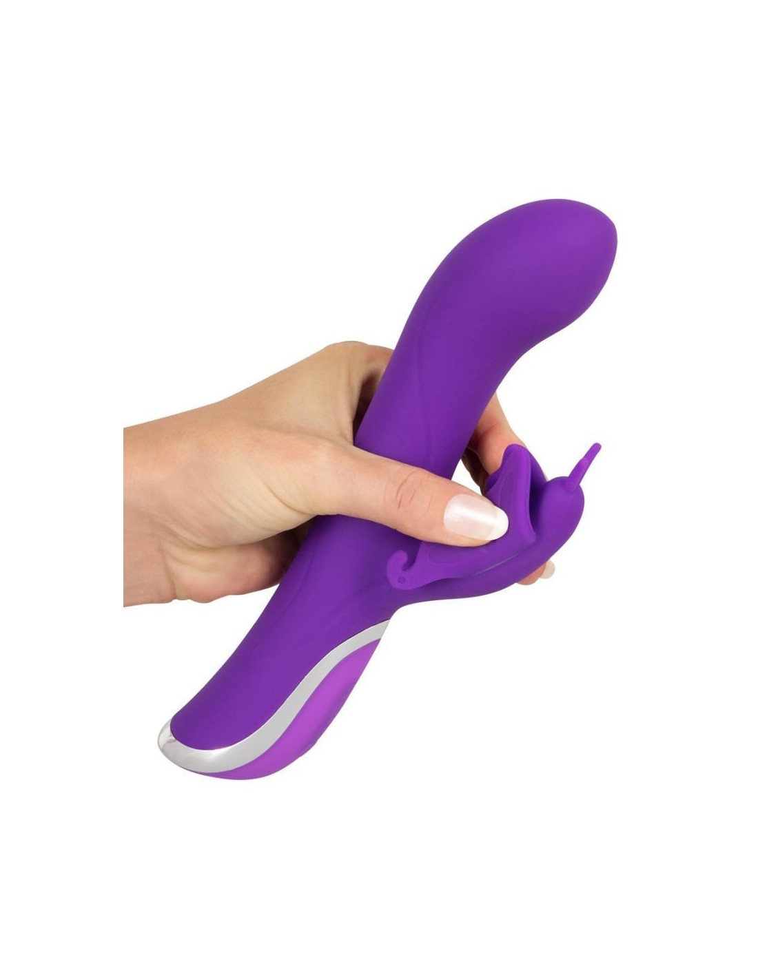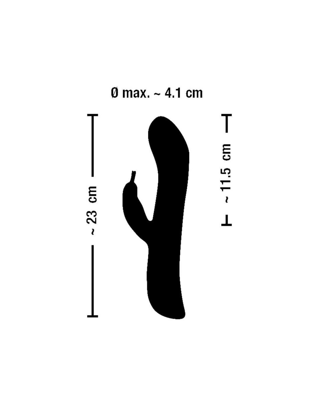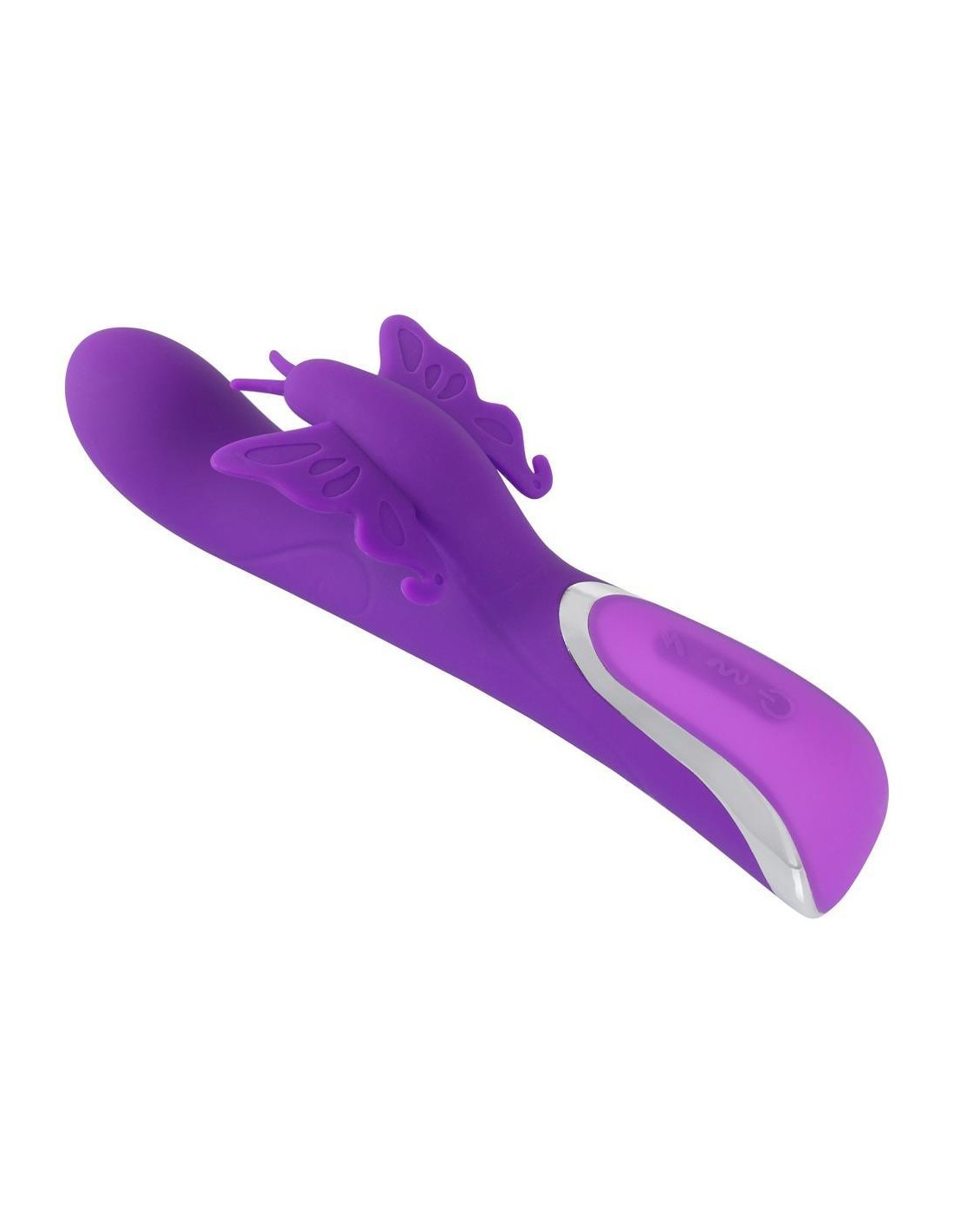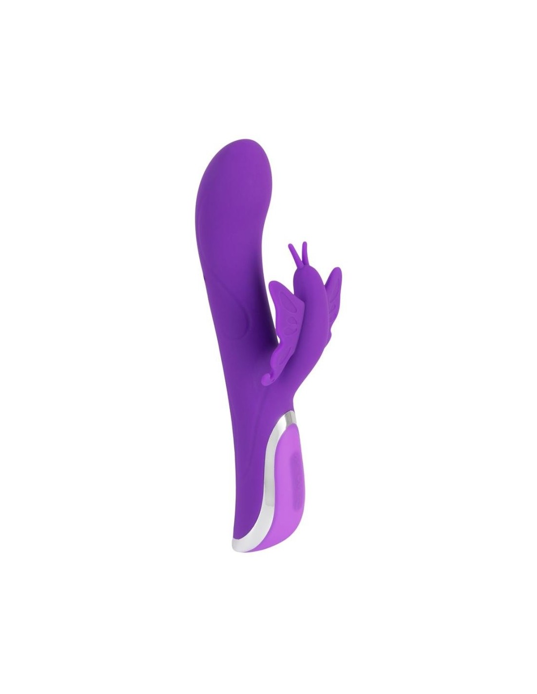 Vibratore Rabbit ricaricabile con albero leggermente curvo e farfalla come stimolatore clitorideo. 10 modalità di vibrazione nel braccio stimolatore clitorideo e 3 velocità di rotazione nella punta dell'asta. Controllabile separatamente. Con scanalature decorative di stimolazione.