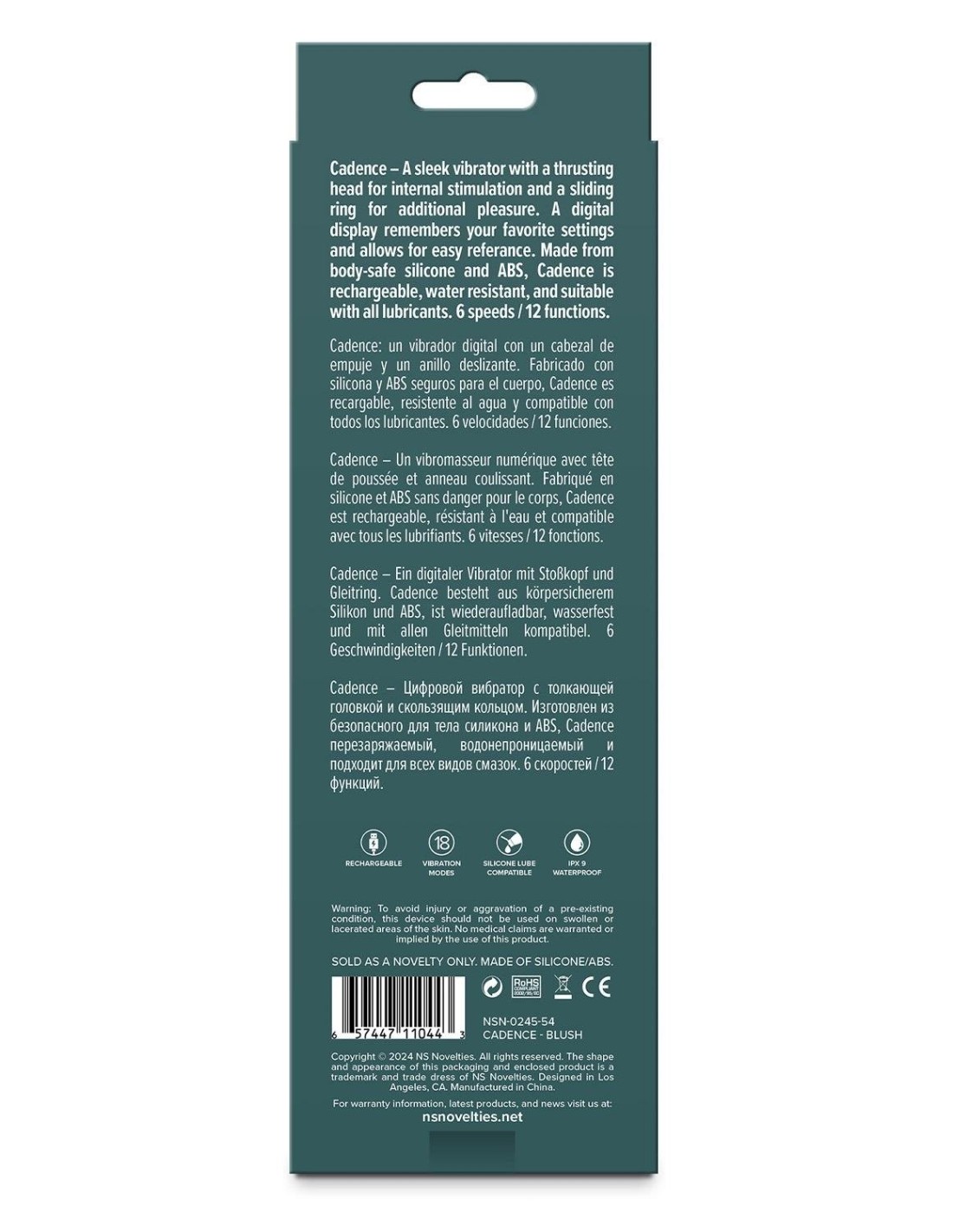Take control of your pleasure with Lust-n-Dreams Cadence, a sleek thrusting vibrator designed to deliver powerful internal stimulation. Featuring a thrusting head and a sliding ring for added sensation, Cadence adapts to your desires with 6 speeds and 12 vibration functions. The digital memory display ensures you can effortlessly return to your favorite settings for a seamless experience. Made from body-safe silicone and ABS, this rechargeable, water-resistant vibrator promotes sexual wellness by encouraging personalized exploration and pleasure. Compatible with all lubricants, Cadence is designed to elevate your intimate experiences with precision and luxury.