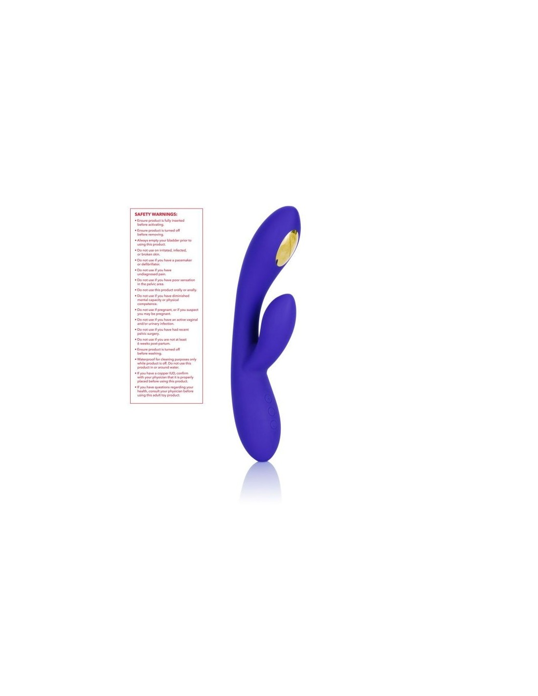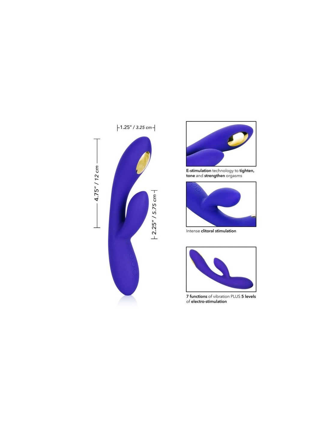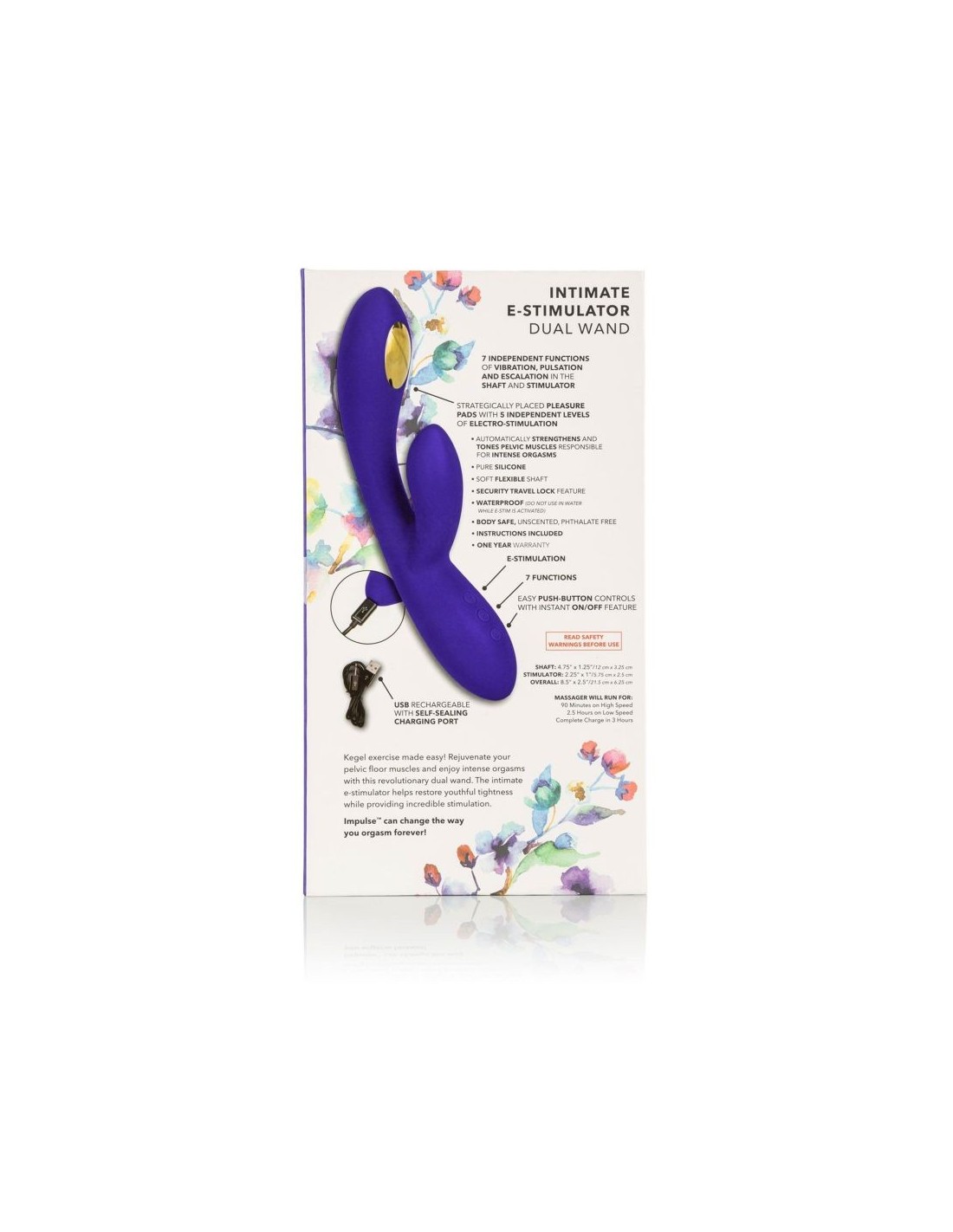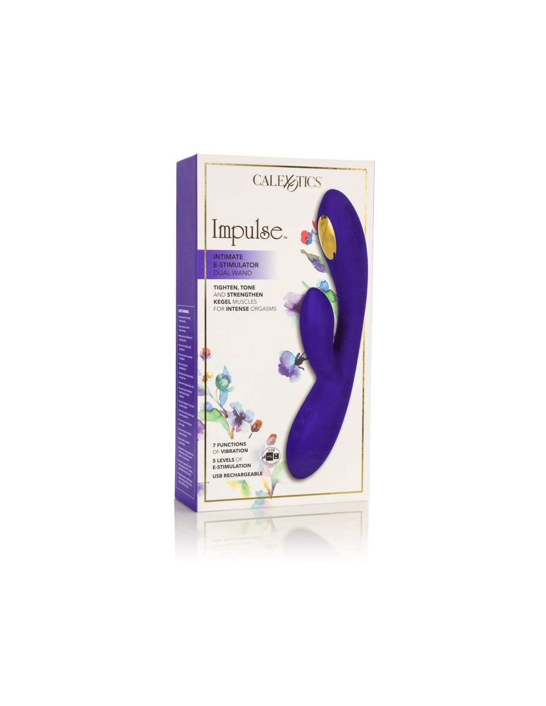 The Impulse E-stimulation collection is here to energize with the Intimate E-Stimulator Dual Wand. This sleek rabbit massager packs 5 independent electro-stimulation functions and 7 vibration functions for powerfully heightened pleasure with every use. Electro-Stimulation technology uses electric pulses to automatically strengthen and tone pelvic floor muscles responsible for intense orgasms. The strategically placed zinc alloy electro-stim pads gently pulse to intensify sensation and climax. Embrace full-body stimulation with this silky vibrator's 7 functions of vibration and 5 independently controlled e-stim functions. The sleek 3 button control pad lets you enjoy frustration-free control. Gently escalate stimulation and personalize powerful pleasure with 5 independent electro pulse functions. The contoured tickler tip and curved shaft are ideal for teasing internal and external pleasure points. The curved dual wand is made from a ultra-smooth, premium silicone for a plush, flexible experience. The flexible massager is made from a hygienically superior silicone. This body safe material is unscented and phthalate free to keep your most sensitive spots happy and healthy. Additional specifications Diameter O̸ Overall: 2.5 inch - 6.25 cm | O̸ Shaft: 1.25 inch - 3.25 cm | O̸ Stimulator: 1 inch - 2.5 cm Total length Overall: 8.5 inch - 21.5 cm | Shaft: 4.75 inch - 12 cm | Stimulator: 2.21 inch - 5.75 cm Required batteries USB Rechargeable Weight per unit 8.1 oz. - 0.23 kg Packaging size 2.5 x 5.5 x 10.5 inch - 6.25 x 14 x 26.75 cm Brandname: CalExotics Label: Impulse Waterproof: Yes Material: Silicone, Nickel-Free Alloy