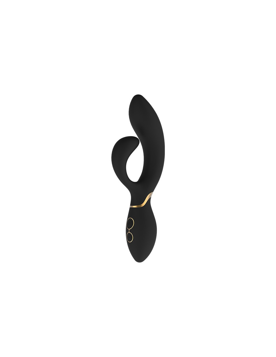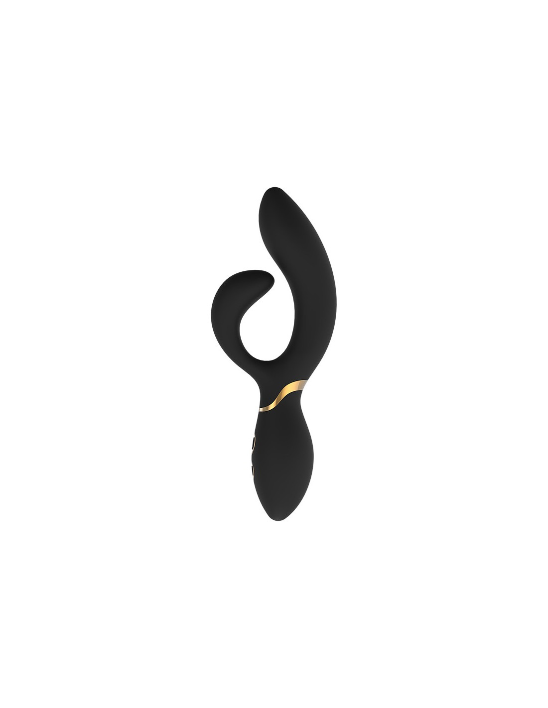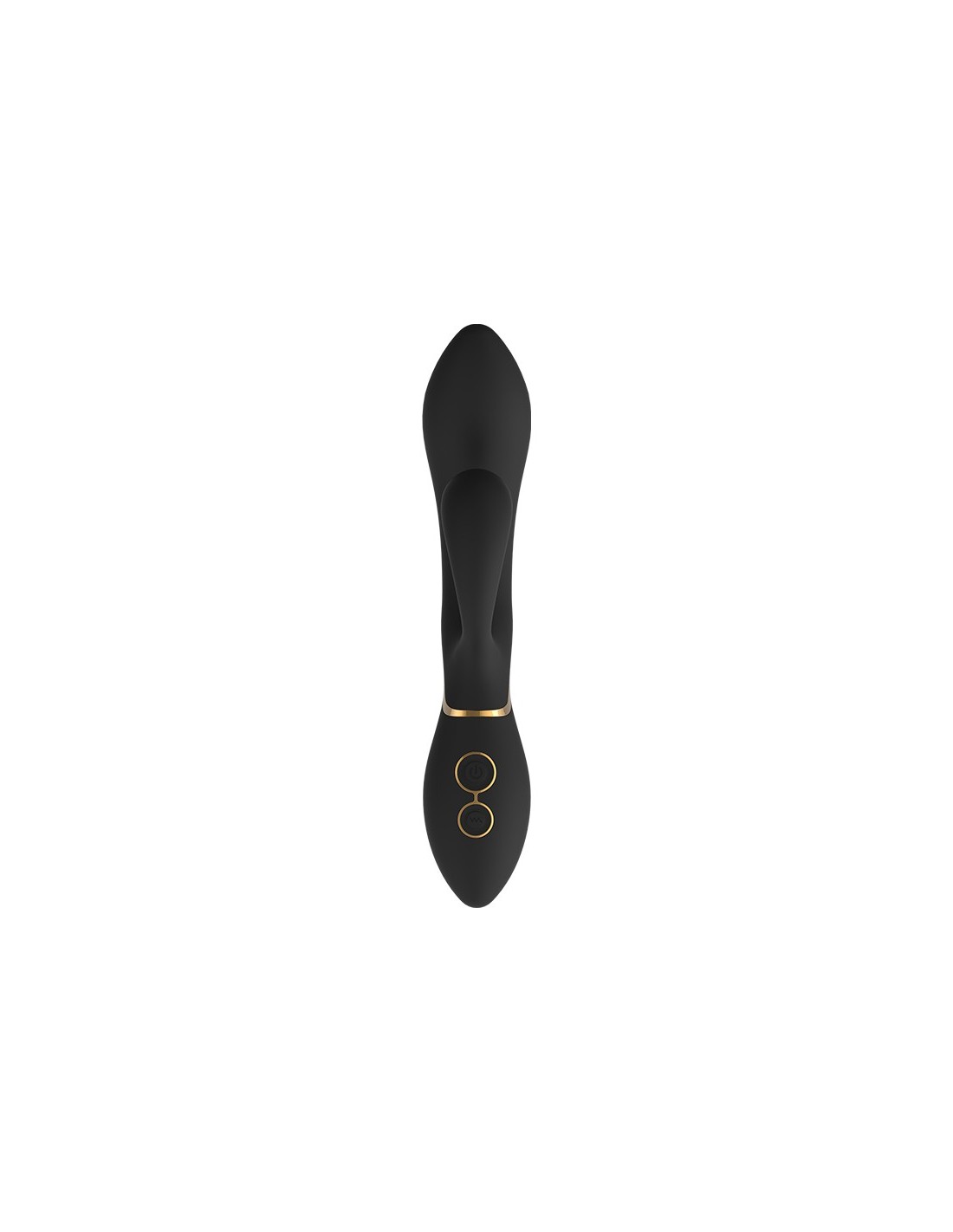 The Amélie vibrator from the Elite collection by Dream Toys is a black duo vibrator with stylish gold coloured accents and a rather big, flexible head. The two powerful motors are operated simultaneously and offer 7 strong and deep vibration patterns and 3 speeds. The rabbit is flexible and bendable. It can stay in the bent position. The Amélie vibrator is rechargeable with the included USB-pin cable. It is made of food grade silicone and ABS, IPX7 bathtub friendly and body safe, phthalate-free and latex-free. Operation can be done with 2 buttons at the base of the vibrator: the top button to turn the vibrator on/off, the lower button to shift vibration programs.