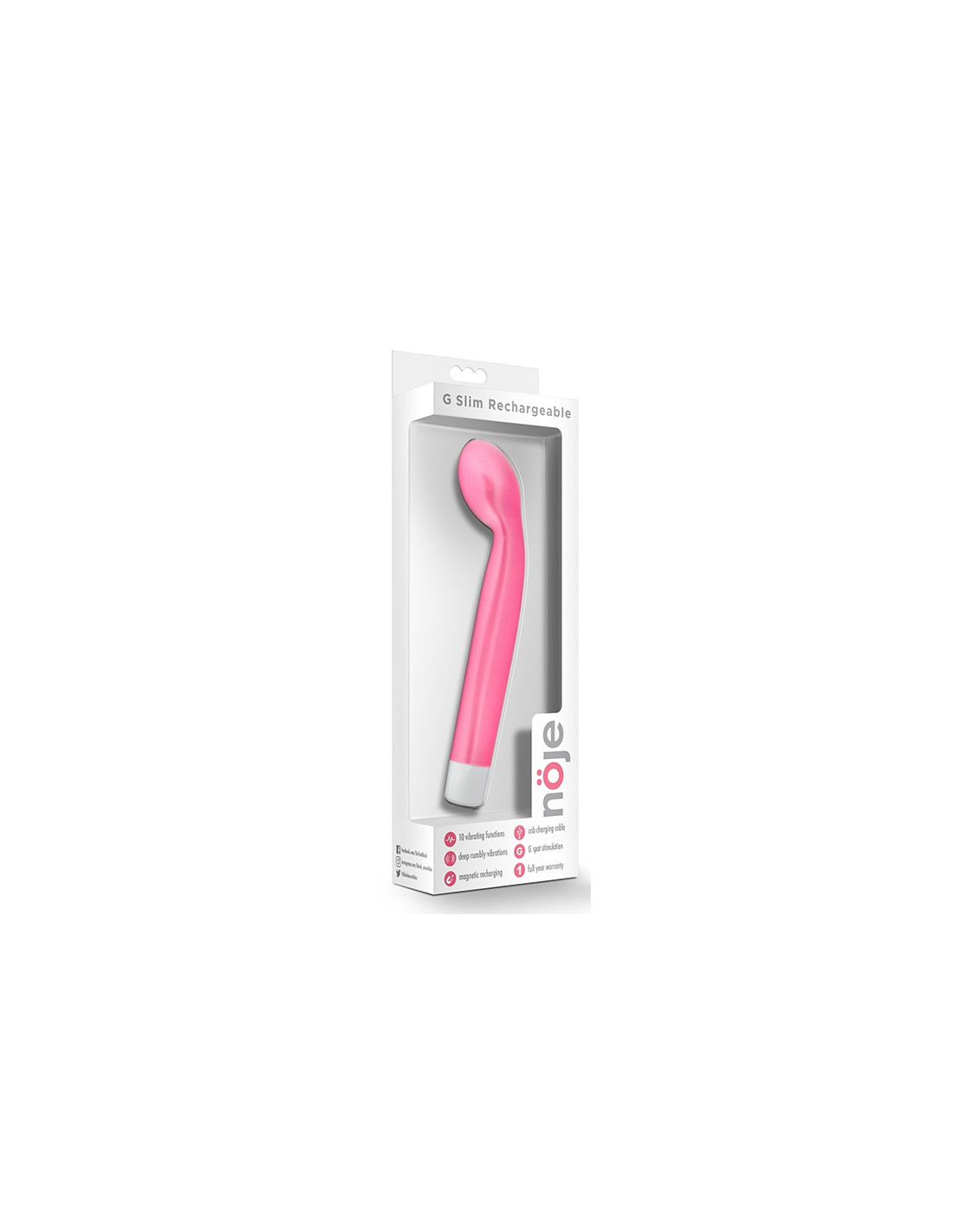 The elegant, powerful Noje G Slim is the perfect tool for internal G spot and external clitoral play. Point the curve towards your navel for deep, rumbly G spot pleasure. Explore the 10 vibrating functions. Two-way scrolling allows you to move forward and backwards as you find the function that you desire. The magnetic USB charging cable clicks on, and the light indicator tells you when your toy is fully charged and ready to play! Noje is the Swedish word for pleasure. The Noje G Slim lives up to its name.Variable 10 vibrating functions featuring 2 way scrollingDeep rumbly vibrationsG-spot stimulationWaterproof & easy to cleanRechargeable, USB magnetic recharging cable includedLength 8.25 inch / 20,9 cmInsertable length 7.25 inch / 18,4 cmWidth 1.5 inch / 3,8 cm