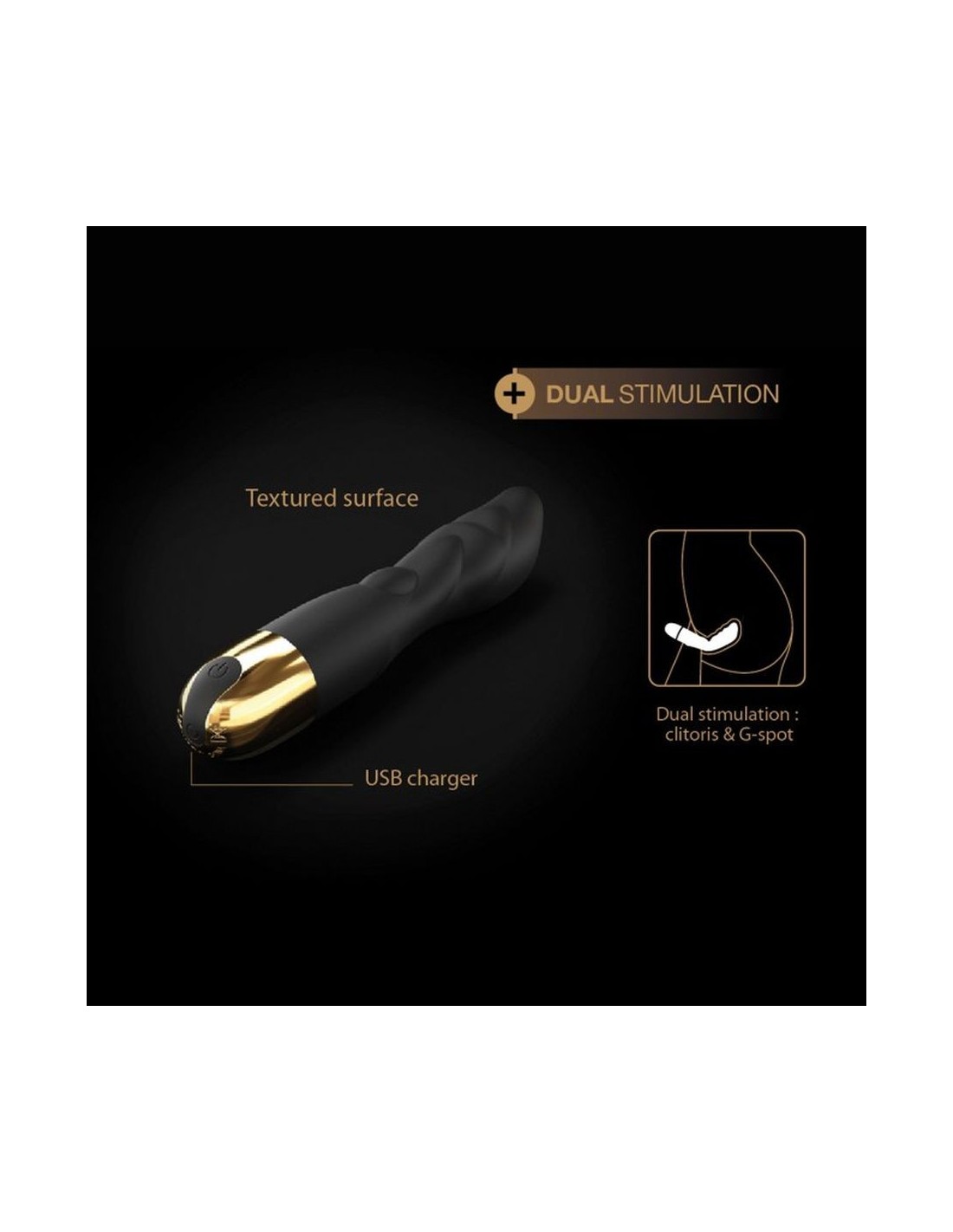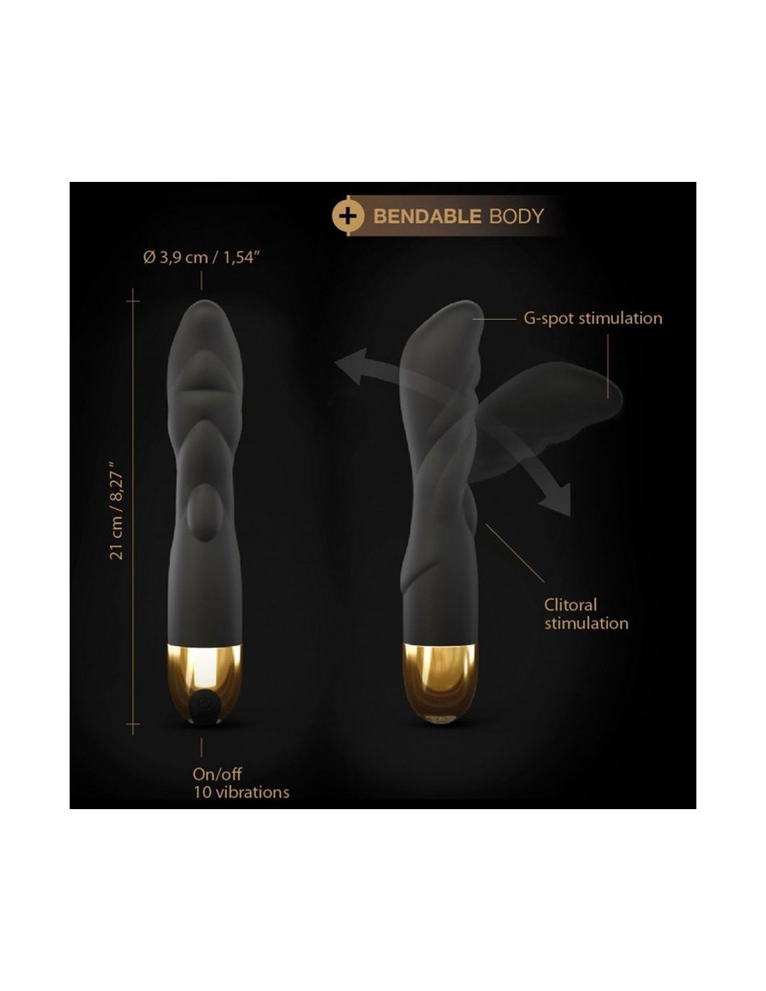 FLEXI & JOY: UN VIBRATORE FLESSIBILE AL TOP DELLA GAMMA Il vibratore Flexi & Joy è un sextoy progettato per stimolare il punto G. Con una finitura di alta gamma e con il suo colore oro e silicone in nero opaco. Tutte le donne lo apprezzeranno! Flexi & Joy ti offre una lunghezza di 21 cm ed è perfetto per stimolare il punto G ! La caratteristica principale di questo vibratore è che si piega al centro per un più facile accesso alle aree che più vi piacciono. È molto semplice, lo pieghi in modo che abbia la posizione ottimale per stimolare l'area di tua scelta, mantiene questa posizione fino a quando non la cambi e fornirà deliziose vibrazioni nell'area di destinazione. Con la sua lunghezza di 21 cm per 3,9 cm di diametro ti soddisferanno sicuramente! Tutte le donne saranno deliziate da questo fantastico vibratore per prendersi cura del proprio piacere! CHI PUO USE USARE IL VIBRATORE FLEXI & JOY? Tutte le donne possono usare questo vibratore! Le donne raffinate apprezzeranno i materiali di fascia alta utilizzati per progettare il sextoy. Le donne vaginali apprezzeranno l'efficacia del sextoy e il potere del suo motore di stimolare il punto G. Le donne esigenti apprezzeranno la possibilità di utilizzare questo vibratore in diverse posizioni, grazie a un collo morbido e flessibile. Questo stimolatore è versatile e si adatterà a tutte le donne e ai loro desideri! LE CARATTERISTICHE DI FLEXI & JOY Flexi & Joy è realizzato in silicone anallergico privo di ftalati per la massima sicurezza Ricaricabile tramite USB (tempo di ricarica 2H, tempo di funzionamento 1H30). Totalmente impermeabile, puoi giocare nella tua vasca o doccia per piaceri bagnati! Preferibile inoltre di utilizzare un lubrificante a base d'acqua! Dettagli - 21 cm di puro piacere - Shape Memory - 10 modalità di vibrazione e motore potente Informazioni aggiuntive - Lunghezza in cm 21 - Diametro in cm 3,9 - Utilizzo: G Spot - Tipo di batteria: Ricaricabile USB - Colore: Nero e finiture color oro - Impermeabile