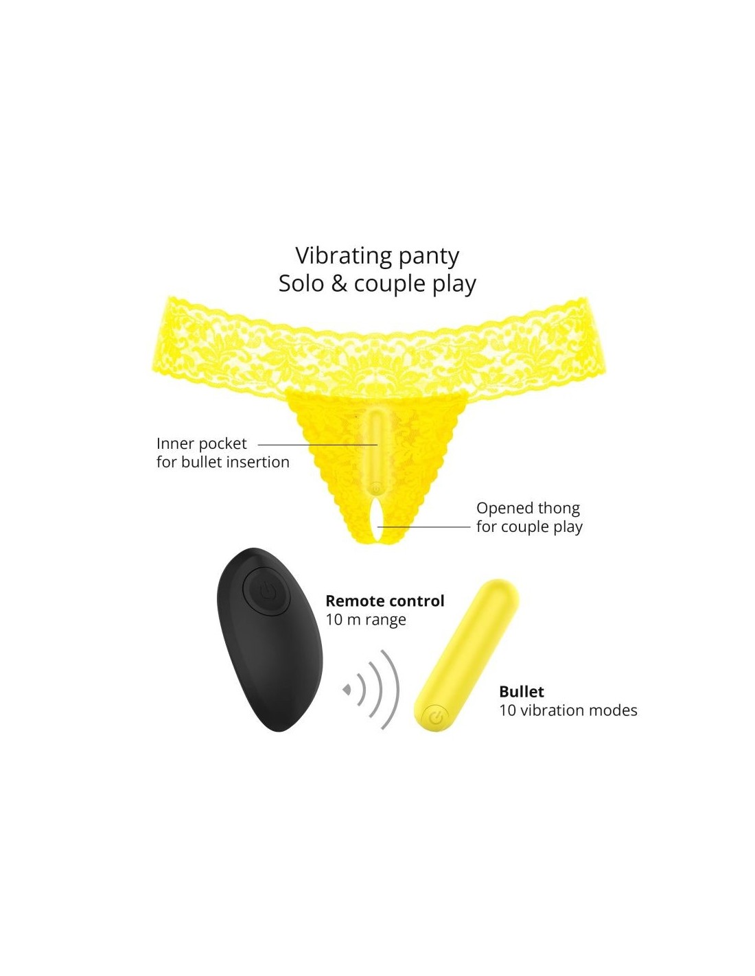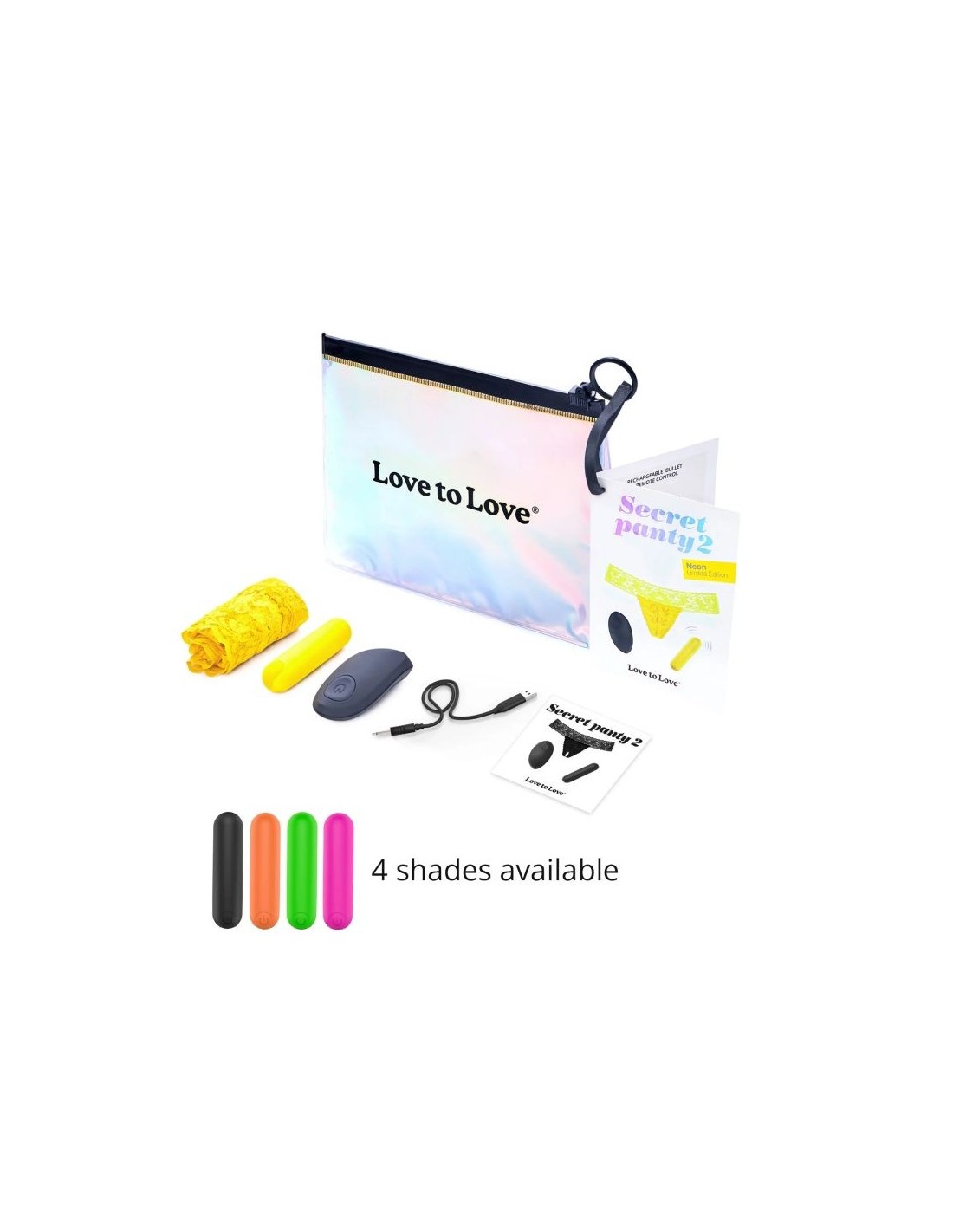 Non lasciarti ingannare dalle apparenze, questo elegante intimo in pizzo è pieno di piacevoli sorprese! Secret Panty 2 è dotato di un proiettile vibrante discreto ma potente. Prendi il controllo del joystick o lascia che il tuo partner prenda il comando. Divertiti con le 10 impostazioni di vibrazione per aumentare il piacere in ogni momento! Desideri un legame più profondo con il tuo partner? Scatena la tua immaginazione e ravviva la tua vita sessuale con un perizoma aperto! Una serata informale al ristorante o al cinema potrebbe prendere tutta un'altra piega! SPECIFICHE TECNICHE : Proiettile e telecomando: ABS / slip: poliammide (92%) ed elastan (8%) 10 modalità di vibrazione Telecomando: portata 7m Caricatore USB per proiettile e telecomando Tempo di ricarica: 1,5 ore/tempo di utilizzo: 1 ora Slip: taglia unica Impermeabile BENEFICI : Stimolatore clitorideo telecomandato Senti le potenti vibrazioni viaggiare nella tua mutandina Corda aperta per gioco di coppia Dai il potere al tuo partner Custodia inclusa Piacere vaginale e clitorideo Marca: Love to Love EAN13: 3700436032534 Materiale: ABS Dimensione confezione: 13 x 17 x 3 cm / 5,12 x 6,69 x 1,18 pollici Numero di vibrazioni 10 Dimensione senza confezione: 7,5 x 2 cm / 2,95 x 0,79 pollici Impermeabilità: IMPERMEABILE Tipo di alimentazione: CAVO USB Piaceri desiderati: stimolazione esterna Tipo di alimentazione: Ricaricabile Tessuti: Silicone - ABS Peso 0,11 kg