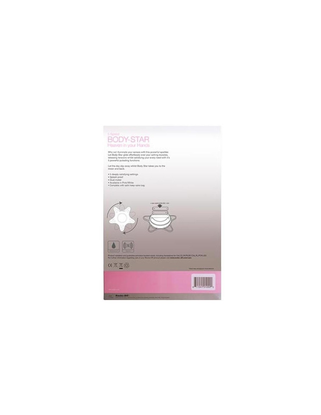 Il cielo nelle tue mani... Perché non provi ad illuminarti i sensi con questa potente stella magica. Lascia che la stella Body-Star scivoli senza fatica sopra i tuoi muscoli dolenti e che rilasci le tensioni soddisfacendo ogni tua necessità con le sue 5 forti funzioni pulsanti. Dimensioni: 100mm x 96mm x 33mm Quantità batterie: 2 Tipo di batteria: 1.5V AAA Colore: Bianco / Rosa Impermeabile: Si Velocità: 5 Materiale: ABS con rivestimento in PU