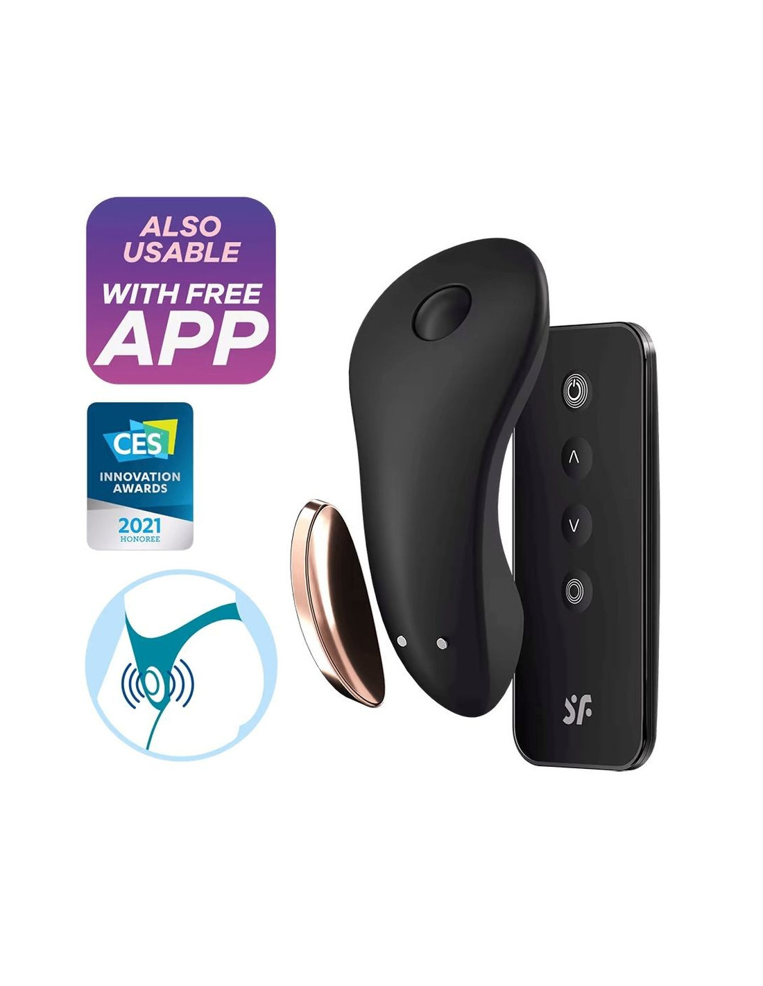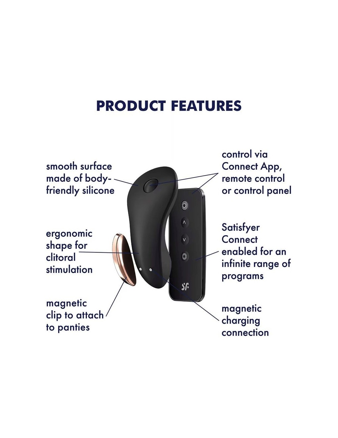 Grazie al pratico magnete, il Little Secret può essere comodamente attaccato allo slip e stimola discretamente il clitoride con potenti vibrazioni. Questo prodotto, realizzato in silicone, può essere controllato tramite l'applicazione e il telecomando incluso. - Compatibile con l'app gratuita Satisfyer, disponibile su iOS e Android - Il potente motore trasmette intensi ritmi di vibrazione in tutto il giocattolo - Realizzato in silicone morbidissimo di alta qualità che trasmette potenti vibrazioni in modo intensivo Vibrazioni profonde e superpotenti Silicone dermocompatibile Impermeabile (IPX7) Utilizzo possibile anche senza App Programmi pre-impostati modificabili Infinita varietà di programmi con la App Modalità sussurro Batteria agli ioni di litio Cavo di ricarica magnetico USB incluso Facile da pulire Satisfyer Little Secret: vibratore per slip con telecomando e controllo da remoto tramite applicazione Il Little Secret di Satisfyer è un vero eroe di tutti i giorni: questo vibratore clitorideo si fissa alle mutandine tramite una clip magnetica ed è quindi ideale per una sensuale stimolazione in movimento. Il vibratore per slip ha una veste nobile di color nero con dettagli dorati e grazie alla sua forma ergonomica poggia direttamente sul clitoride. Offrendo vibrazioni potenti ma silenziose, il Little Secret è assolutamente discreto. Inoltre, colpisce per una superficie morbida e piacevole al tatto realizzata in silicone delicato sulla pelle. Poche gocce di lubrificante basteranno a garantire un'esperienza liscia come l’olio. Anche in presenza d’acqua come sotto la doccia o nella vasca da bagno, il divertimento con il Little Secret non si ferma grazie alla lavorazione impermeabile (IPX7). Divertimento versatile con il Little Secret, grazie a un controllo tramite applicazione innovativo Il Satisfyer Little Secret può essere controllato sia con il telecomando incluso sia con l'applicazione gratuita Satisfyer Connect, disponibile per dispositivi Apple e Android. Potrai usare il Little Secret con discrezione nella vita di tutti i giorni o passare le redini alla tua dolce metà. Inoltre, con l'applicazione Satisfyer Connect puoi esplorare nuovi mondi di piacere: crea i tuoi programmi di vibrazione in base a rumori ambientali o alla tua playlist preferita. Il Little Secret è dotato di batterie ricaricabili che possono essere facilmente ricaricate con il cavetto di ricarica USB incluso. Caratteristiche Adatto per: Donne Lunghezza: 85,7 mm Peso: 53,5 g Larghezza: 39 mm Altezza: 30,4 mm Con vibrazione: Sì Stimolazione: Clitoridea Materiale: Resina ABS , Silicone Compatibilità dell'app Satisfyer Connect: Sì