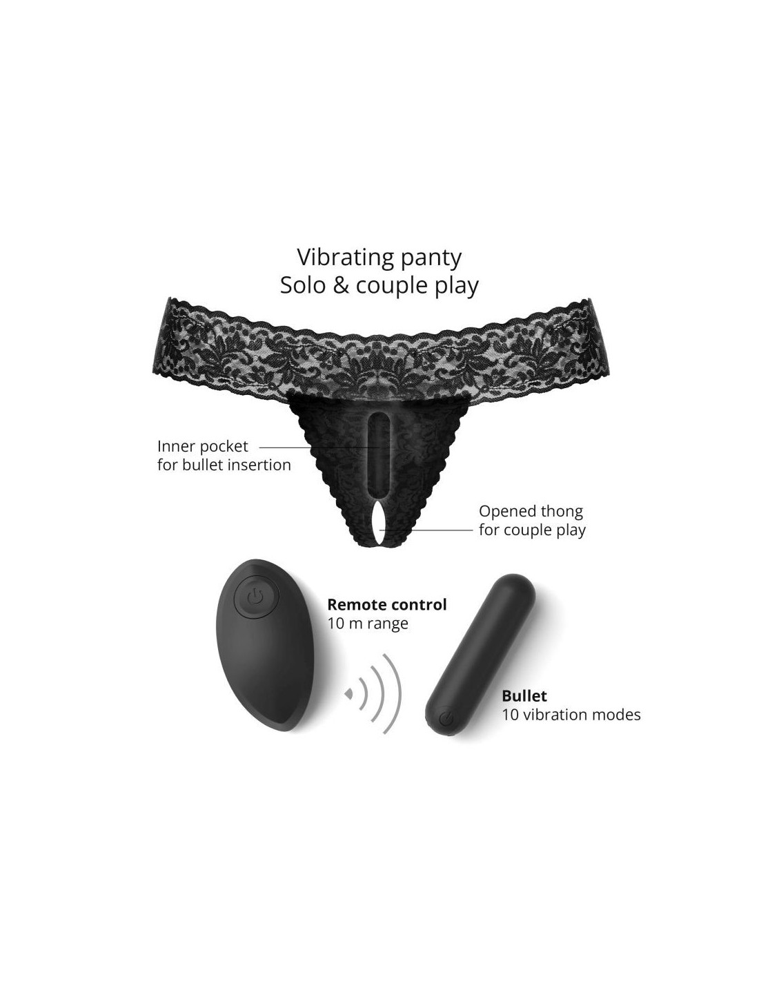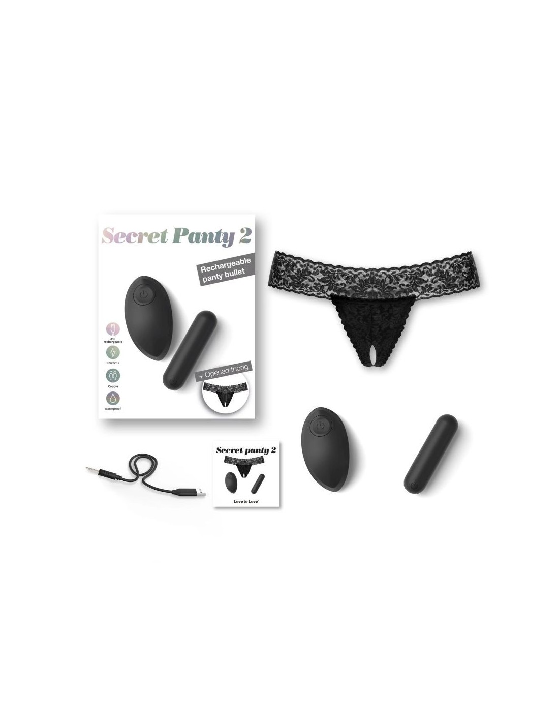 Intensifica l'intimità della coppia con Secret Panty 2! Stimolatore clitorideo controllato a distanza, potrai azionarlo in luoghi insoliti, ristoranti, cinema, o altro, o come idea regalo sorprendente per il tuo partner Ricaricabile e due volte più potente, questo perizoma sexy ha una piccola tasca segreta, posizionata sulla zona clitoridea, dove potrai inserire il vibratore e azionarlo a distanza, e con discrezione, tramite il telecomando. Caratteristiche: - 10 modalità di vibrazione. - Vibratore in materiale ABS - Slip in materiale poliammide ed elastan - Telecomando - portata: 10m. - Dimensioni: 7,5 x 2 cm. - Slip, mutandine: adatte a tutte le dimensioni. - Impermeabile. - Ricaricabile (cavo USB incluso)