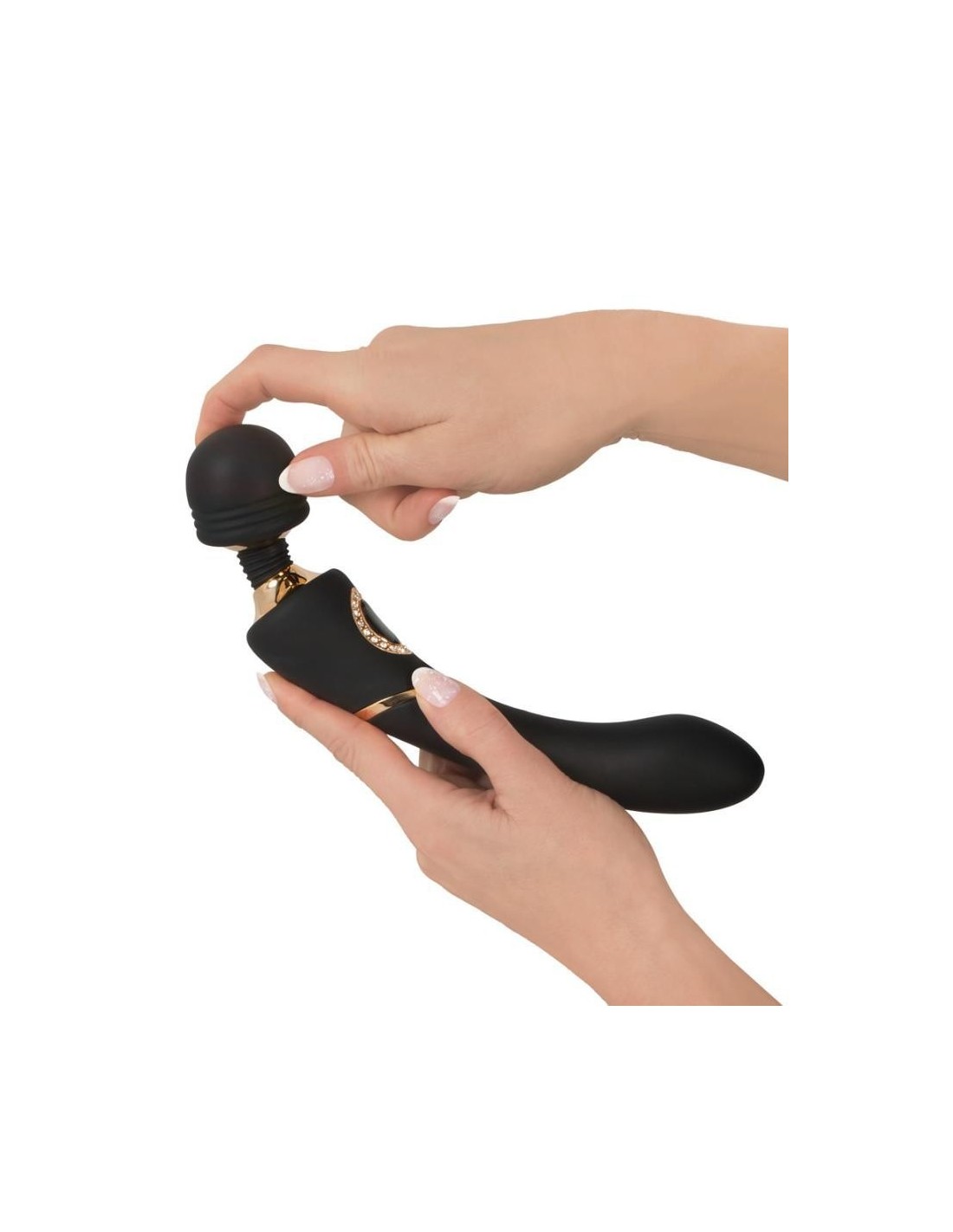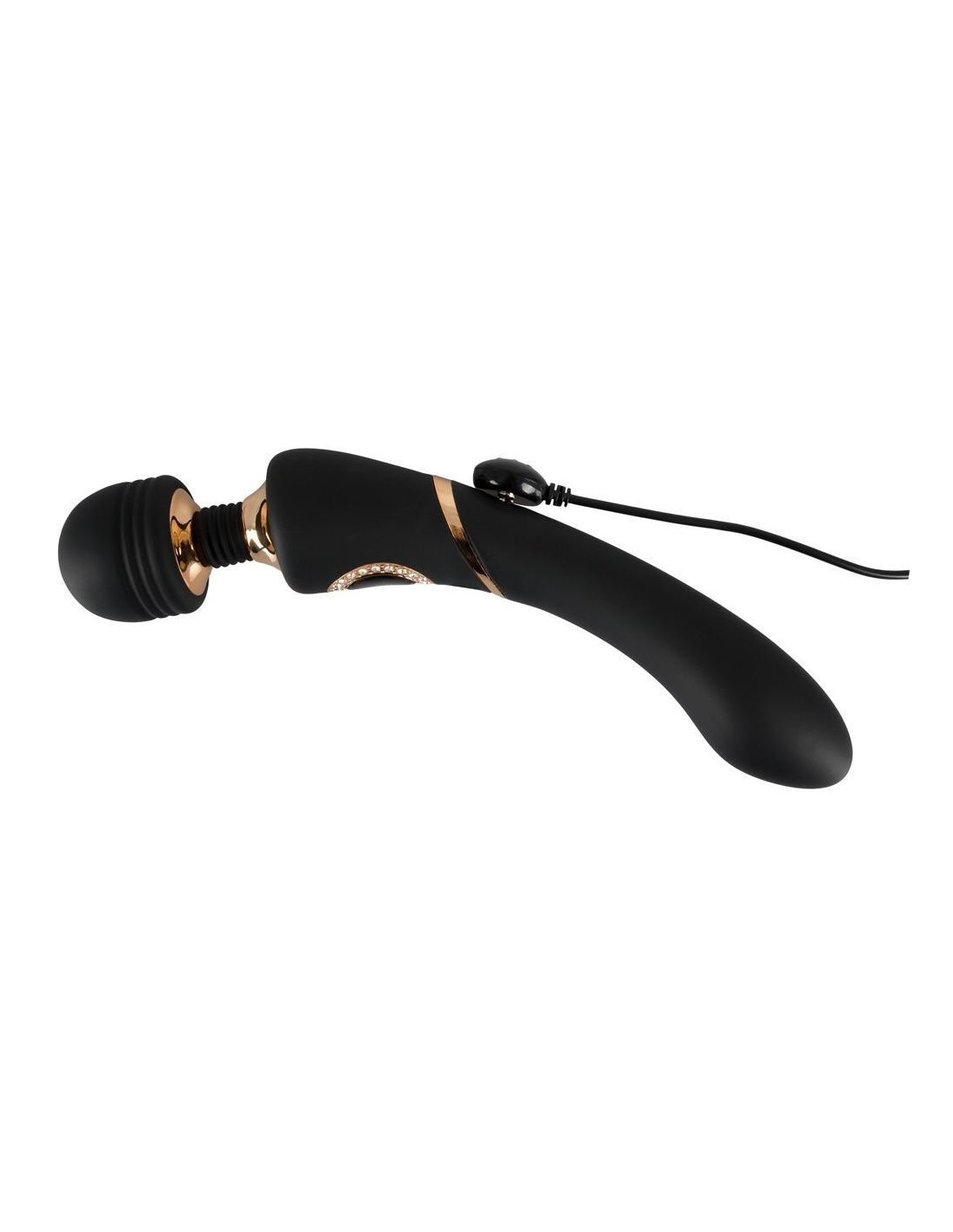 Bacchetta per massaggi idealmente ricurva con testa sferica mobile e collo flessibile. 10 modalità di vibrazione. Per un massaggio di classe con gemme decorative e pulsante in un elegante look a specchio. Il manico può essere utilizzato anche come dildo. Cavo di ricarica USB incluso.