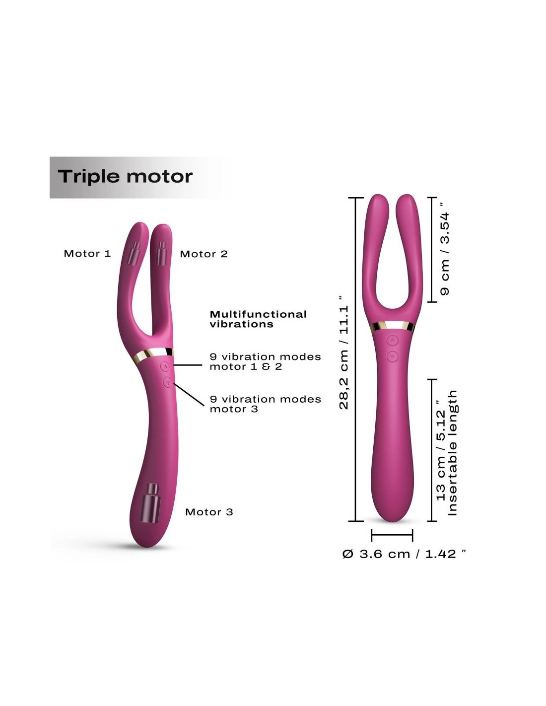 L'estasi a portata di mano! INFINITE JOY è stato progettato per sedurre gli avventurieri alla ricerca di un piacere senza fine. I suoi bracci flessibili a 360° consentono innumerevoli stimolazioni: clitoride, capezzoli, vagina e persino pene, tutto è possibile. I suoi 3 motori con vibrazioni multifunzionali ti offrono un'avventura in regni precedentemente inesplorati! Apri la strada a nuovi orizzonti di gioia, perché l'estasi non ha limiti! BENEFICI : Bracci pieghevoli a 360° Triplo motore Gioco multiplo Stimolatore esterno: clitoride e capezzoli Vibratore: vagina Masturbatore: pene INFORMAZIONI TECNICHE: Dimensione : 28,2 x 5,2 x 3,6 cm / 11,1 x 2,05 x 1,42 pollici Lunghezza inseribile: 13 cm / 5,12 pollici Batteria al litio Tempo di ricarica: 90 minuti Durata : 50 - 100 min Livello sonoro: 45 db USB ricaricabile (cavo incluso) Impermeabile IPX7