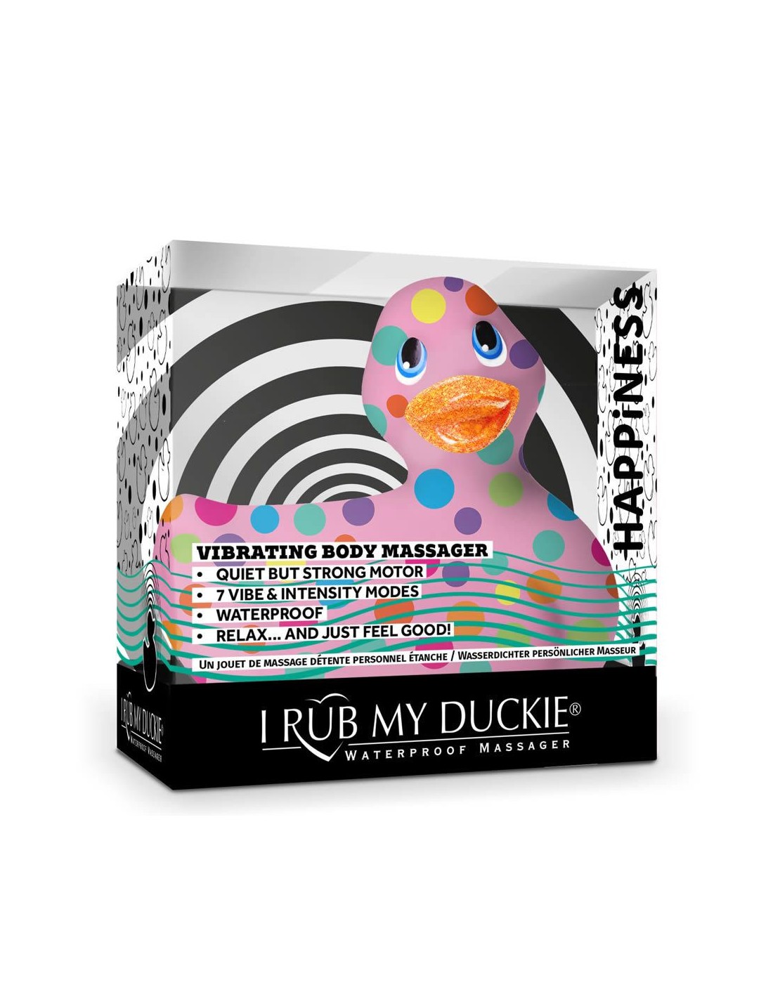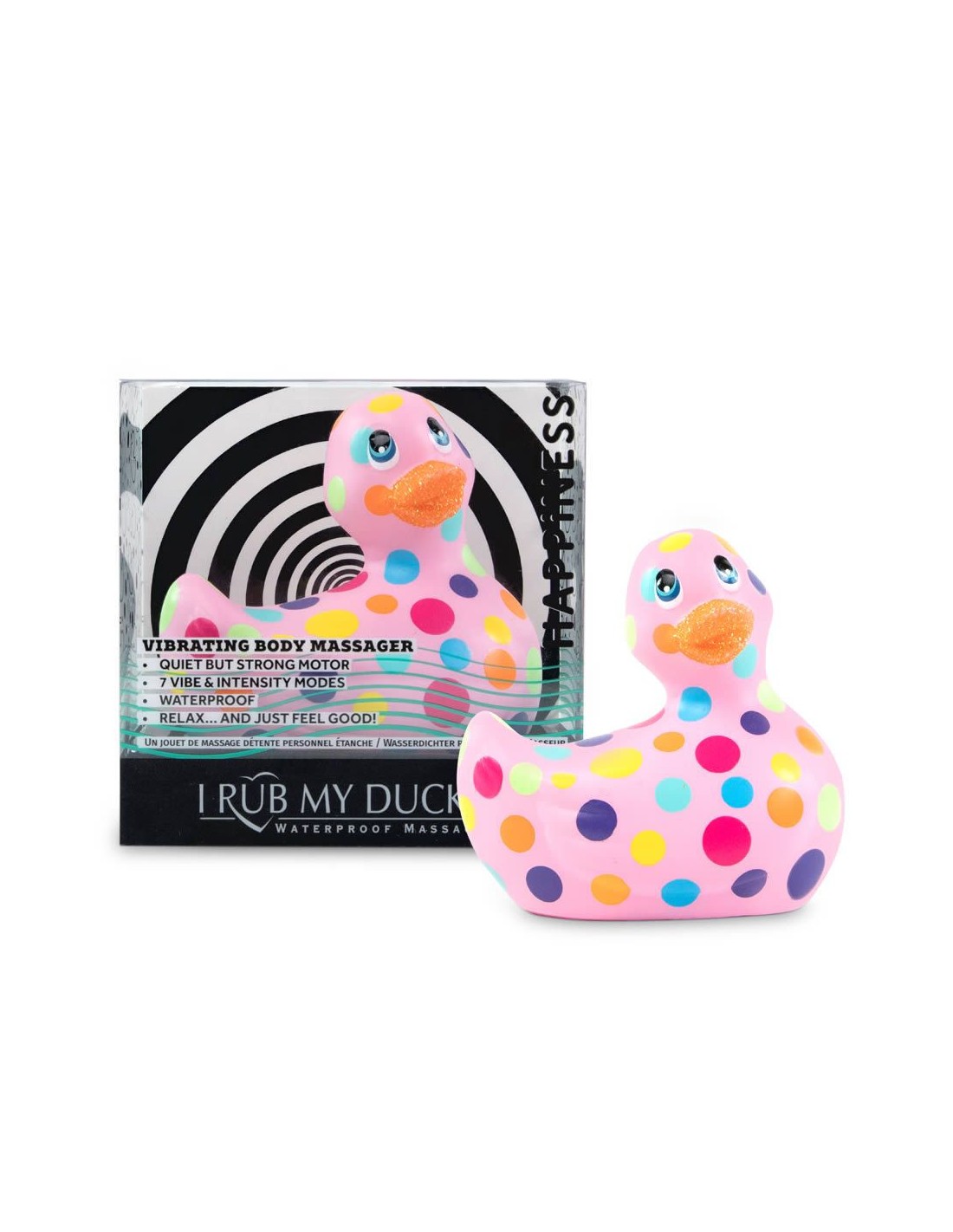 Splendida Duckie 2.0, colore rosa e piccoli disegni a forma circolare (pallini) multicolore, la collezione I Rub My Duckie 2.0 ti porta nella città dell'amore. Le potenti vibrazioni di questo massaggiatore sono un piacere per il tuo corpo e ti doneranno una sensazione di rilassamento. Potrai utilizzarla anche sotto la doccia o nella vasca da bagno, la papera vibrante Duckie 2.0 è impermeabile.