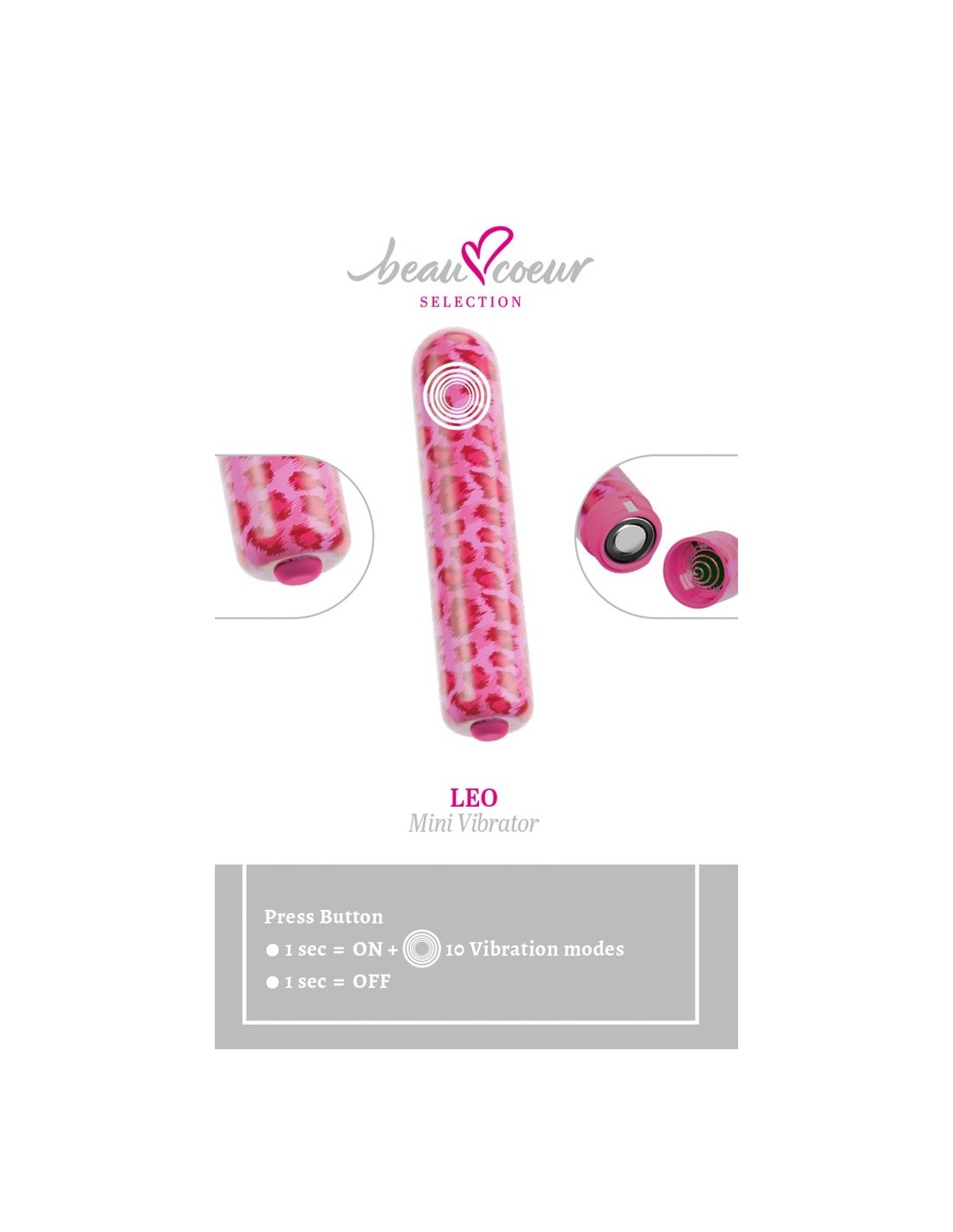 Mini vibratore LEO di beau cœur dal design leopardato di tendenza. Elegante, poco appariscente e molto discreto in ogni borsa o sul comodino. Sempre pronto per i giochi intimi. Ideale per avventure spontanee, da soli o in coppia! Questo piccolo e sfacciato concentrato di energia vi sorprenderà con 10 modalità di vibrazione intense e versatili. Semplice e comodo, basta premere un pulsante.