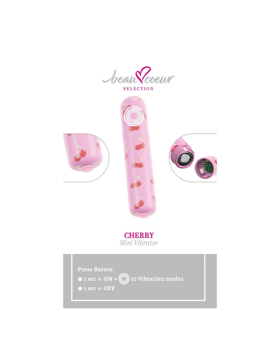 Mini vibratore giocoso CHERRY di beau cœur con un design alla moda a forma di ciliegia. Elegante, poco appariscente e molto discreto in ogni borsa o sul comodino. Sempre pronto per i giochi intimi. Ideale per avventure spontanee, da soli o in coppia! Questo piccolo e sfacciato concentrato di energia vi sorprenderà con 10 modalità di vibrazione intense e versatili. Semplice e comodo, basta premere un pulsante.
