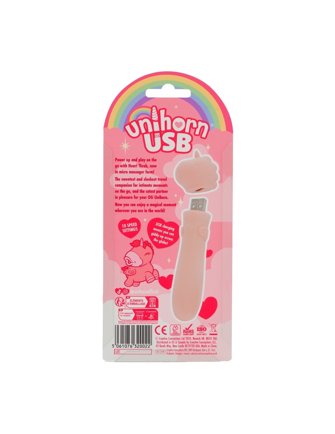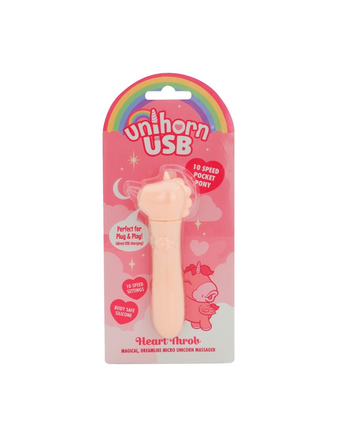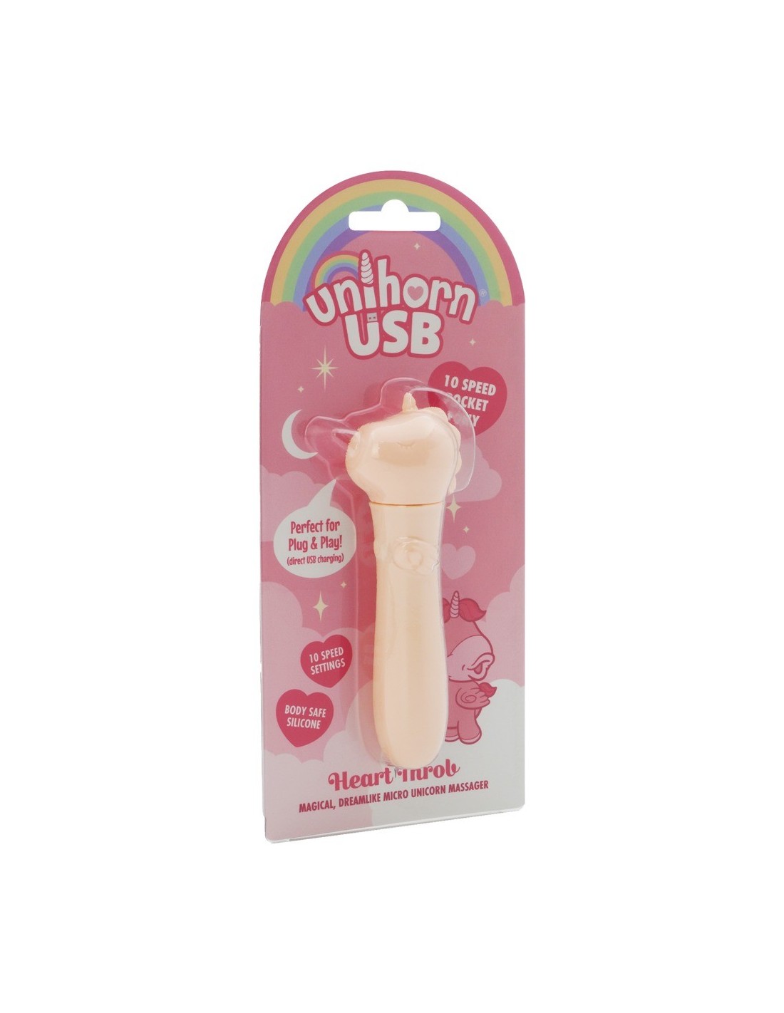 Incantevole mini vibratore USB Heart Throb di Unihorn con un simpatico design a unicorno. Con una vibrazione extra potente che può essere comodamente controllata in 10 modalità diverse con la semplice pressione di un pulsante. Piccolo, facile da impugnare, maneggevole e dotato di una texture in silicone supermorbida per il massimo comfort delle coccole. Sempre con voi, pronto all'uso e ricaricabile: La presa USB si trova direttamente sotto la testa! Un giocattolo magico per un gioco versatile - da soli, in coppia, a casa, in viaggio e in qualsiasi momento.