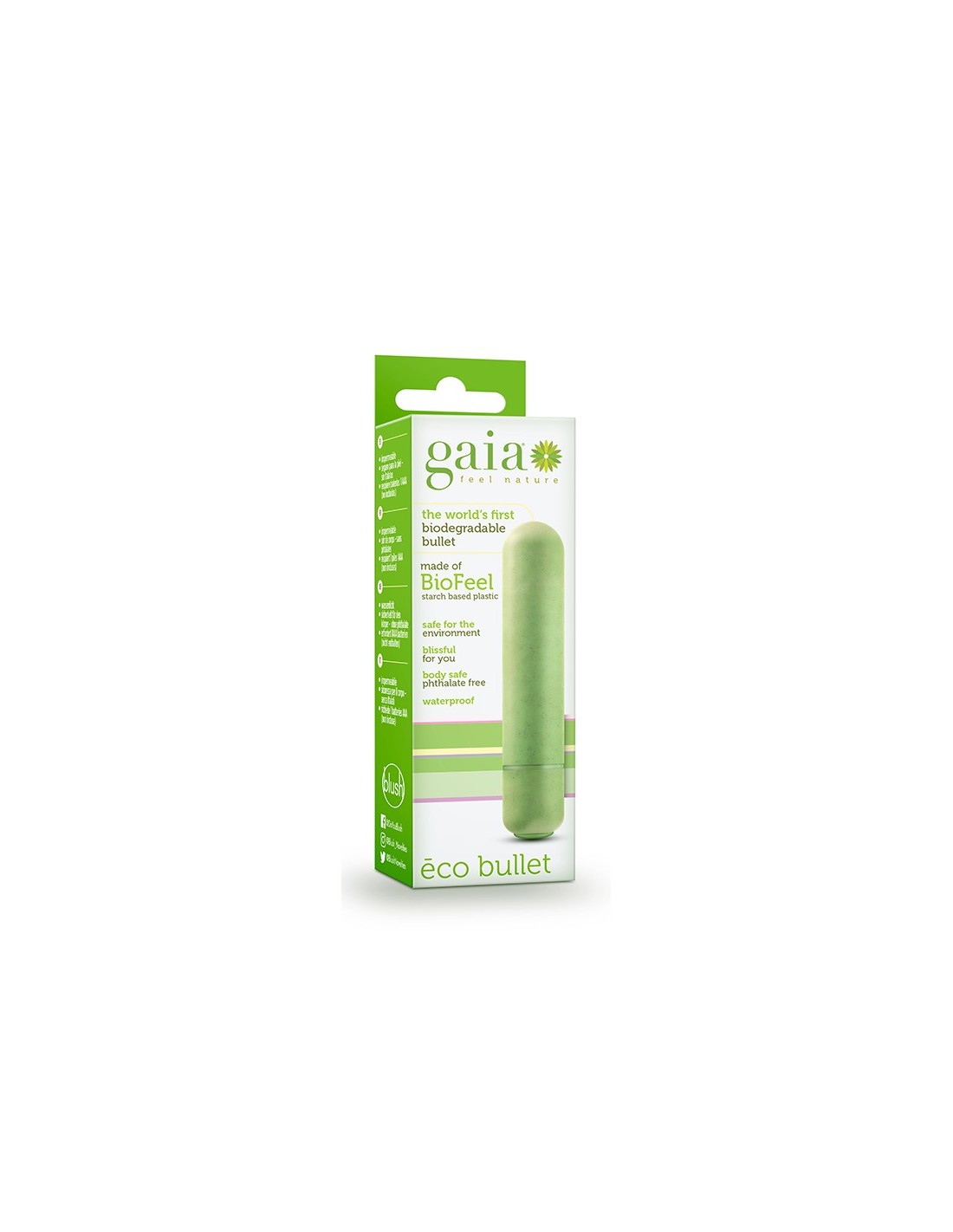 Gaia is the first collection of sustainable made vibrators, made of Blush’s proprietary materials BioFeelTM, a non-petroleum plant-based bioplastic, a polymer compound mixed with plant-based material, and BioTouchTM, a natural rubber material with great high tensile strength and tear resistance for long-lasting durability. The non-petroleum-based materials such as natural rubber and bioplastic are a far better choice for the environment than synthetic rubber or plastic. Additionally, these materials are mindfully sourced from sustainable and responsible farmers.