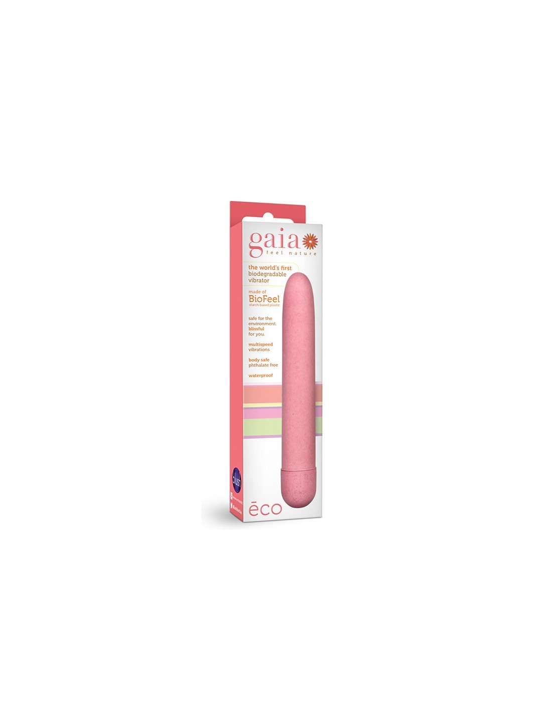 Gaia is the first collection of sustainable made vibrators, made of Blush’s proprietary materials BioFeelTM, a non-petroleum plant-based bioplastic, a polymer compound mixed with plant-based material, and BioTouchTM, a natural rubber material with great high tensile strength and tear resistance for long-lasting durability. The non-petroleum-based materials such as natural rubber and bioplastic are a far better choice for the environment than synthetic rubber or plastic. Additionally, these materials are mindfully sourced from sustainable and responsible farmers.