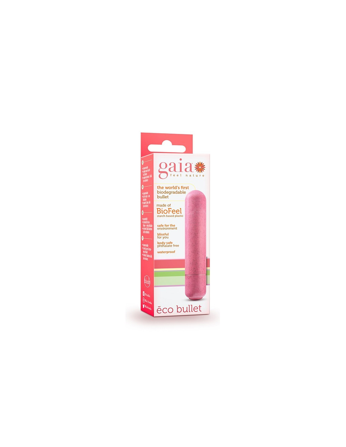 This pleasure-packed petite vibe is crafted from Biofeel, a plant-based material. Enjoy quiet, powerful one speed vibrations controlled with an easy push button. You’ll love the power of this smooth bullet and take comfort knowing that Gaia Eco Bullet uses less energy and creates less greenhouse gas emission than any other sex toy on the market! This adorable vibe is available in three colors. It's waterproof, fun in the tub, and easy to clean. ,Requires 1 AAA battery.